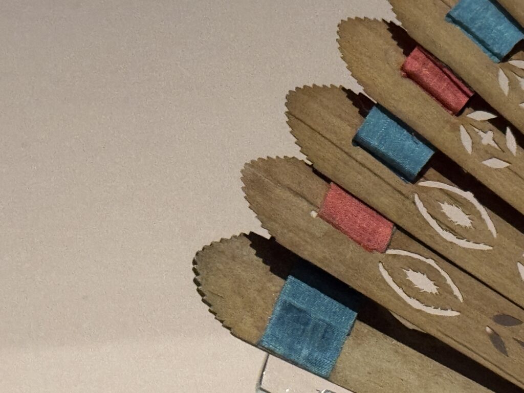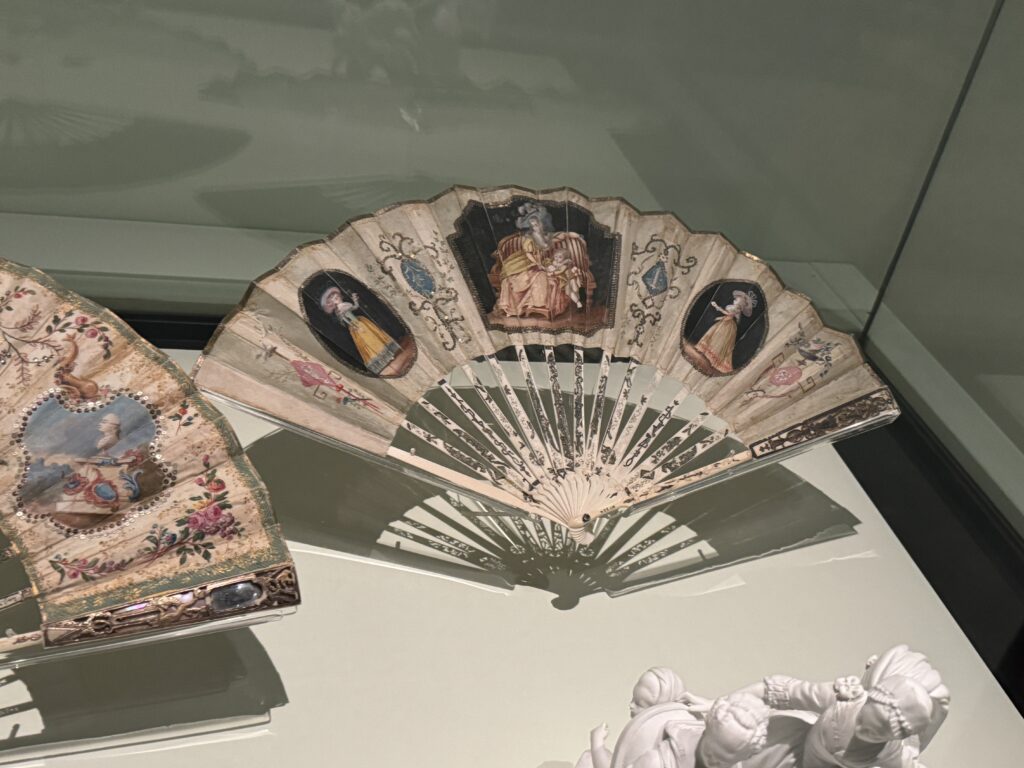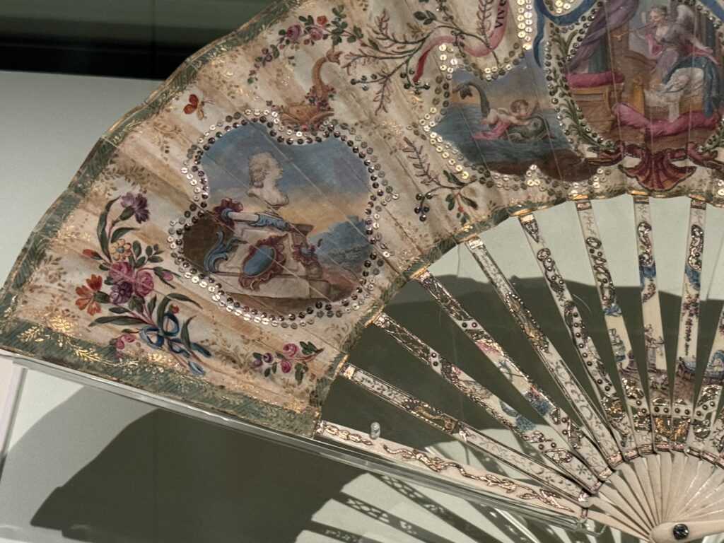 Веер с матерью и сыном. Производитель неизвестен. Примерно 1780-1789 гг. Слоновая кость, расписной шелк, блестки. Франция. Музей Виктории и Альберта: T.374-1910. Передано в дар капитаном Х. Б. Мюрреем.»