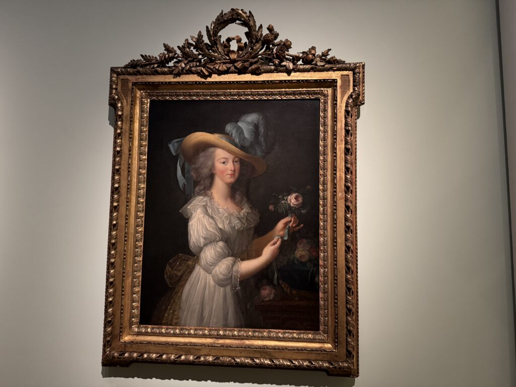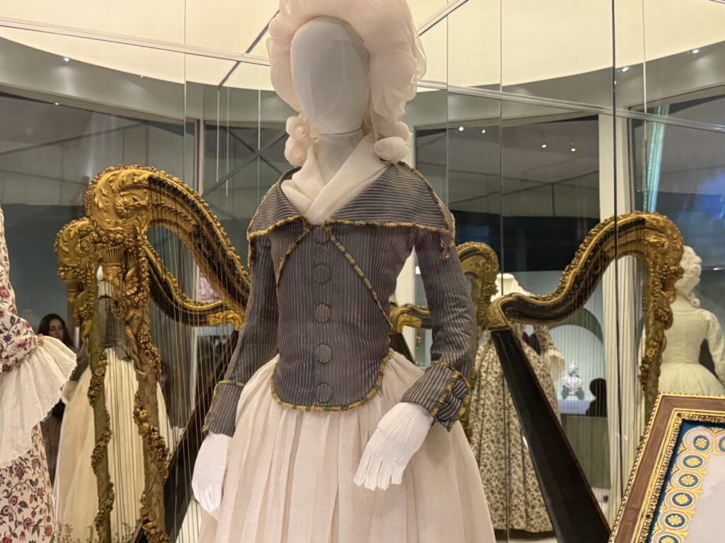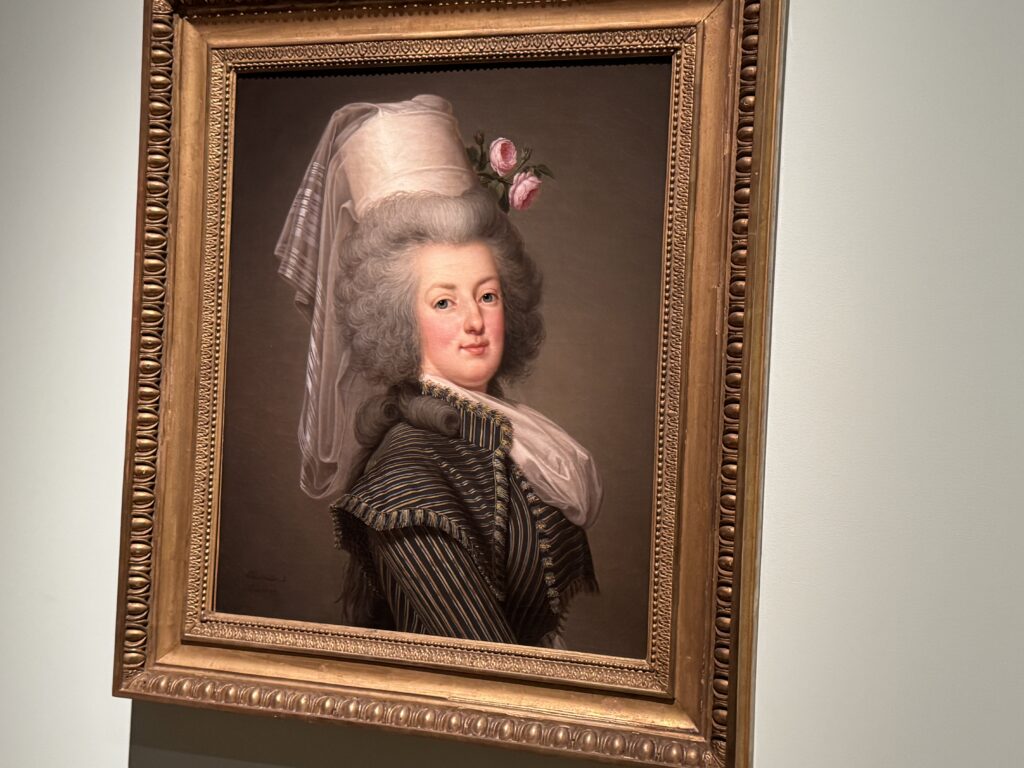 «Мария-Антуанетта. Адольф-Ульрик Вертмюллер, 1788. Мария-Антуанетта одета в редингот (приталенное платье) или пьеро (жакет) самой последней моды из полосатой шелковой тафты с бахромой, очень похожий на выставленный рядом пьеро. По иронии судьбы, этот тип полосатого шелка также был ключевым элементом революционного стиля, который носили Робеспьер и другие. Ее белая шелковая шляпа, задрапированная вуалью, иногда описывается как «креольская», отсылая к стилям, распространенным в Сан-Доминго (ныне Гаити), но она больше напоминает феску или турецкую шляпу, что указывает на влияние Ближнего Востока.