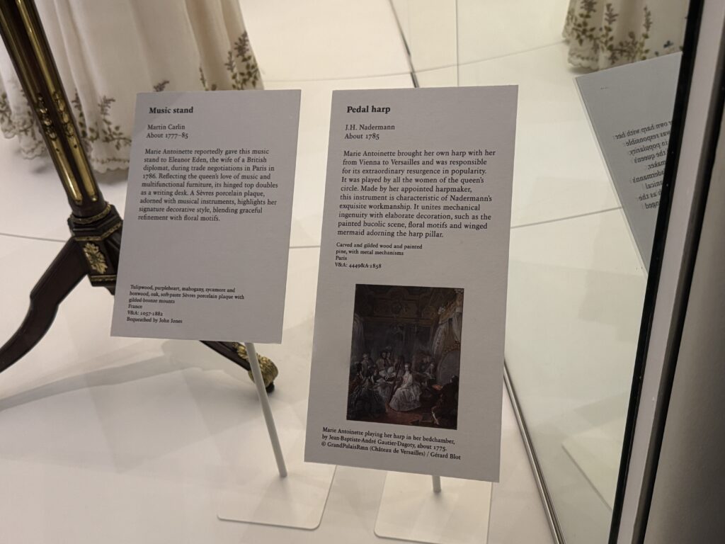 «Пюпитр. Мартин Карлин. Примерно 1777-1785 годы. Сообщается, что Мария-Антуанетта подарила этот пюпитр Элеоноре Иден, жене британского дипломата, во время торговых переговоров в Париже в 1786 году. Отражая любовь королевы к музыке и многофункциональной мебели, его откидная столешница служит одновременно и письменным столом. Фарфоровая пластина из Севра, украшенная музыкальными инструментами, подчеркивает ее фирменный декоративный стиль, сочетающий изящную утонченность с цветочными мотивами.