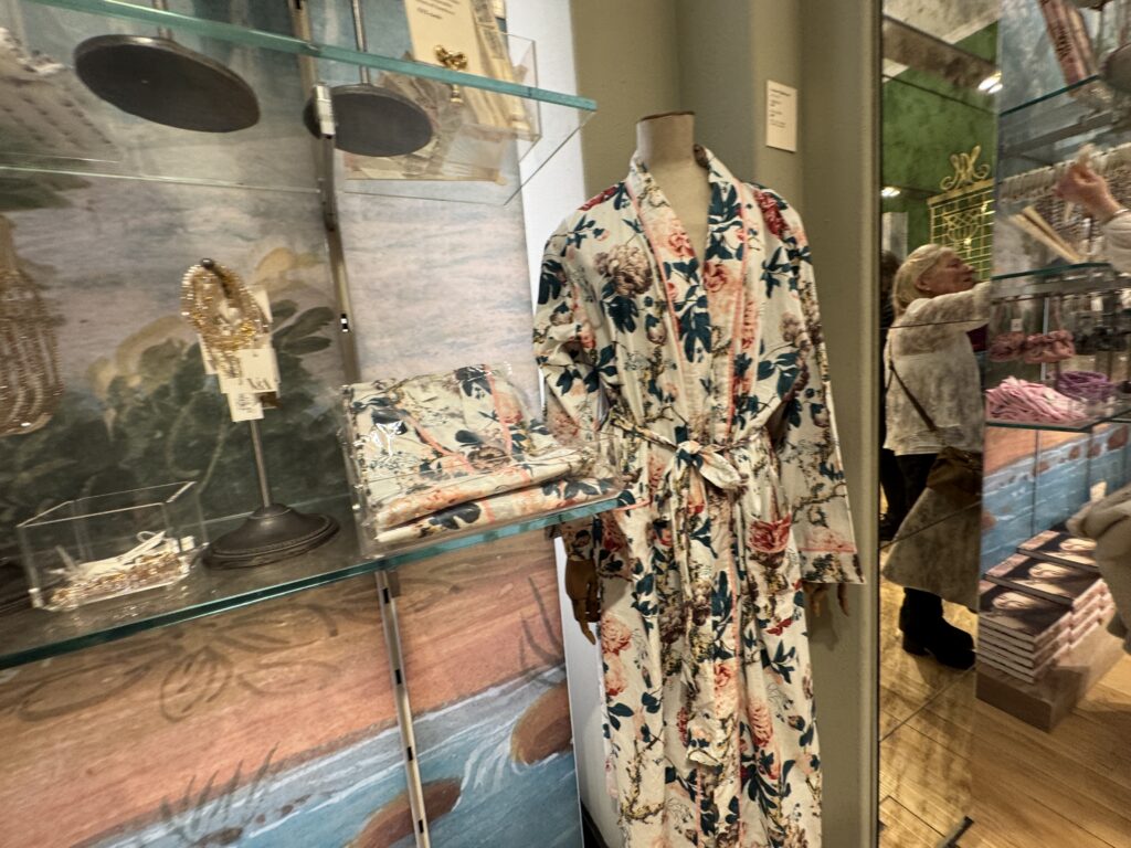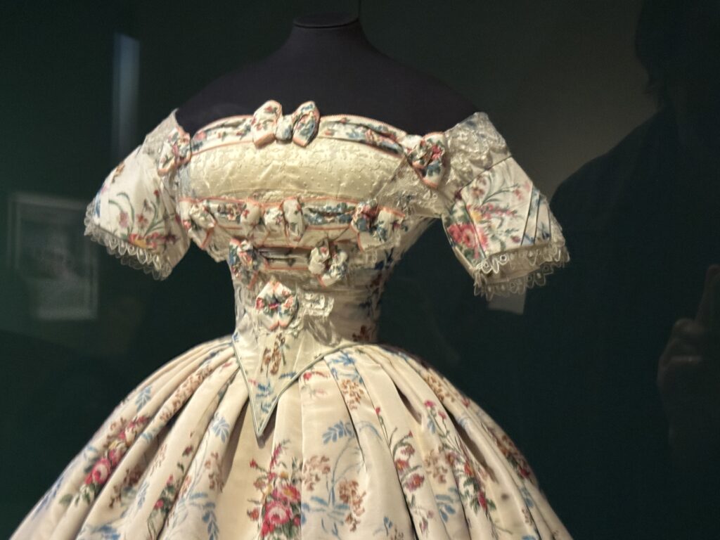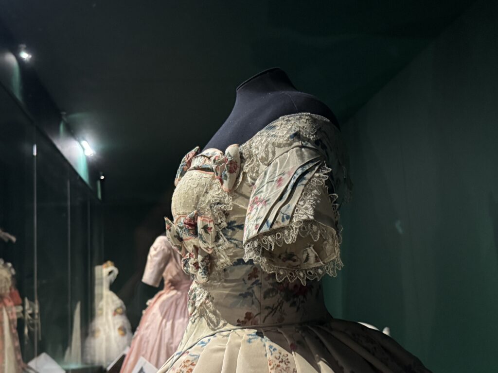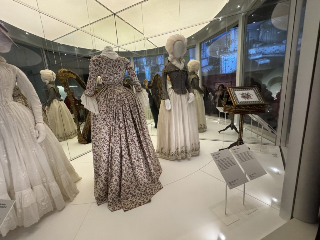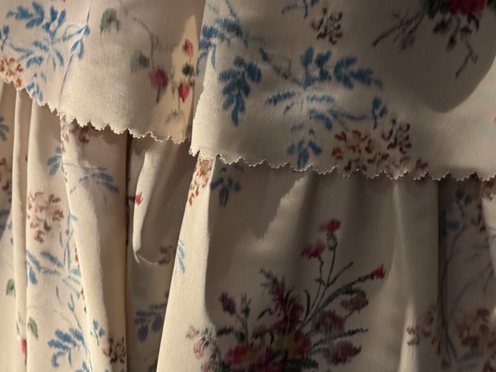 Это платье в английском стиле с цветочным принтом сшито из персе — разновидности хлопчатобумажной ткани с цветочным рисунком высочайшего качества, часто с глянцевой поверхностью, — производства известной фабрики Оберкампф в Жуи. Мария-Антуанетта владела похожими платьями из персе и использовала их также в своих личных интерьерах. Ее предпочтение этой современной ткани отражало ее любовь к непринужденным, модным стилям в противовес формальной придворной одежде.