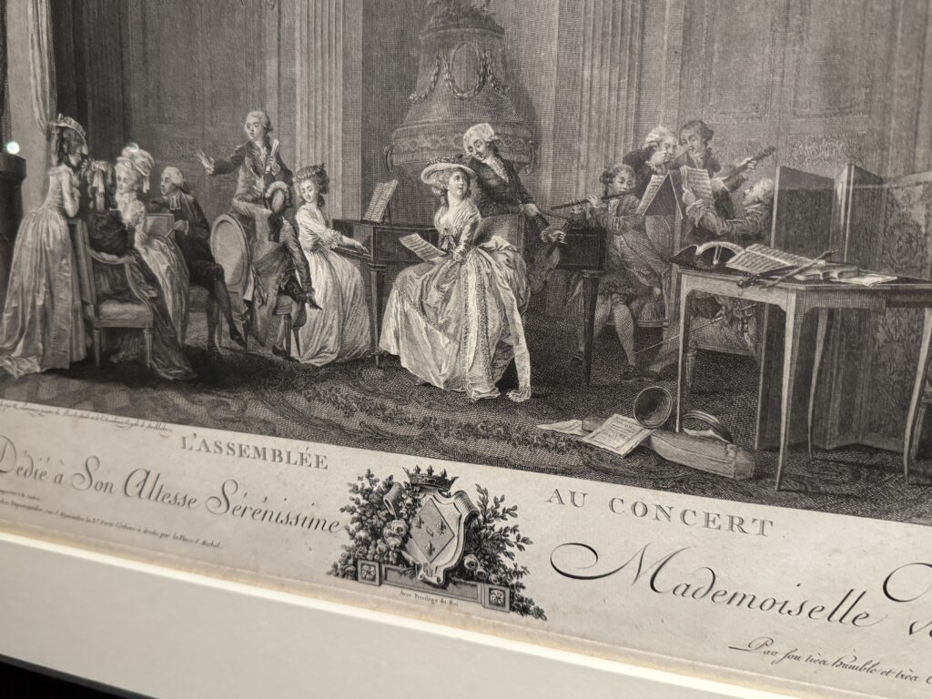 При Марии-Антуанетте стала популярна новая форма светских и неформальных музыкальных выступлений, получившая название салон-концерт. Аристократы и придворные устраивали представления в своих частных резиденциях, чтобы продемонстрировать свои таланты и продвинуть новых артистов и композиторов. Все представленные здесь фигуры — члены двора Марии-Антуанетты, включая хозяйку, мадемуазель де Конде, которая поет, и принцессу де Ламбаль, играющую на клавесине.