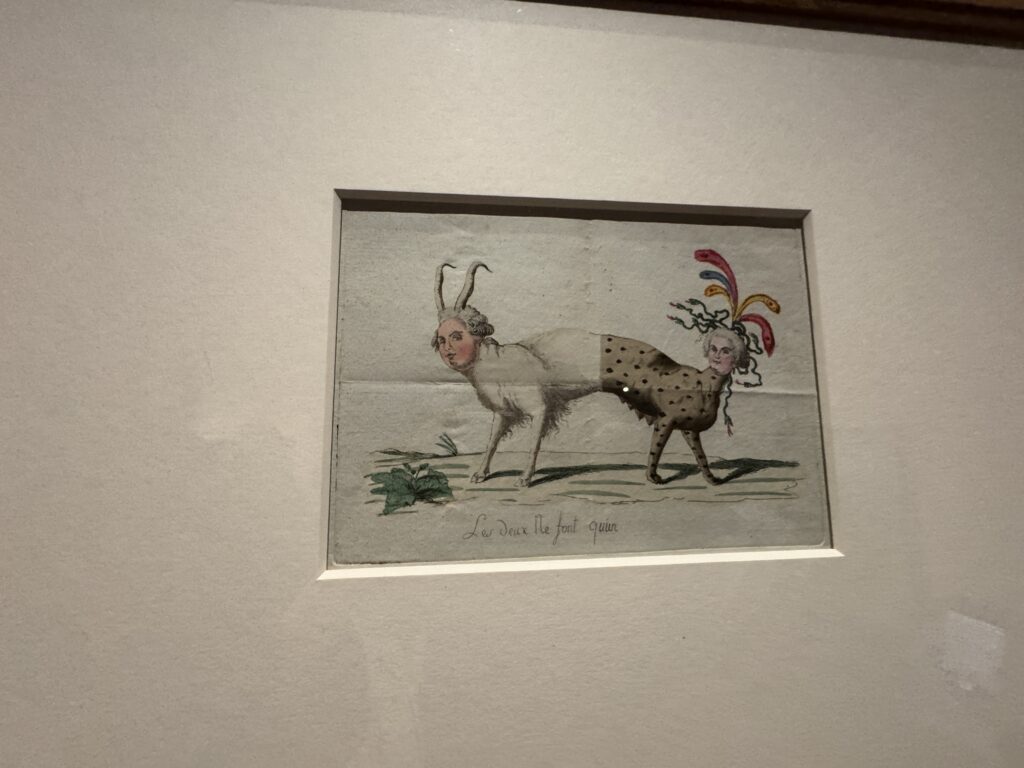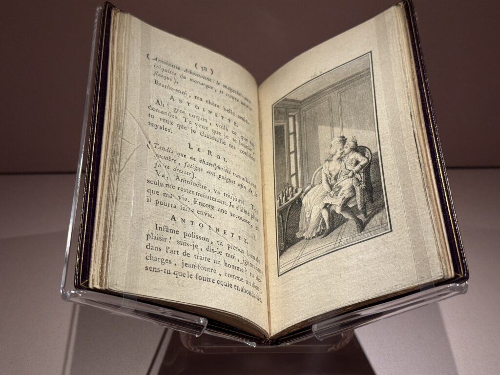 Рассказчики памфлетов сыграли решающую роль в формировании порочных представлений о Марии-Антуанетте. Эти клеветнические слухи запятнали её репутацию и разжегли антимонархические настроения, достигшие своего пика во время революции. Эта сатирическая иллюстрация из политически окрашенной пьесы изображает её как аморальную королеву, утверждающую своё господство над бессильным королём. На ней королева изображена с обнажённой грудью, доставляющая удовольствие своему мужу. Одновременно она делает жест «рожки», намекая на супружескую измену.