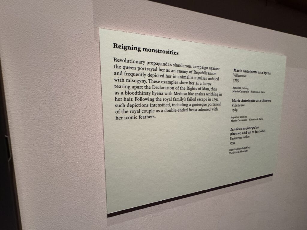 Клеветническая кампания революционной пропаганды против королевы изображала её как врага республиканизма и часто представляла в звериных обличьях, пронизанных женоненавистничеством. В этих примерах она изображена то как гарпия, разрывающая Декларацию прав человека, то как кровожадная гиена со змеями, похожими на Медузу, извивающимися в её волосах. После неудачной попытки побега королевской семьи в 1791 году подобные изображения усилились, включая гротескное изображение королевской четы в виде двуногого чудовища, украшенного её культовыми перьями.