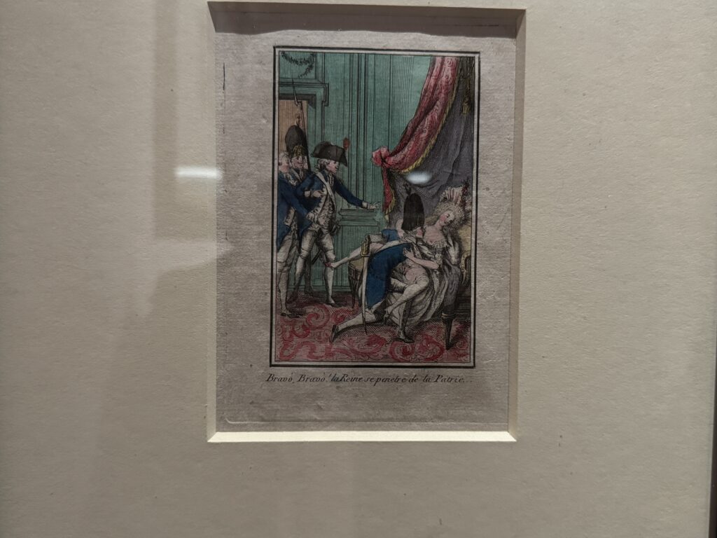 На этой сатирической гравюре Мария-Антуанетта, с обнаженными гениталиями, обнимает солдата королевской гвардии, в то время как трое его спутников наблюдают за происходящим. Королеву часто изображали распутной и неразборчивой в сексуальных отношениях, вступавшей в связь с кем угодно, кроме короля Людовика XVI.»
