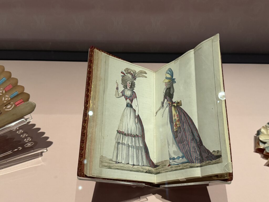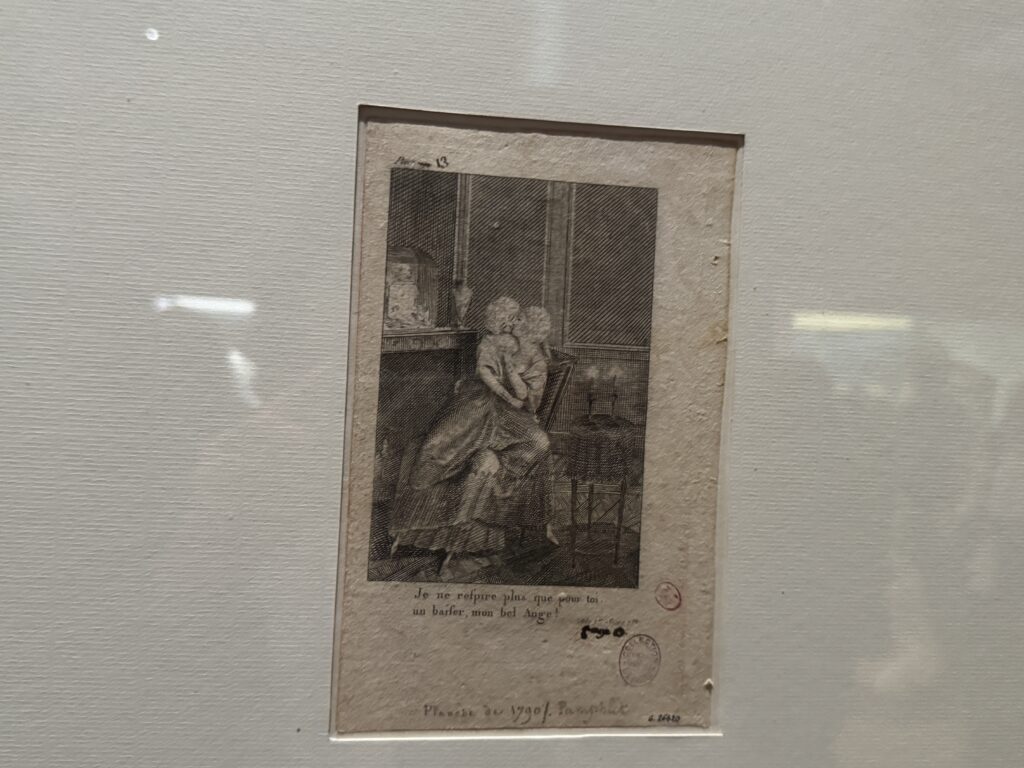 При Марии-Антуанетте материнство стало модным состоянием в королевских, аристократических и буржуазных кругах. На обеих модных иллюстрациях изображены элегантные женщины, кормящие грудью и вынашивающие своих детей, что было немыслимо для предыдущего поколения. Модные журналы публиковали иллюстрации детской одежды и даже модной одежды для гувернанток и нянь.