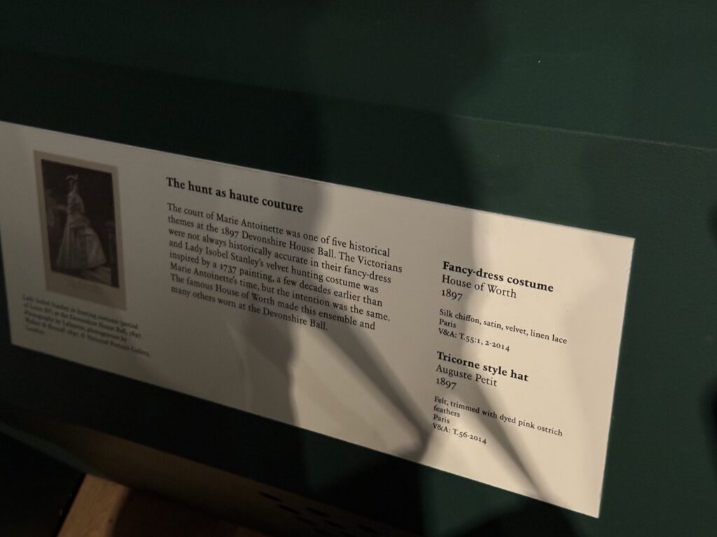 Придворная жизнь Марии-Антуанетты была одной из пяти исторических тем на балу в Девонширском доме в 1897 году. Викторианцы не всегда были исторически точны в своих карнавальных костюмах, и бархатный охотничий костюм леди Изобель Стэнли был вдохновлен картиной 1737 года, созданной на несколько десятилетий раньше, чем времена Марии-Антуанетты, но замысел был тот же. Знаменитый Дом моды Worth изготовил этот ансамбль и многие другие, которые были надеты на Девонширском балу.