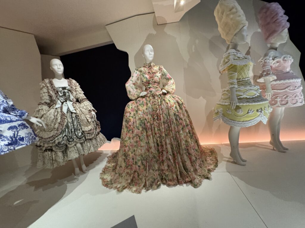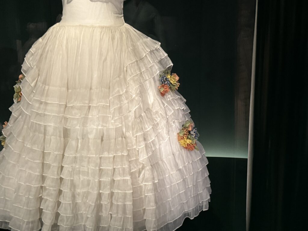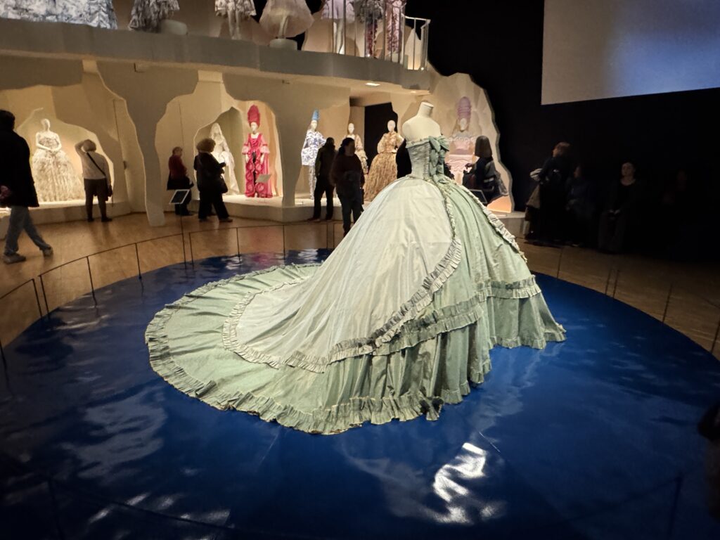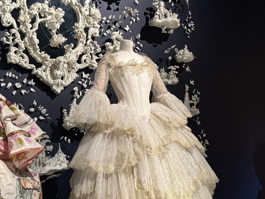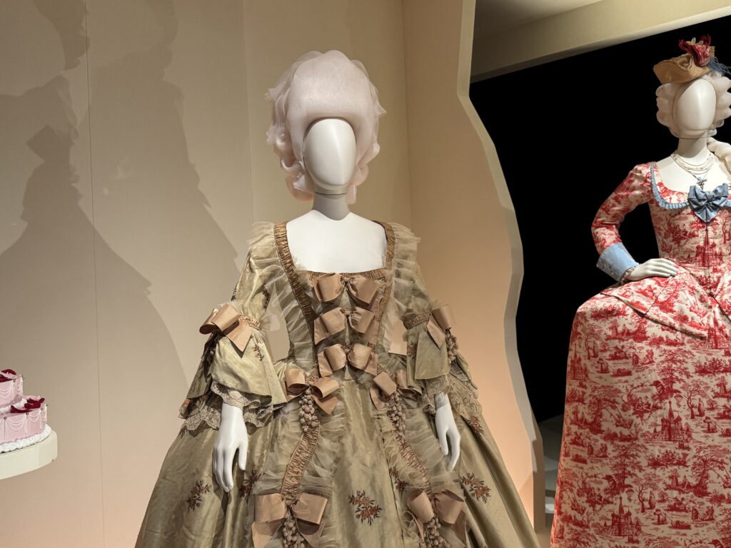 Для актрисы Эмилии Шюле, исполняющей роль Марии Антуанетты в сериале Banijay «Мария-Антуанетта» (2023-2025), кутюрное бюро Christian Dior создало два платья. Швеи и мастера Dior используют традиционные техники ручного шитья, которые были бы вполне уместны в мире королевы XVIII века. Это платье с изящными ярусами шелка, отделанными кружевом, можно увидеть в сцене, где Мария-Антуанетта посещает вечеринку.
