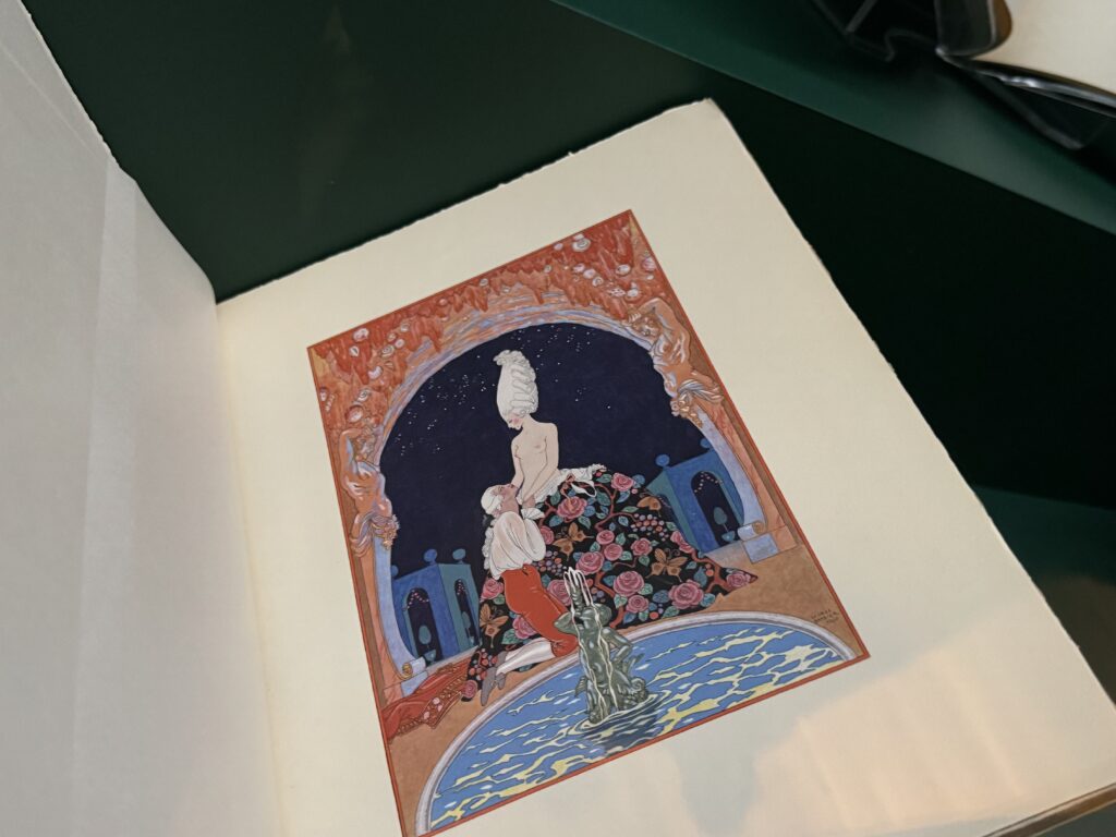 «В гроте» из оперы Fêtes Galantes (Галантные праздники) Текст Поля Верлена, иллюстрации Жоржа Барбье. Пластина датирована 1920 годом, опубликована в 1928 году. Печатная книга с раскрашенными вручную трафаретными иллюстрациями. Издательство Piazza, Париж. Британская библиотека.
