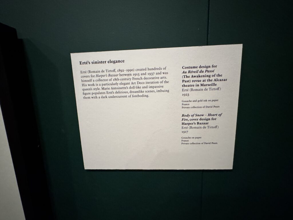Эрте (Ромен де Тиртофф, 1892–1990) создал сотни обложек для Harper’s Bazaar в период с 1915 по 1937 год и сам был коллекционером французского декоративно-прикладного искусства XVIII века. Его работы представляют собой особенно элегантную интерпретацию стиля королевы в стиле ар-деко. Кукольная и бесстрастная фигура Марии-Антуанетты наполняет бредовые, похожие на сновидения сцены Эрте, наполняя их мрачным предчувствием беды.