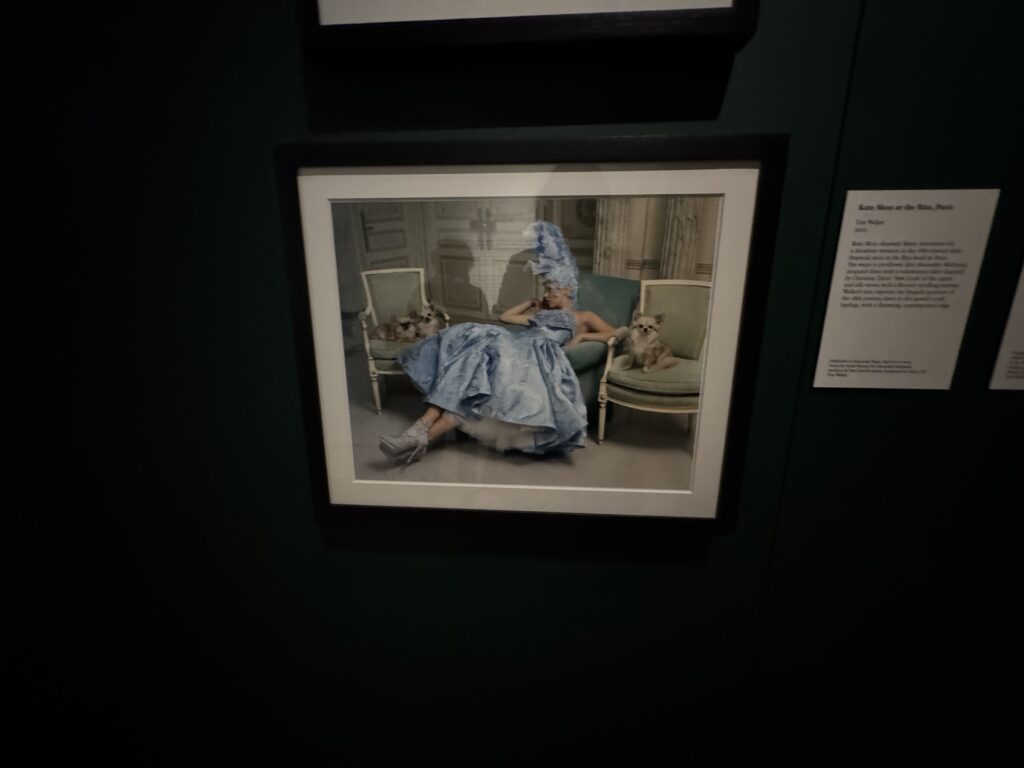 На ней васильковое жаккардовое платье от Alexander McQueen с объемной юбкой, вдохновленной «Новым образом» Кристиана Диора 1950-х годов, и шелком, сотканным с узором в стиле рококо. Объектив Уокер запечатлел томную роскошь XVIII века, вплоть до королевских собачек, с очаровательным современным акцентом.