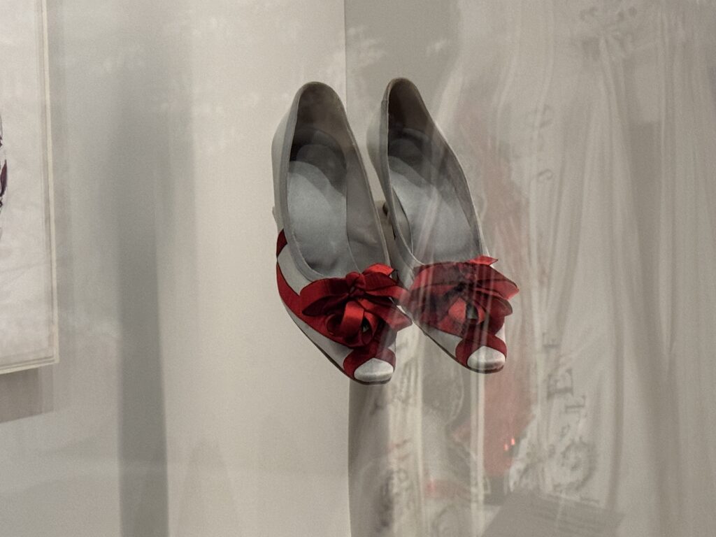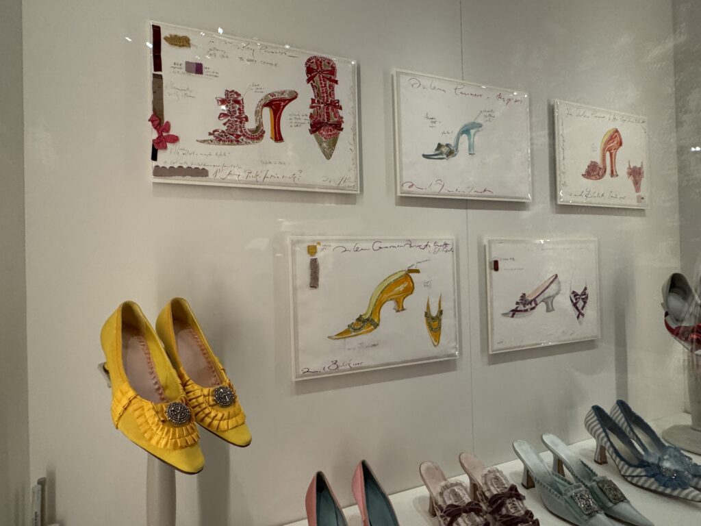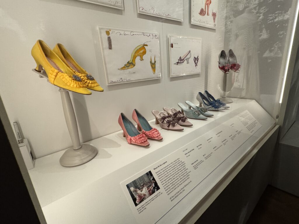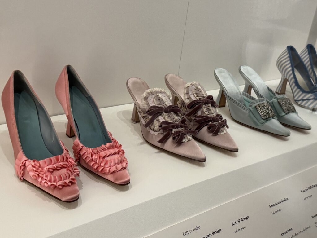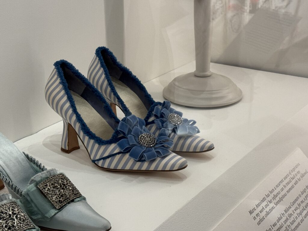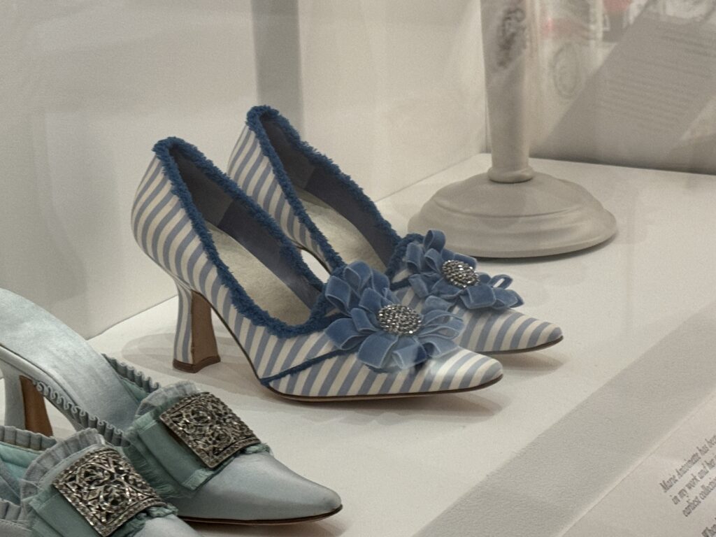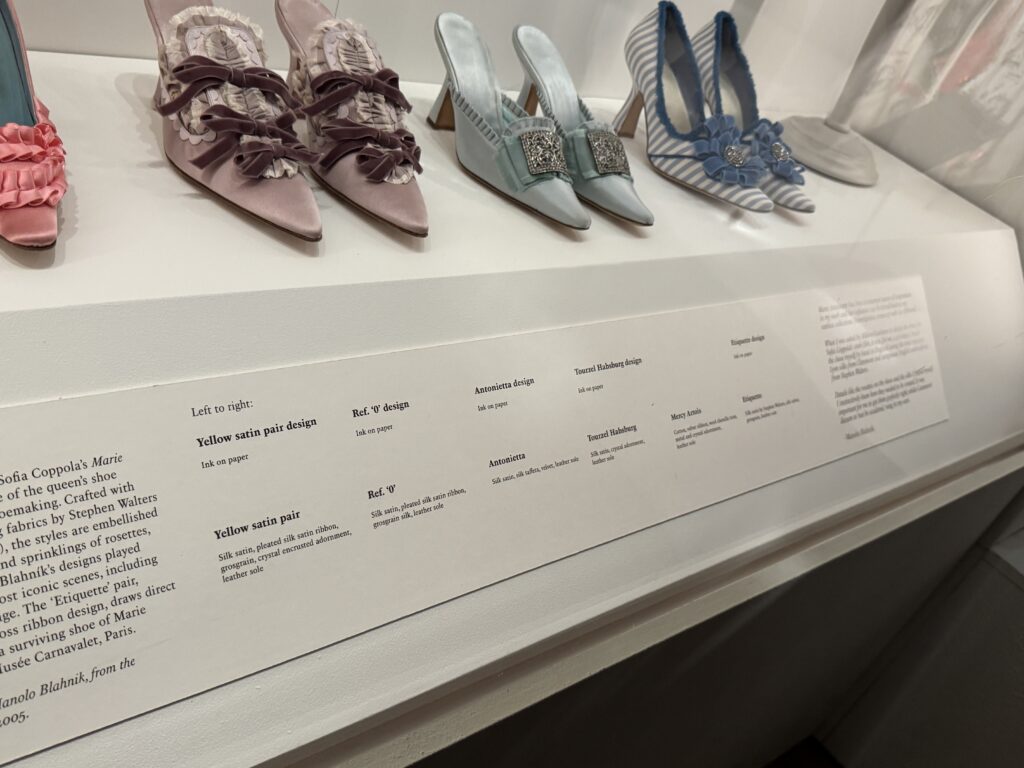 «Туфли, достойные королевы. Кирстен Данст в образе Марии-Антуанетты. Туфли Бланик, созданные вручную для фильма Софии Копполы «Мария-Антуанетта», воплотили в себе суть коллекции обуви королевы и традиции обувного дела XVIII века. Изготовленные из роскошного лионского шелка и тканей Стивена Уолтерса (тканых в Англии с 1720 года), эти модели украшены изысканной ручной бахромой и вкраплениями розеток, бантов и сверкающих кристаллов. Дизайн Бланика сыграл центральную роль в самых знаковых сценах фильма, включая знаменитый эпизод с покупками. Пара туфель «Этикет», отличающаяся эффектным узором из перекрещивающихся лент, напрямую вдохновлена сохранившейся туфлей Марии-Антуанетты, хранящейся в музее Карнавале в Париже.