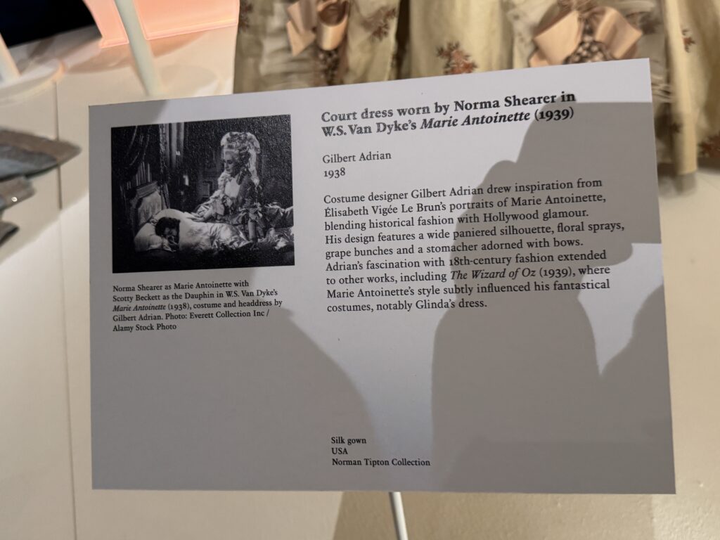 Художник по костюмам Гильберт Адриан черпал вдохновение в портретах Марии-Антуанетты, созданных Элизабет Виже Ле Брюн, сочетая историческую моду с голливудским гламуром. Его дизайн включает в себя широкий силуэт с панье, цветочные композиции, грозди винограда и нагрудник, украшенный бантами. Увлечение Адриана модой XVIII века распространилось и на другие работы, в том числе на «Волшебника страны Оз» (1939), где стиль Марии-Антуанетты тонко повлиял на его фантастические костюмы, особенно на платье Глинды.»