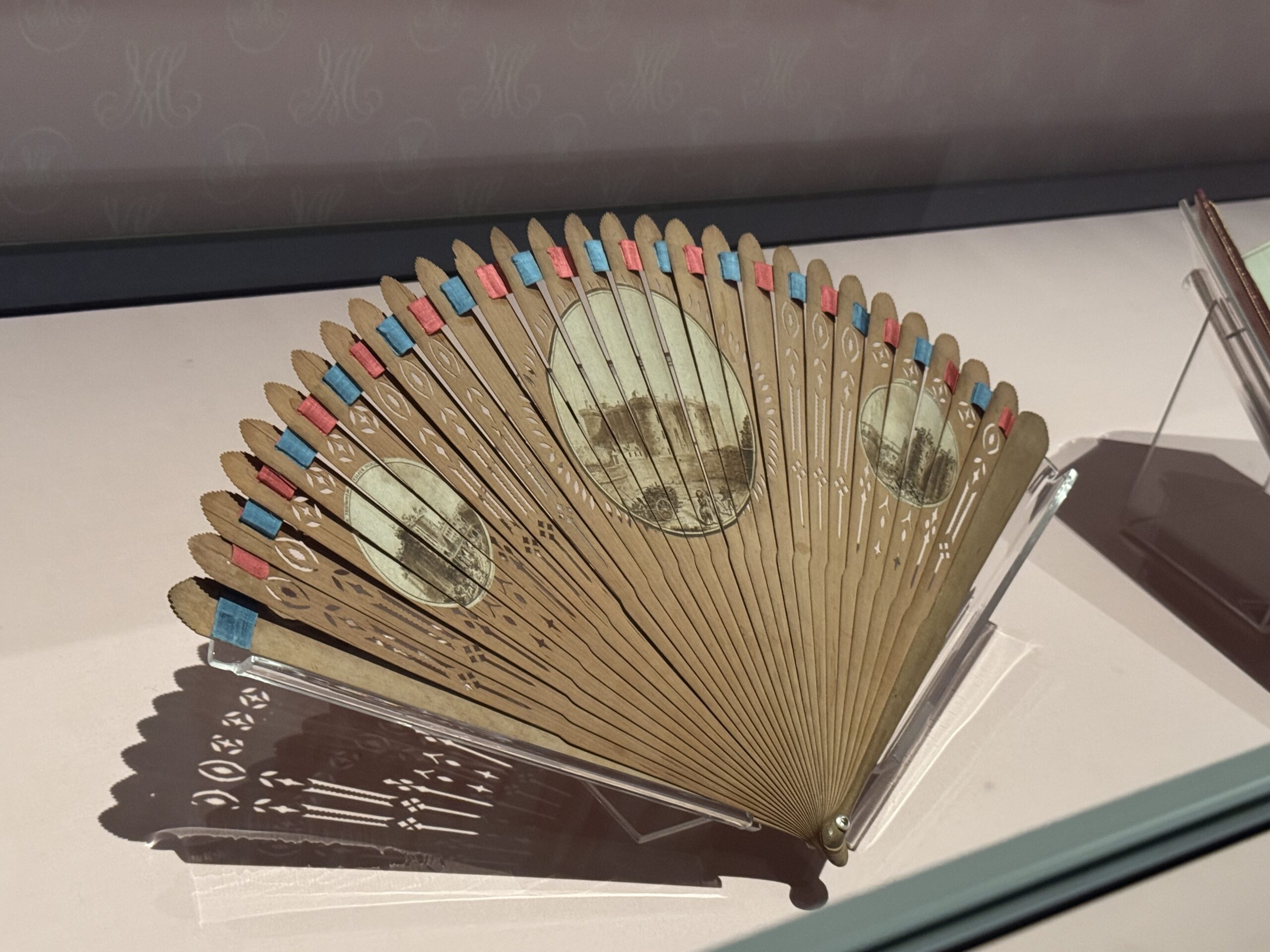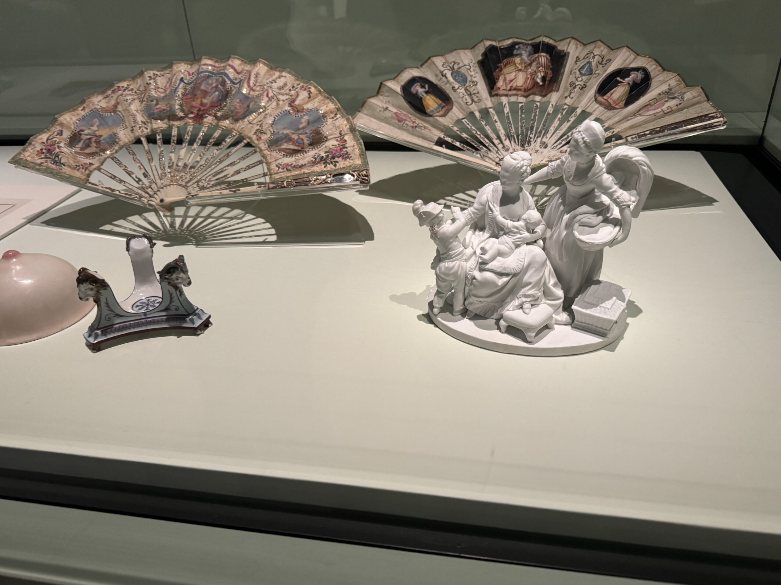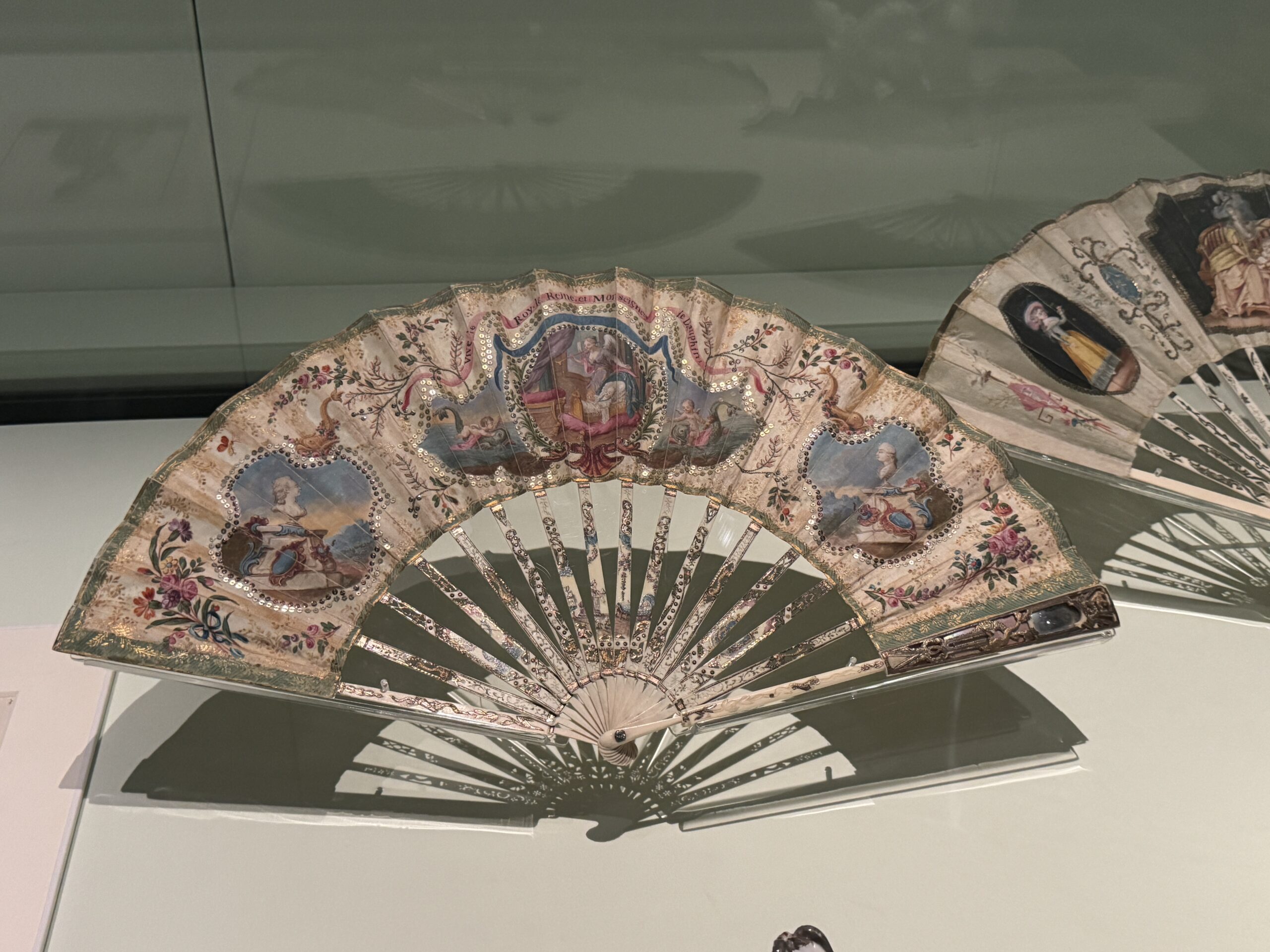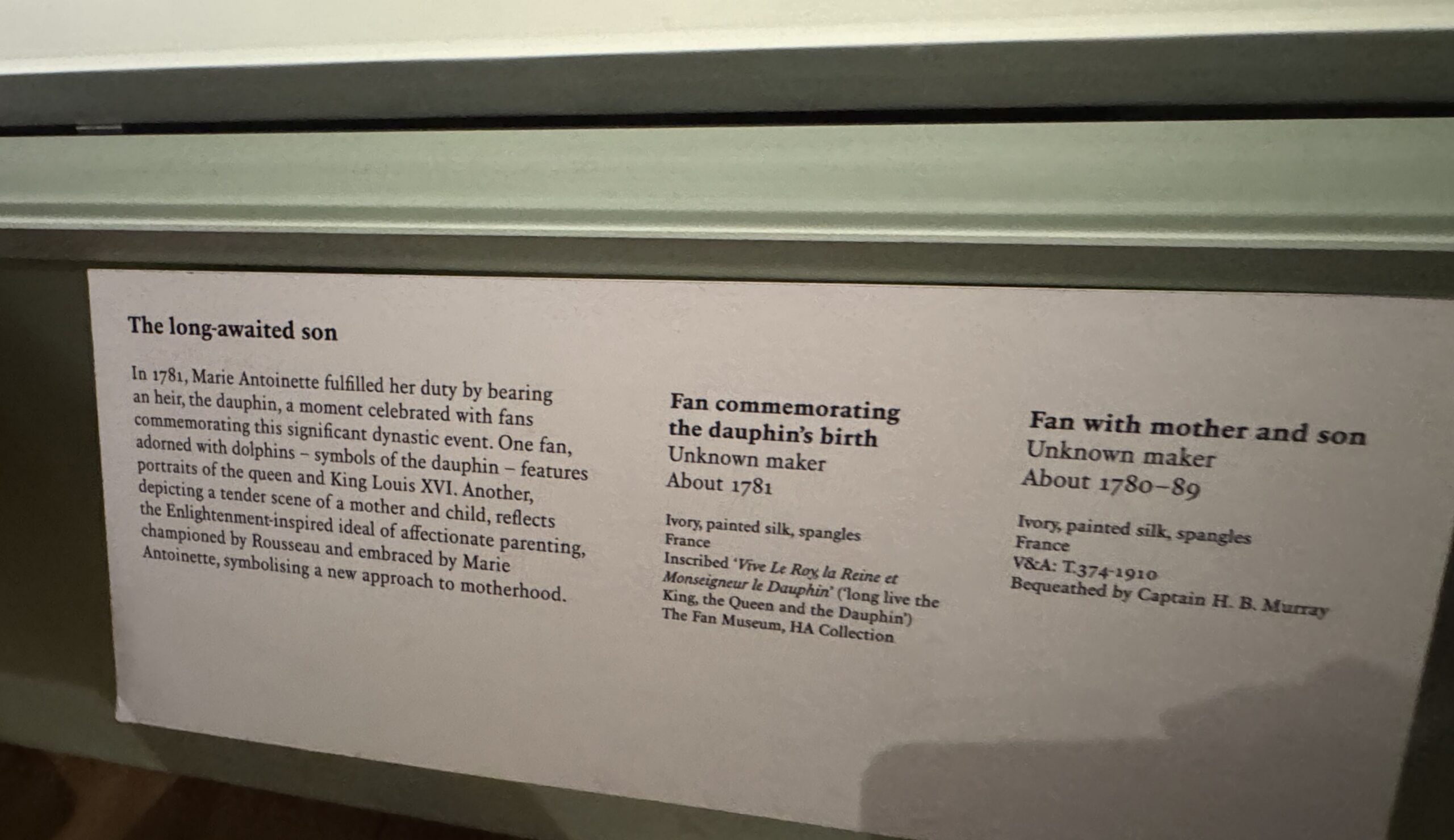 В 1781 году Мария-Антуанетта родила наследника, дофина, и этот момент был отмечен веерами, посвященными этому знаменательному династическому событию. Один из вееров, украшенный дельфинами — символами дофина, — содержит портреты королевы и короля Людовика XVI. Другой, изображающий трогательную сцену матери и ребенка, отражает вдохновленный Просвещением идеал заботливого родительства, отстаиваемый Руссо и принятый Марией-Антуанеттой, символизируя новый подход к материнству.