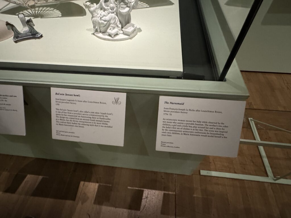Эта чаша для груди (bol sein), также называемая jotre téton, является одной из четырех чаш фарфорового сервиза, заказанного королевой для молочной фермы в Рамбуйе. Дизайн был скопирован с древнегреческого образца, известного как fastos, но севрская интерпретация более реалистична. Что подпитывало устойчивый миф о том, что она была создана по образцу груди самой Марии-Антуанетты. Современные фабрики тоже делают такие, вдохновляясь экспонатом.