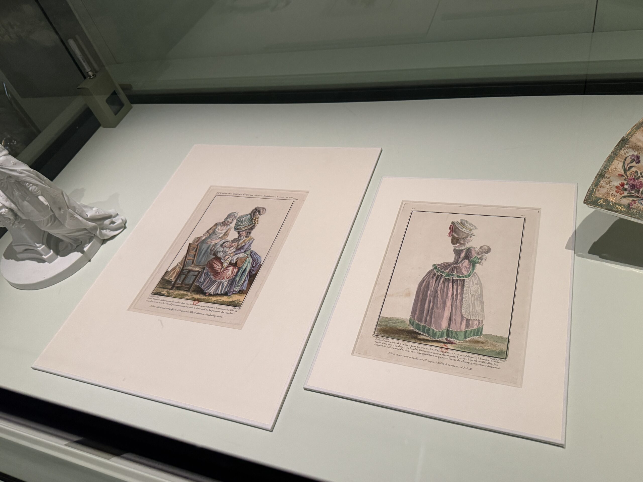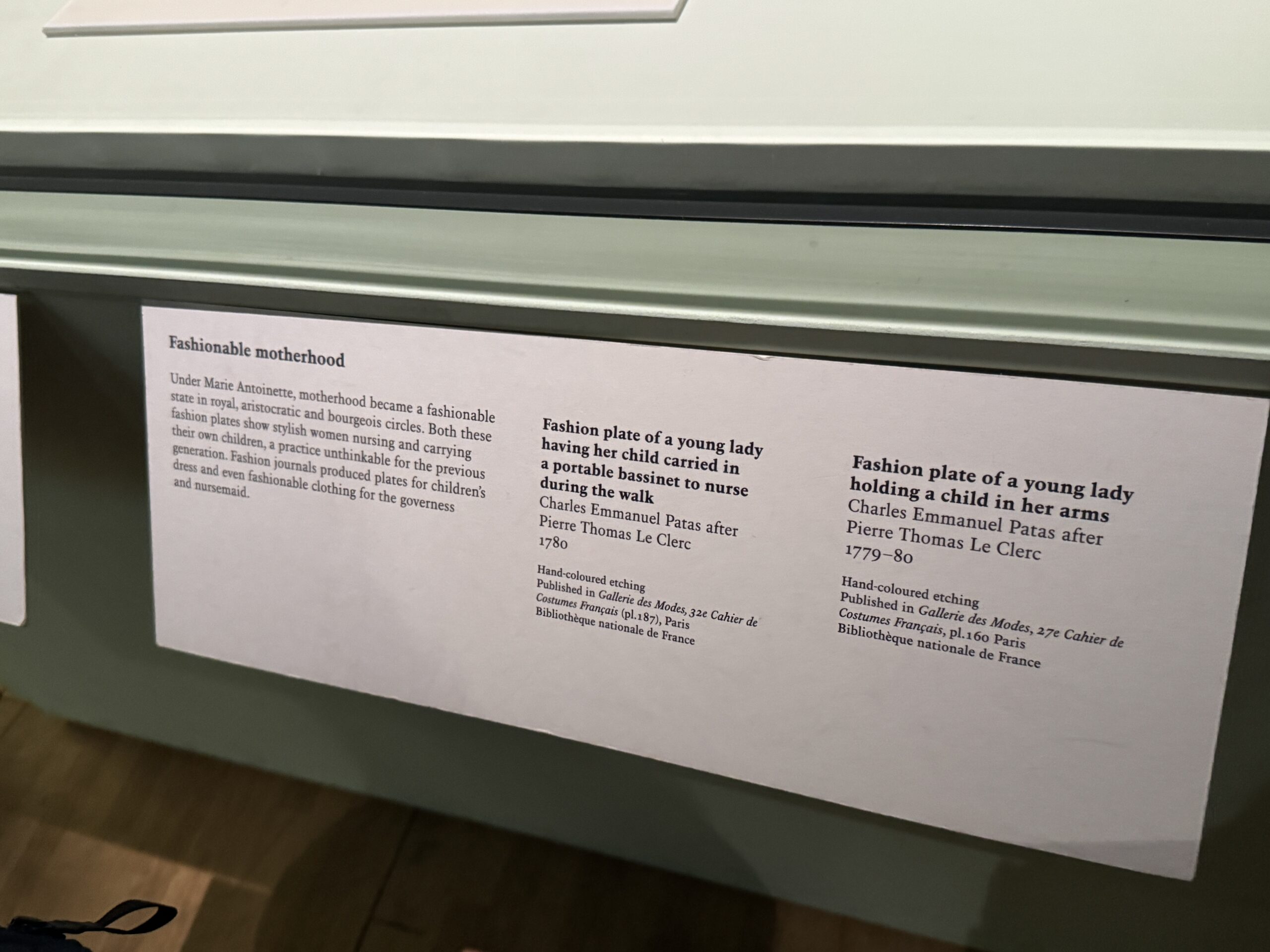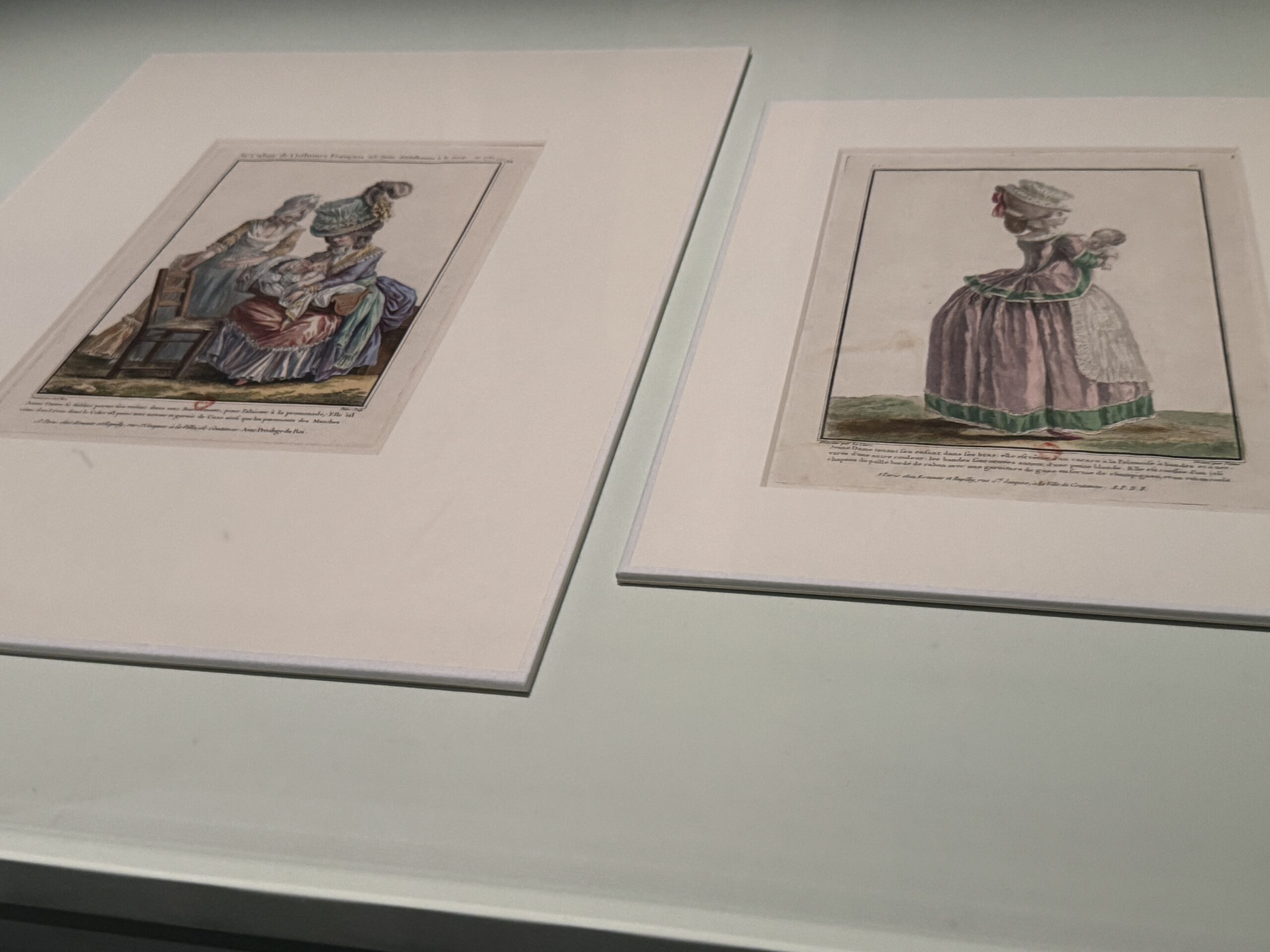 При Марии-Антуанетте материнство стало модным состоянием в королевских, аристократических и буржуазных кругах. На обеих модных иллюстрациях изображены элегантные женщины, кормящие грудью и вынашивающие своих детей, что было немыслимо для предыдущего поколения. Модные журналы публиковали иллюстрации детской одежды и даже модной одежды для гувернанток и нянь.