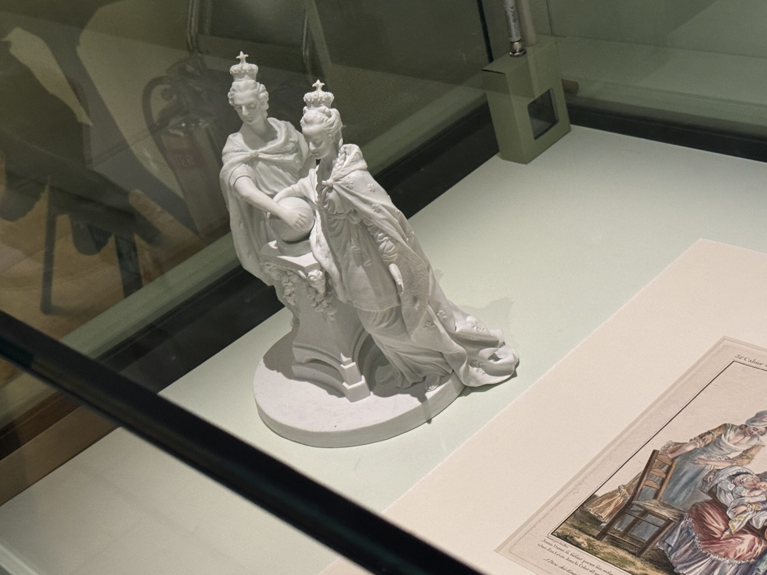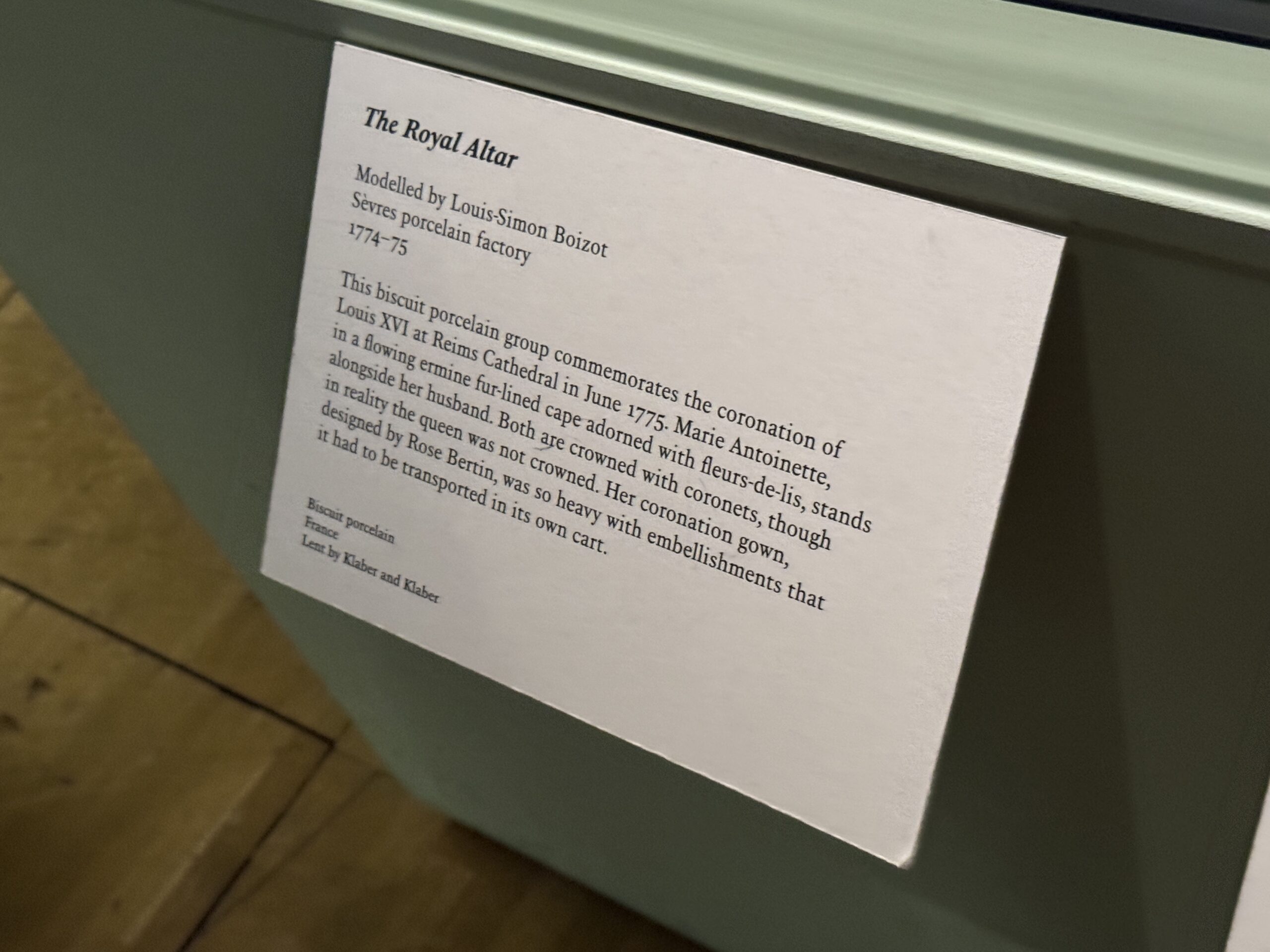 Эта фарфоровая композиция посвящена коронации Людовика XVI в Реймсском соборе в июне 1775 года. Мария-Антуанетта в струящейся накидке, отделанной горностаем и украшенной геральдическими лилиями, стоит рядом со своим мужем. Оба увенчаны коронами, хотя в действительности королева не была коронована. Ее коронационное платье, созданное Розой Бертен, было настолько богато украшено, что его пришлось перевозить в отдельной повозке.