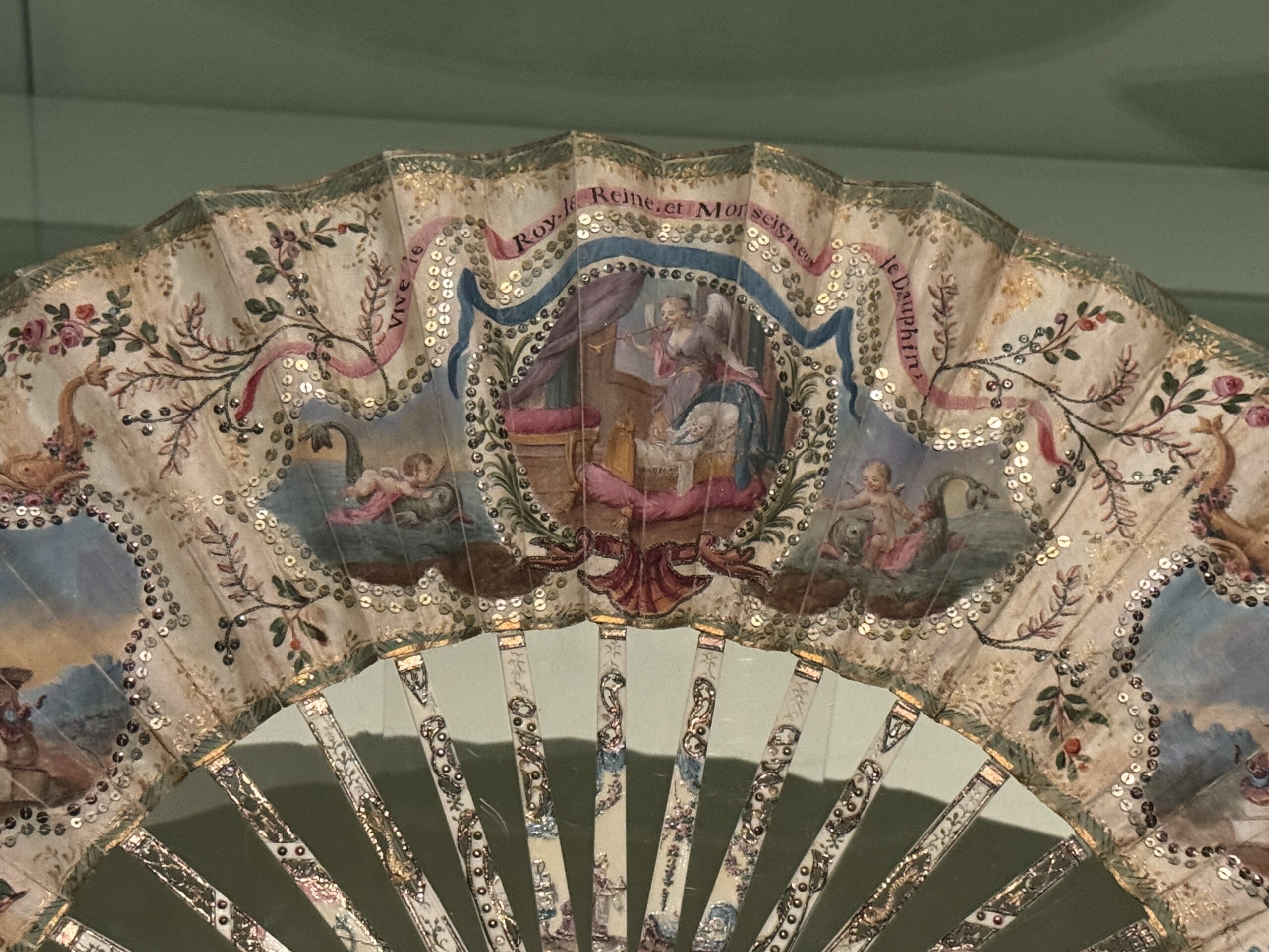 Веер в память о рождении дофина. Неизвестный производитель Около 1781 г. Веер из слоновой кости, расписной шелк, блестки. Франция. Надпись «Vive Le Roy, la Reine et Monseigneur le Dauphin» («Да здравствует король, королева и дофин»). Музей вееров, коллекция HA.