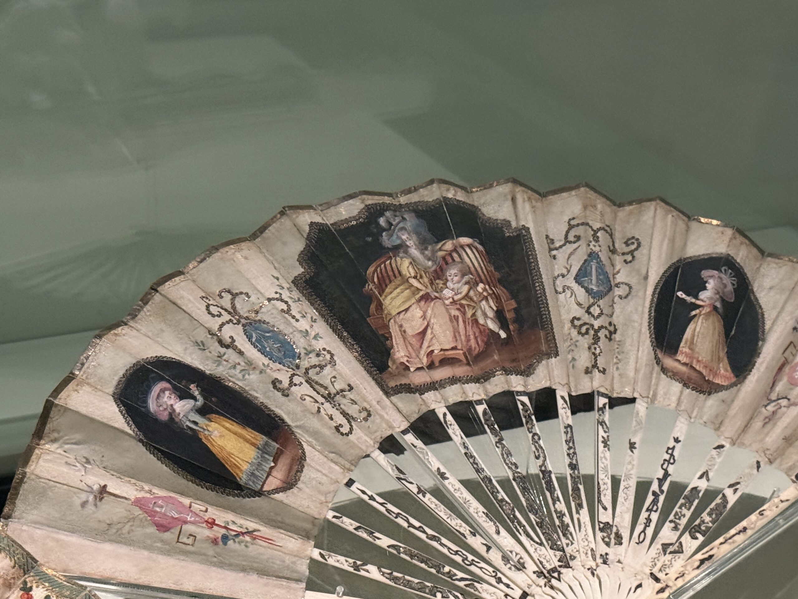 Веер с матерью и сыном. Производитель неизвестен. Примерно 1780-1789 гг. Слоновая кость, расписной шелк, блестки. Франция. Музей Виктории и Альберта: T.374-1910. Передано в дар капитаном Х. Б. Мюрреем.»