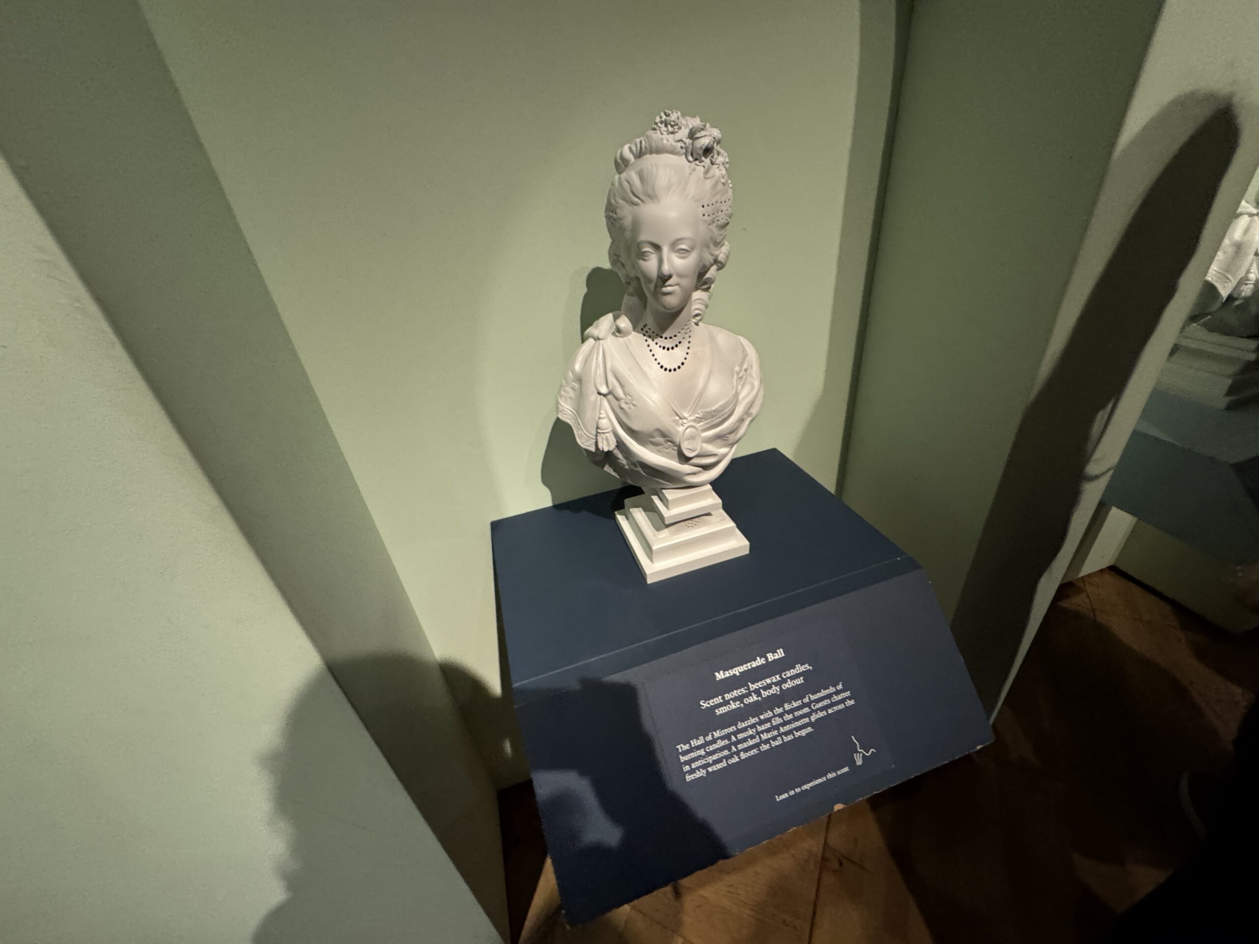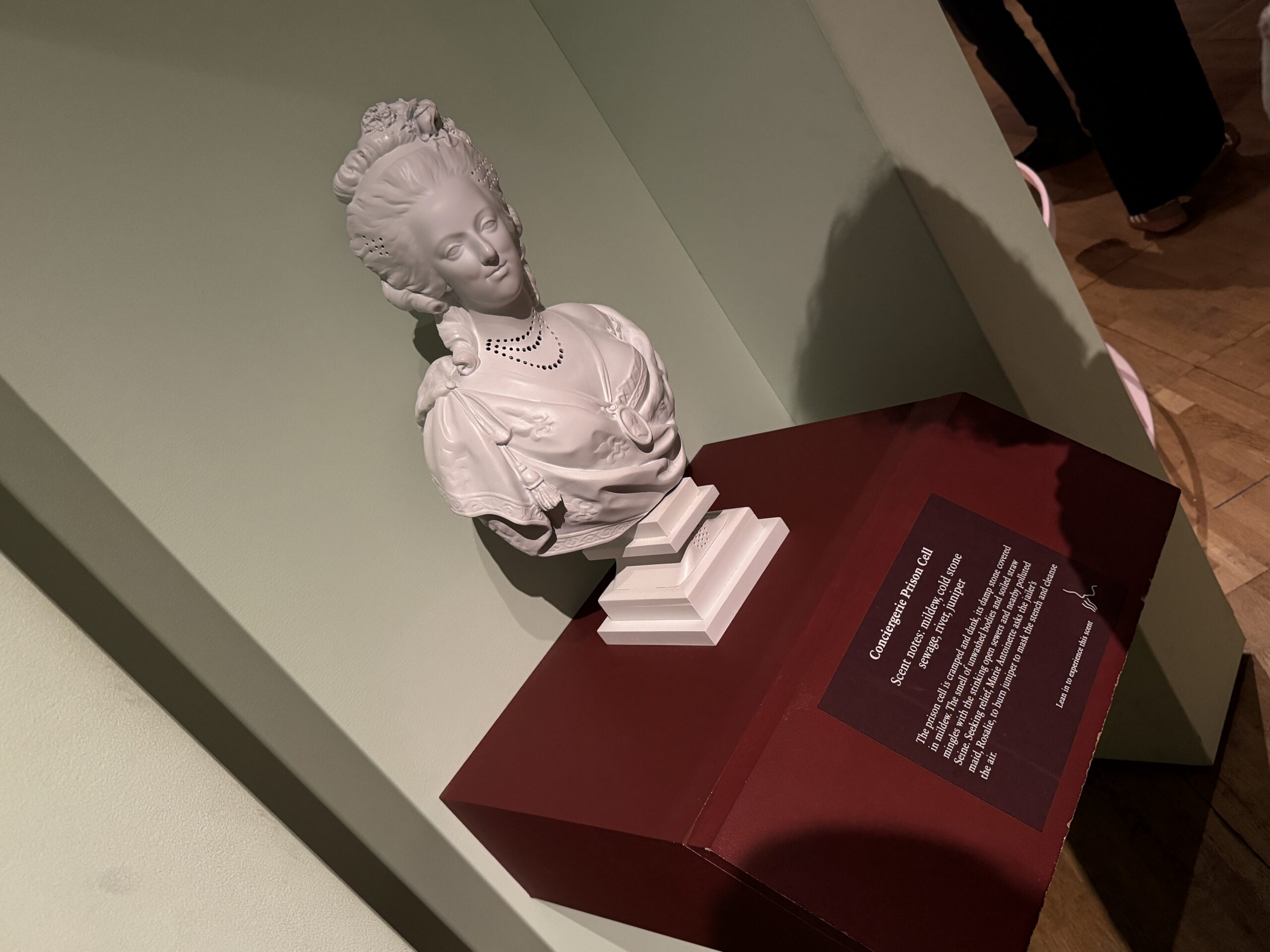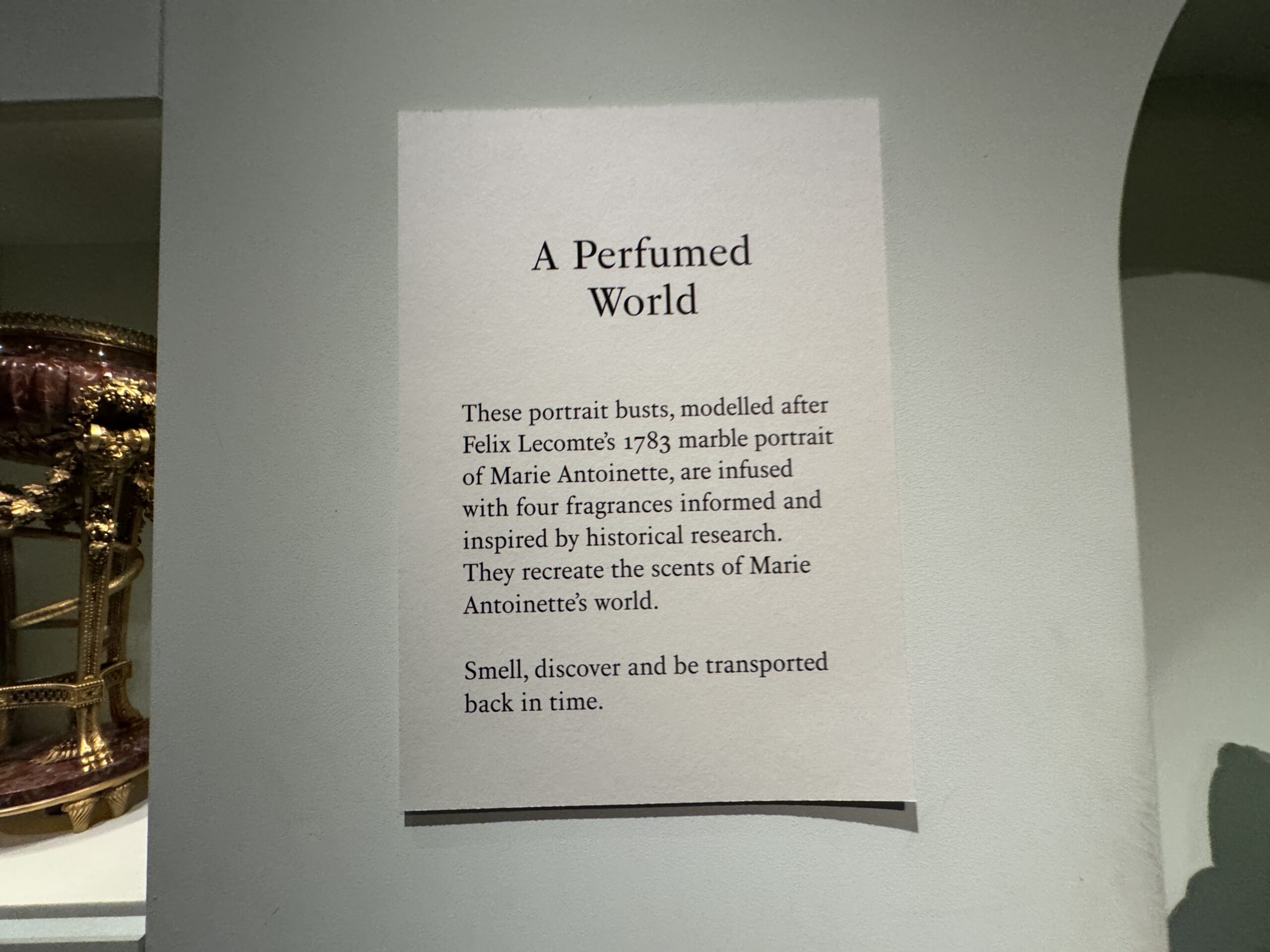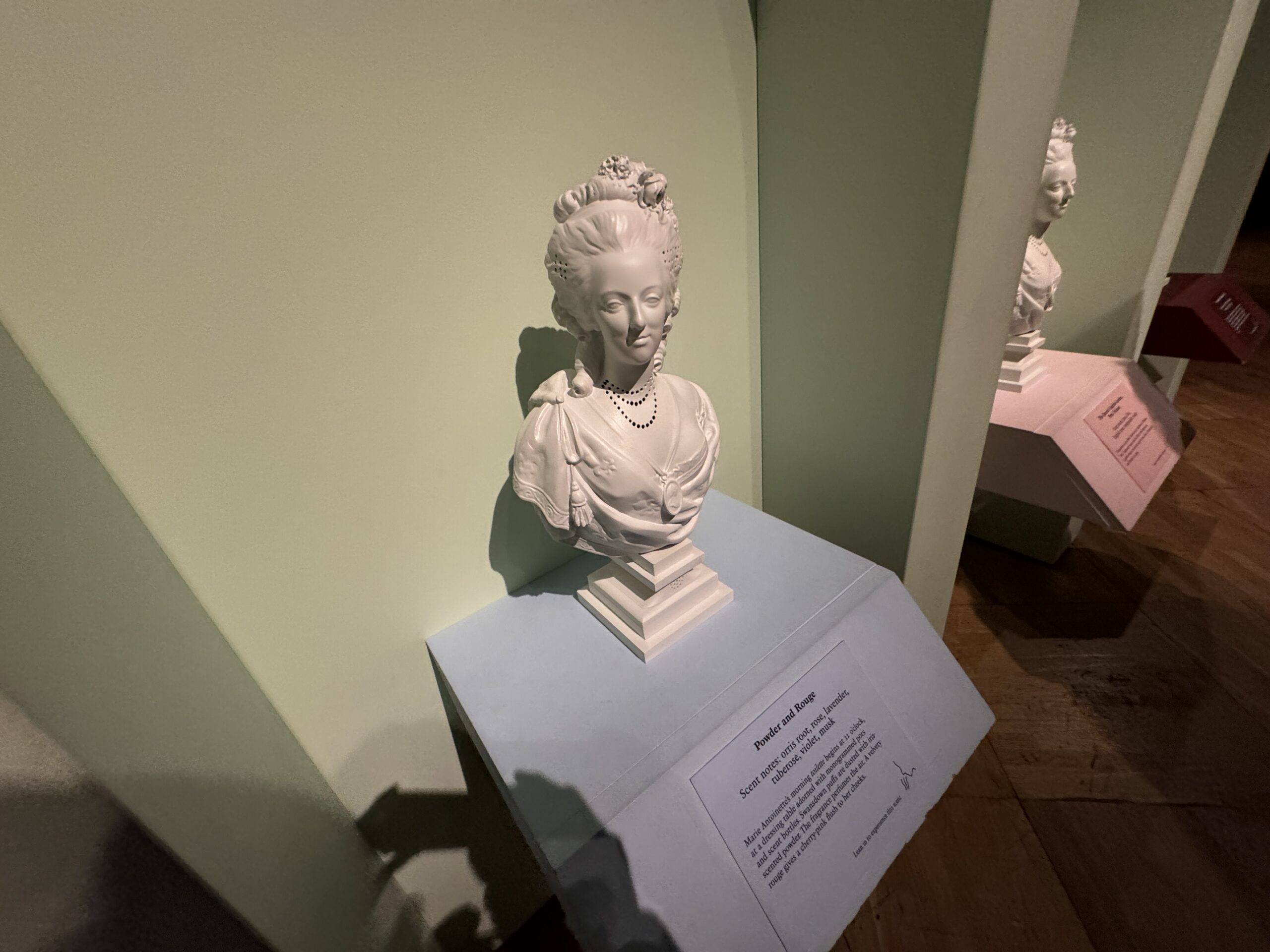 «Парфюмированный мир. Эти портретные бюсты, созданные по образцу мраморного портрета Марии-Антуанетты работы Феликса Лекомта 1783 года, пропитаны четырьмя ароматами, разработанными на основе исторических исследований. Они воссоздают ароматы мира Марии-Антуанетты. Почувствуйте запахи, откройте для себя новое и перенеситесь в прошлое.»