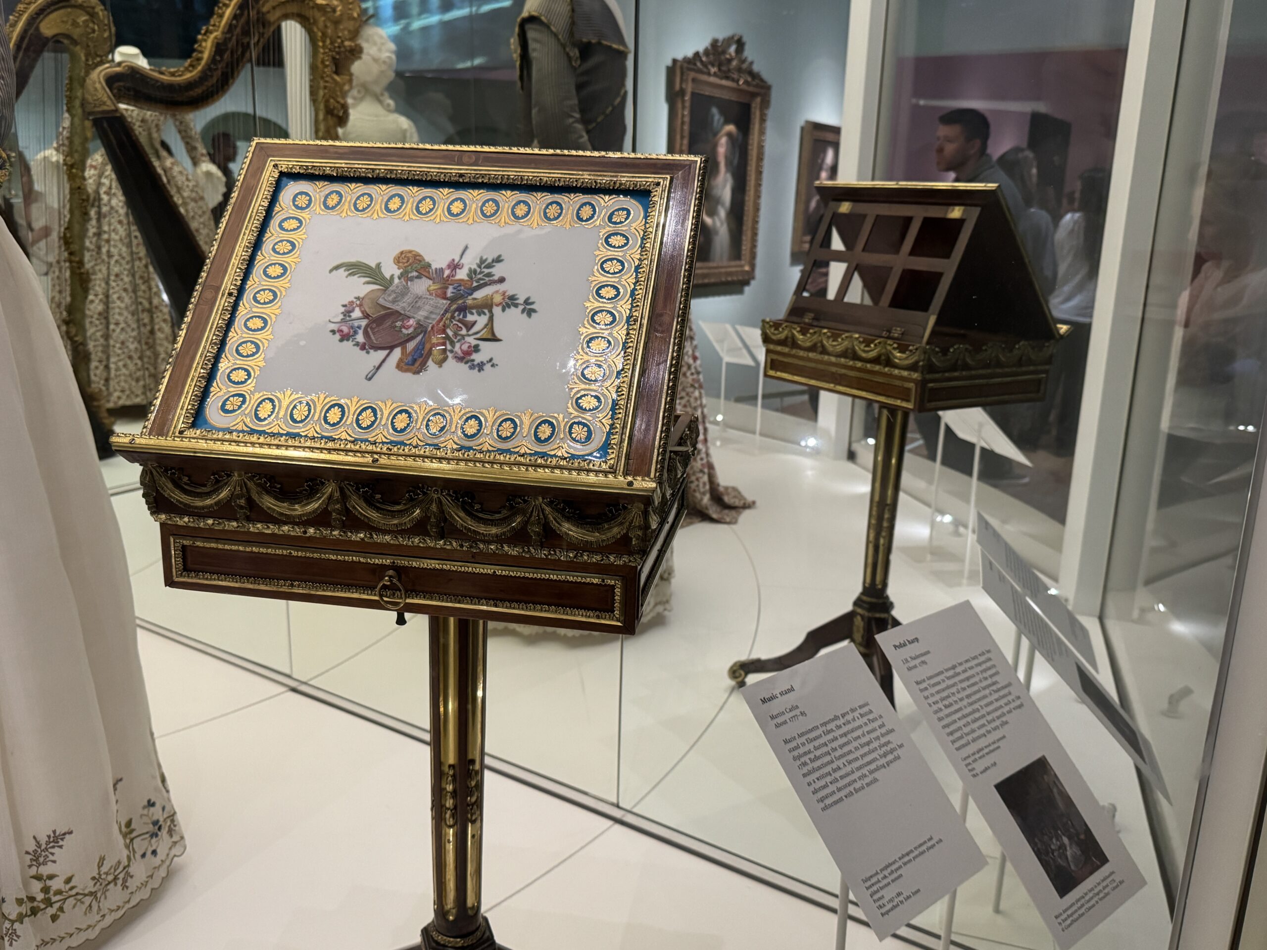 «Пюпитр. Мартин Карлин. Примерно 1777-1785 годы. Сообщается, что Мария-Антуанетта подарила этот пюпитр Элеоноре Иден, жене британского дипломата, во время торговых переговоров в Париже в 1786 году. Отражая любовь королевы к музыке и многофункциональной мебели, его откидная столешница служит одновременно и письменным столом. Фарфоровая пластина из Севра, украшенная музыкальными инструментами, подчеркивает ее фирменный декоративный стиль, сочетающий изящную утонченность с цветочными мотивами.