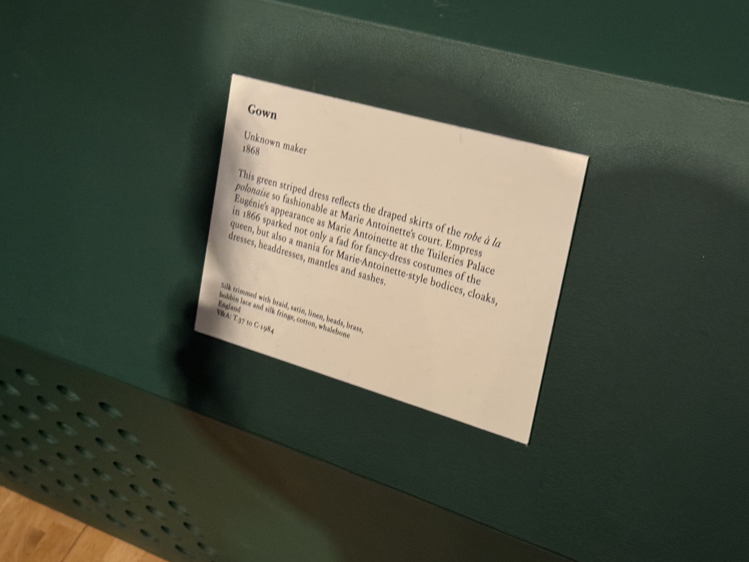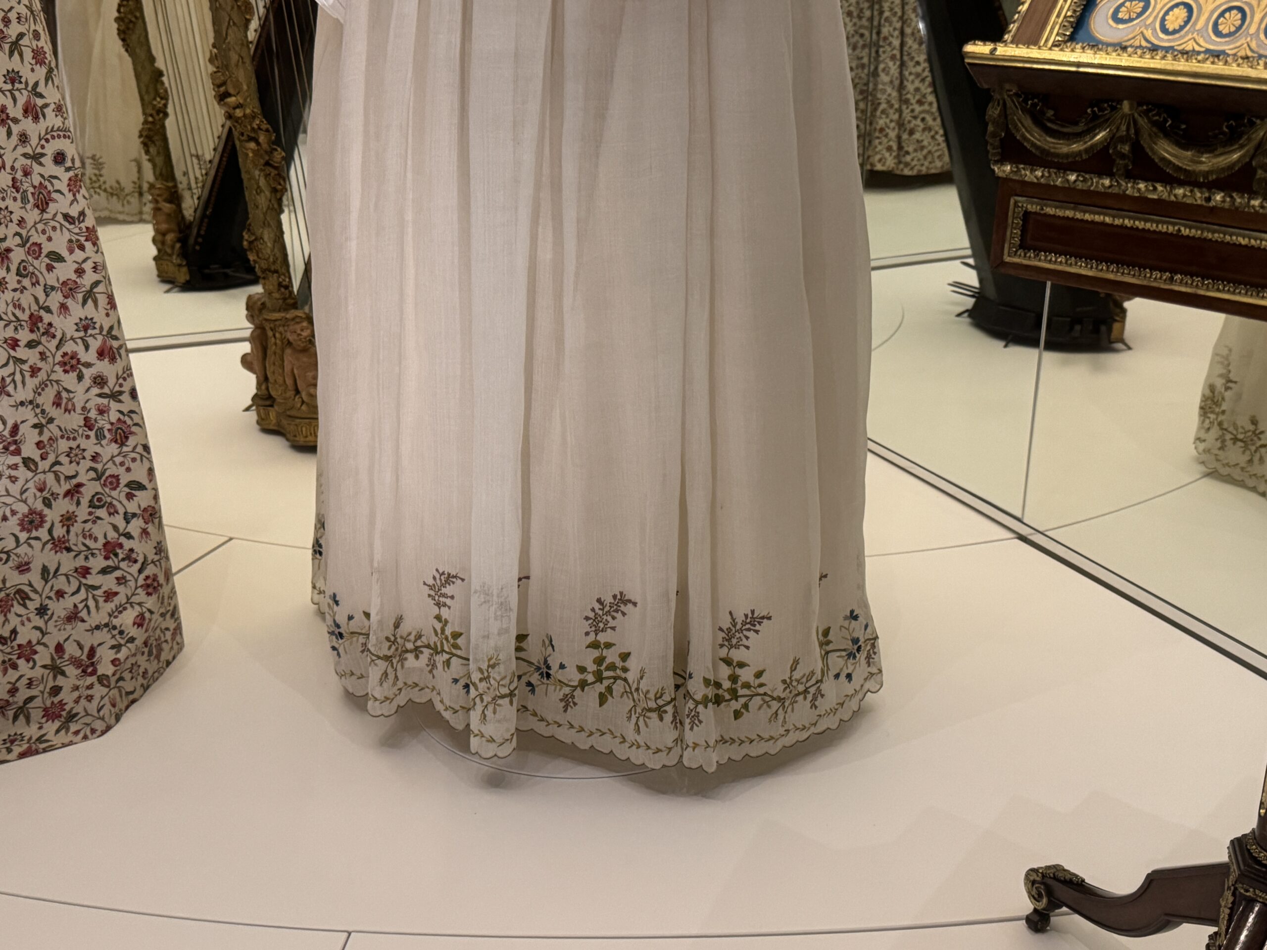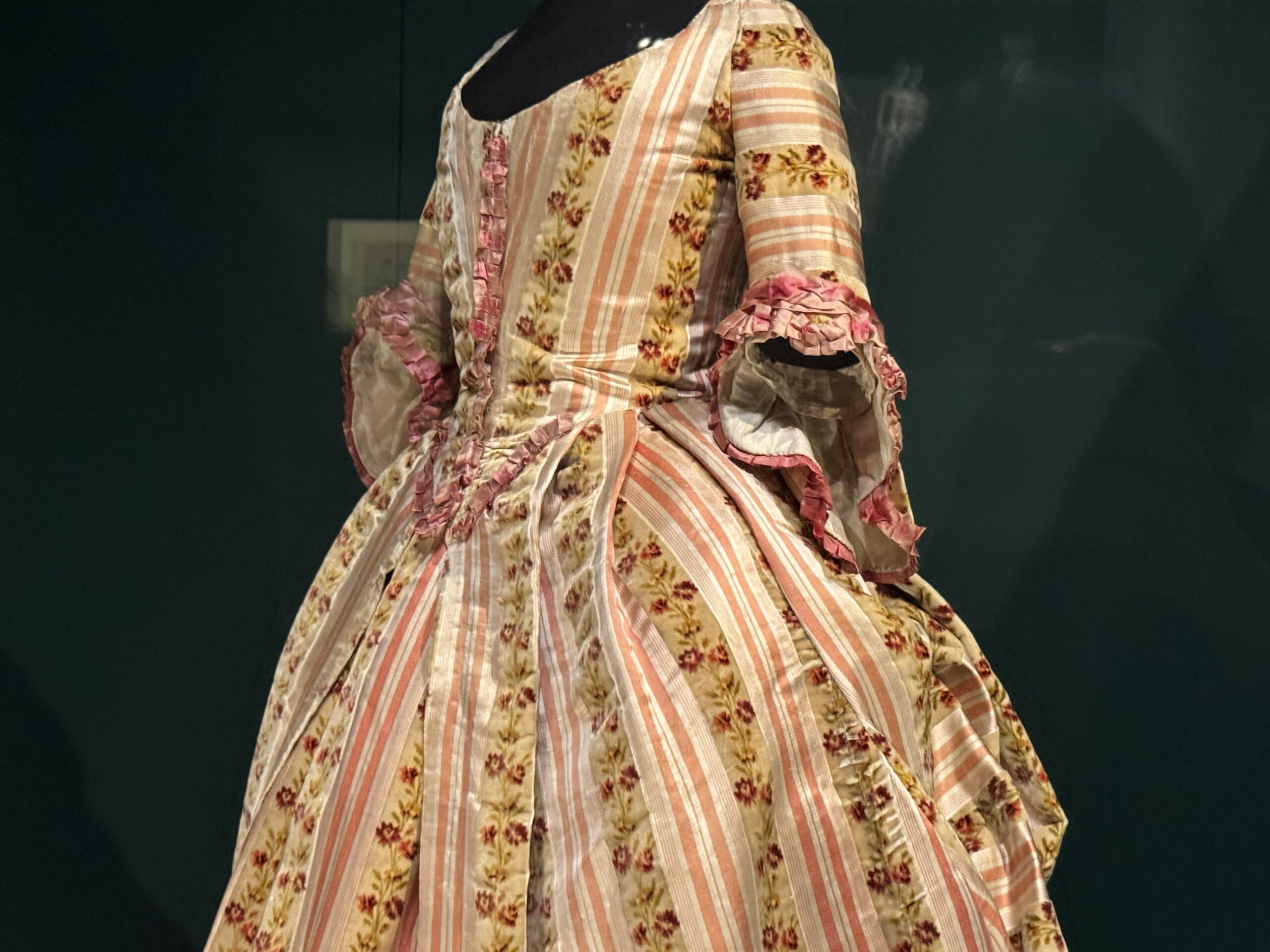 Это платье в английском стиле с цветочным принтом сшито из персе — разновидности хлопчатобумажной ткани с цветочным рисунком высочайшего качества, часто с глянцевой поверхностью, — производства известной фабрики Оберкампф в Жуи. Мария-Антуанетта владела похожими платьями из персе и использовала их также в своих личных интерьерах. Ее предпочтение этой современной ткани отражало ее любовь к непринужденным, модным стилям в противовес формальной придворной одежде.