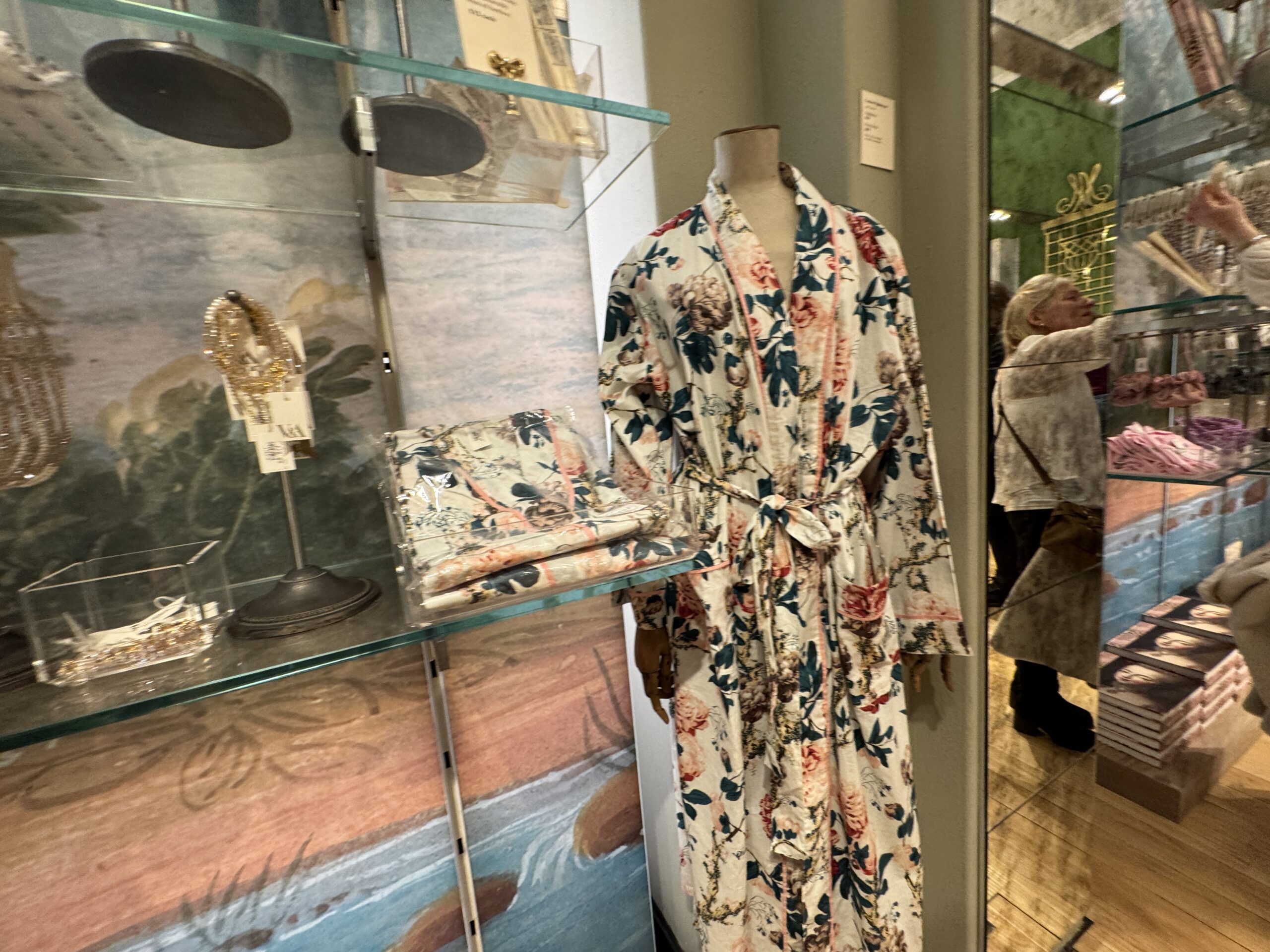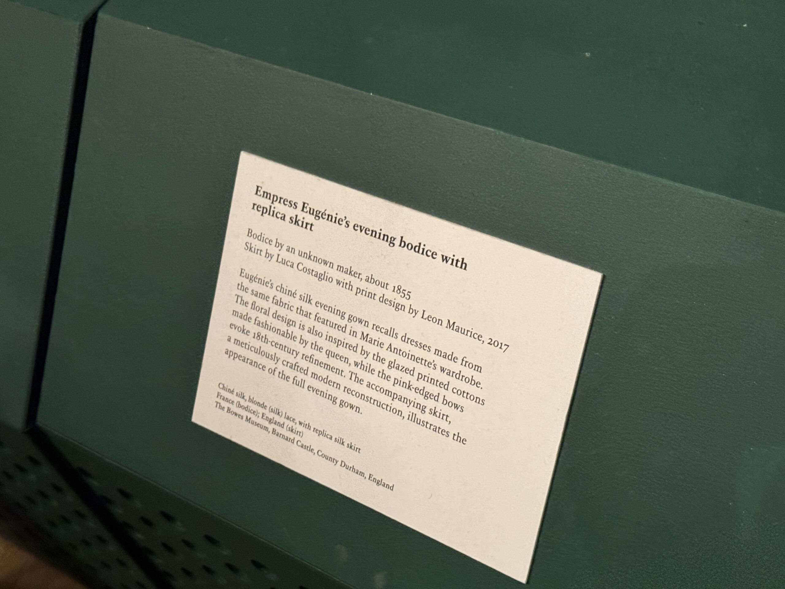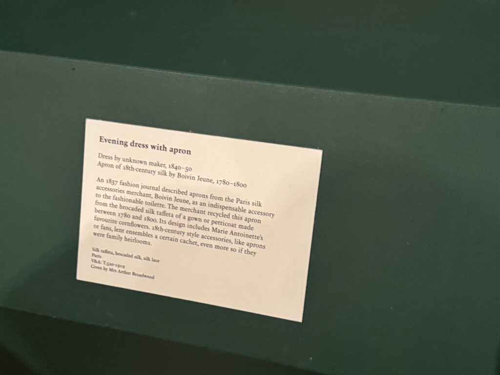 Это платье в английском стиле с цветочным принтом сшито из персе — разновидности хлопчатобумажной ткани с цветочным рисунком высочайшего качества, часто с глянцевой поверхностью, — производства известной фабрики Оберкампф в Жуи. Мария-Антуанетта владела похожими платьями из персе и использовала их также в своих личных интерьерах. Ее предпочтение этой современной ткани отражало ее любовь к непринужденным, модным стилям в противовес формальной придворной одежде.