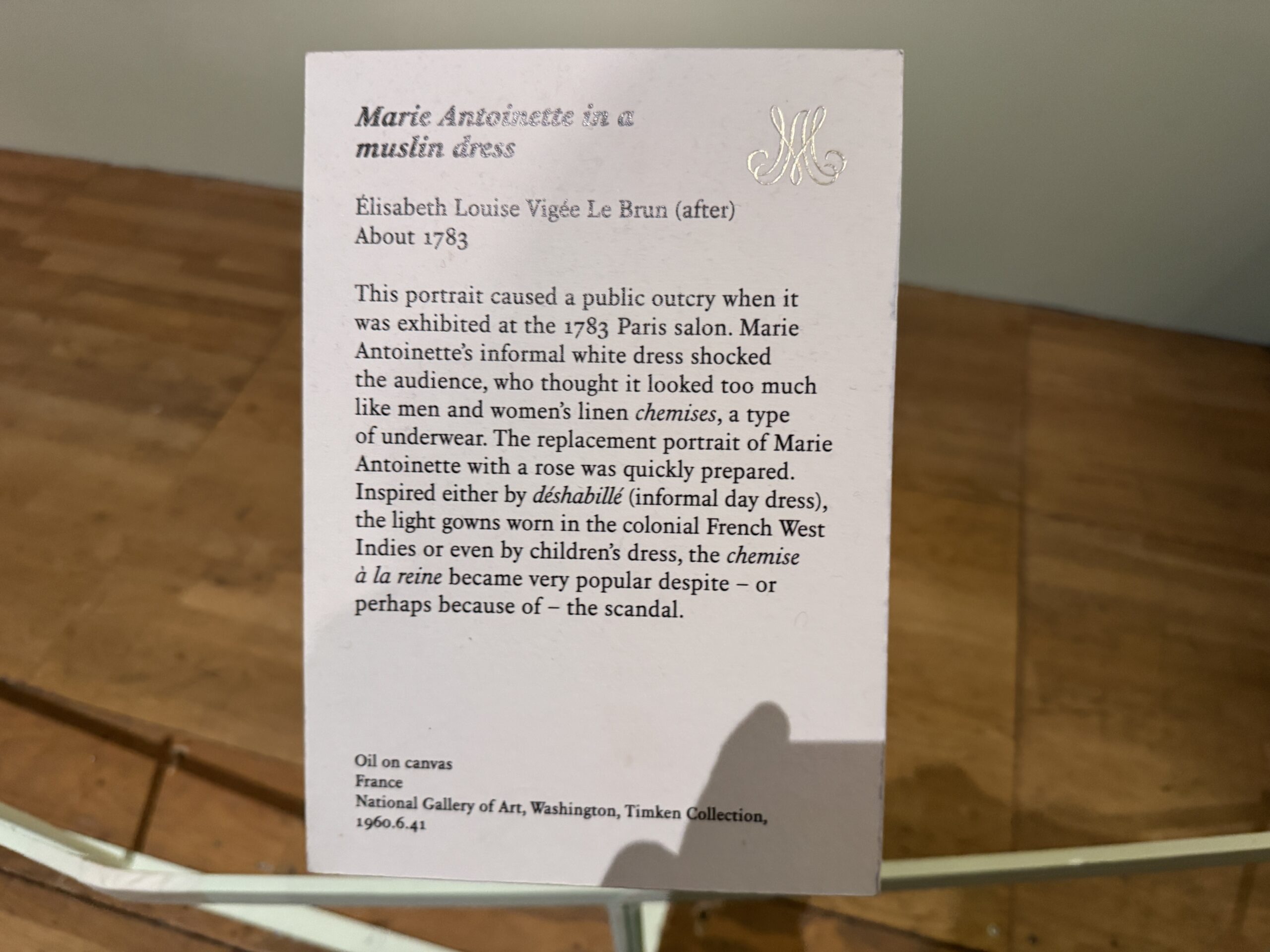 Этот портрет вызвал общественный резонанс, когда был выставлен в Парижском салоне в 1783 году. Неформальное белое платье Марии-Антуанетты шокировало публику, которая сочла его слишком похожим на мужские и женские льняные сорочки, разновидность нижнего белья. Быстро был подготовлен портрет Марии-Антуанетты с розой в качестве замены. Вдохновленная либо дезабилье (неформальным дневным платьем), легкими платьями, которые носили во французской колониальной Вест-Индии, либо даже детской одеждой, сорочка «а-ля королева» стала очень популярной, несмотря на скандал, а может быть, и благодаря ему.