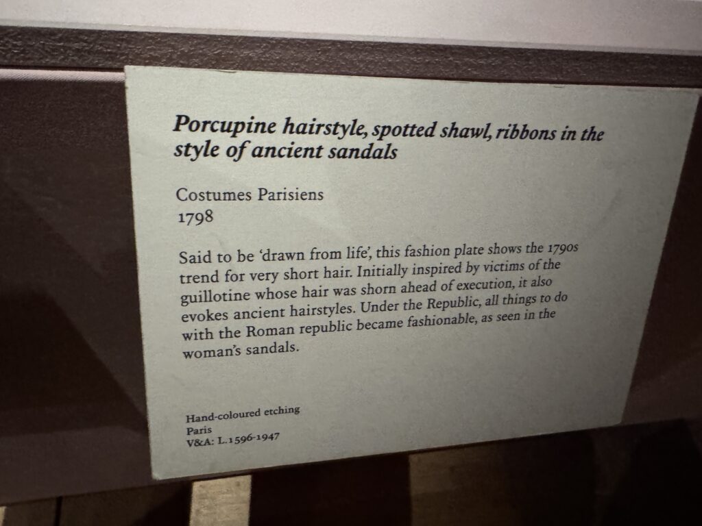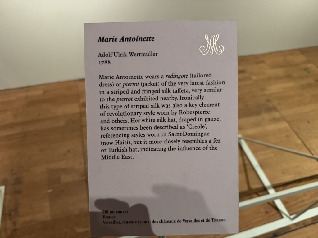 «Мария-Антуанетта. Адольф-Ульрик Вертмюллер, 1788. Мария-Антуанетта одета в редингот (приталенное платье) или пьеро (жакет) самой последней моды из полосатой шелковой тафты с бахромой, очень похожий на выставленный рядом пьеро. По иронии судьбы, этот тип полосатого шелка также был ключевым элементом революционного стиля, который носили Робеспьер и другие. Ее белая шелковая шляпа, задрапированная вуалью, иногда описывается как «креольская», отсылая к стилям, распространенным в Сан-Доминго (ныне Гаити), но она больше напоминает феску или турецкую шляпу, что указывает на влияние Ближнего Востока.