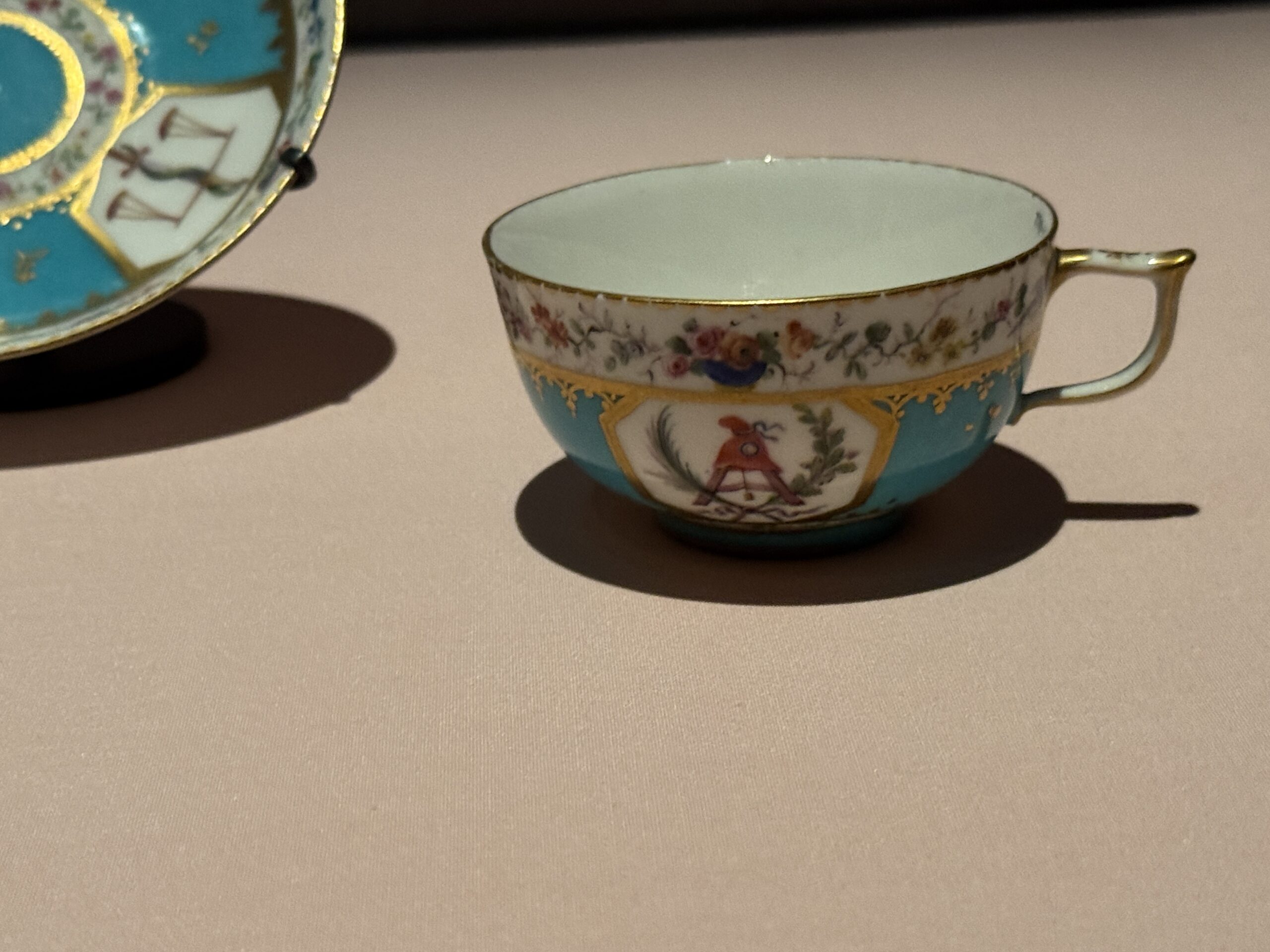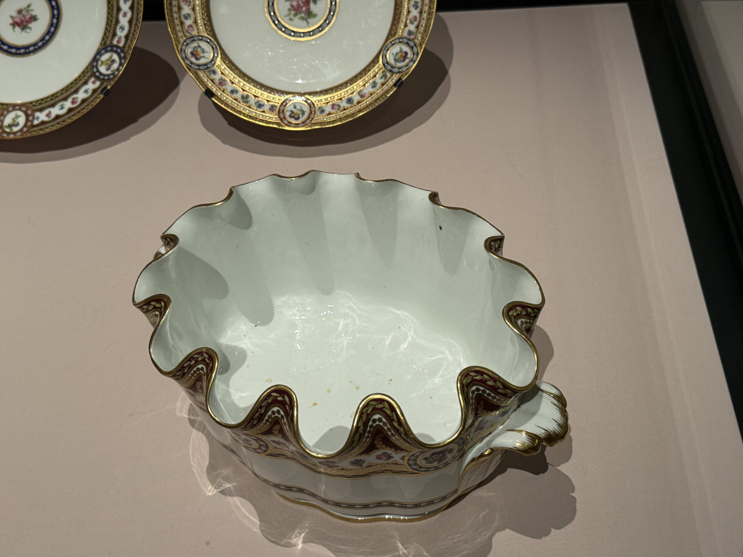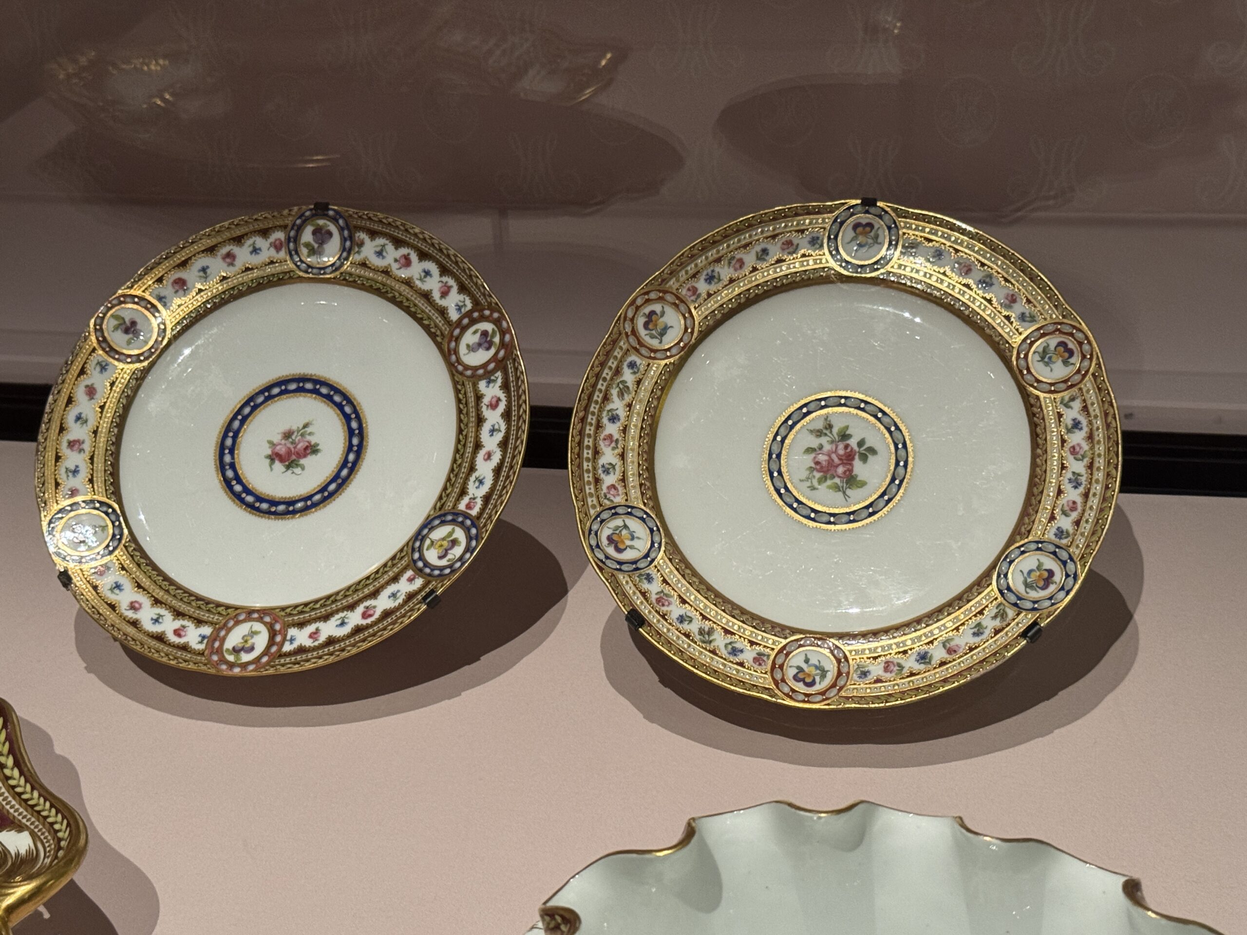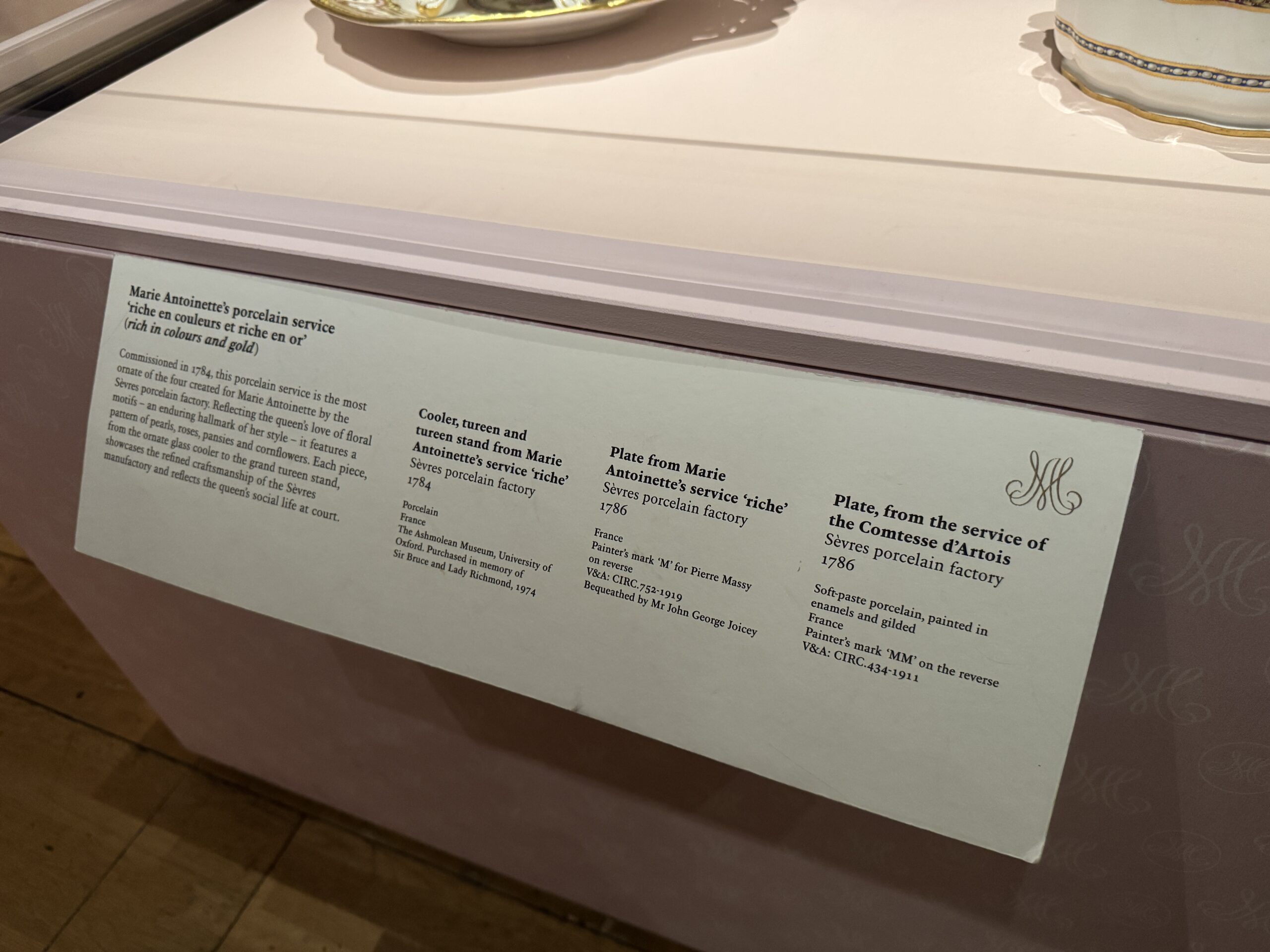 Тарелка от Мари. «Богатый» уровень обслуживания Антуанетты. Фарфоровая фабрика Севр, 1786. Франция На оборотной стороне — клеймо художника «М», обозначающее Пьера Масси. Музей Виктории и Альберта. Завещано мистером Джоном Джорджем Джойси.