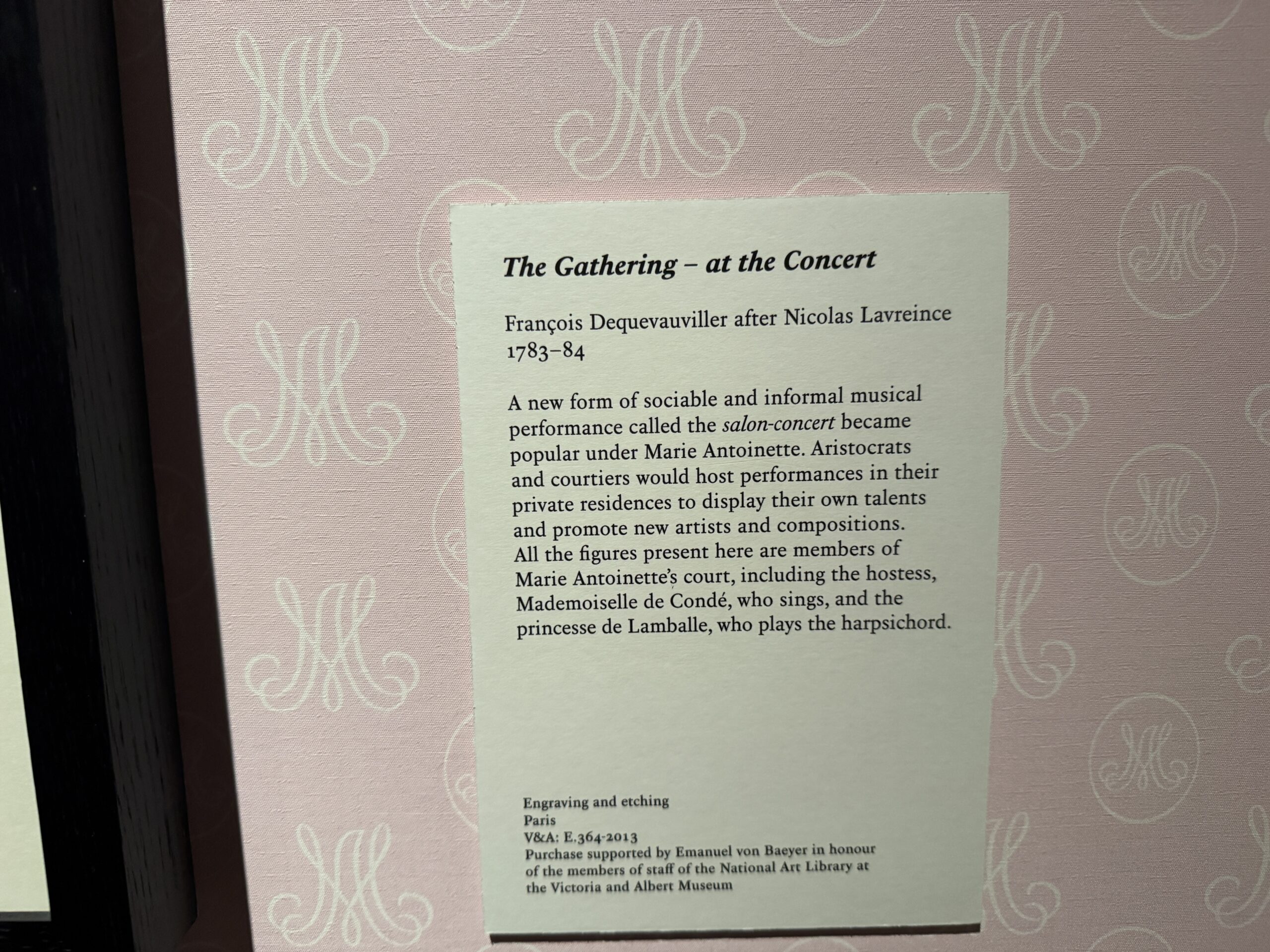При Марии-Антуанетте стала популярна новая форма светских и неформальных музыкальных выступлений, получившая название салон-концерт. Аристократы и придворные устраивали представления в своих частных резиденциях, чтобы продемонстрировать свои таланты и продвинуть новых артистов и композиторов. Все представленные здесь фигуры — члены двора Марии-Антуанетты, включая хозяйку, мадемуазель де Конде, которая поет, и принцессу де Ламбаль, играющую на клавесине.