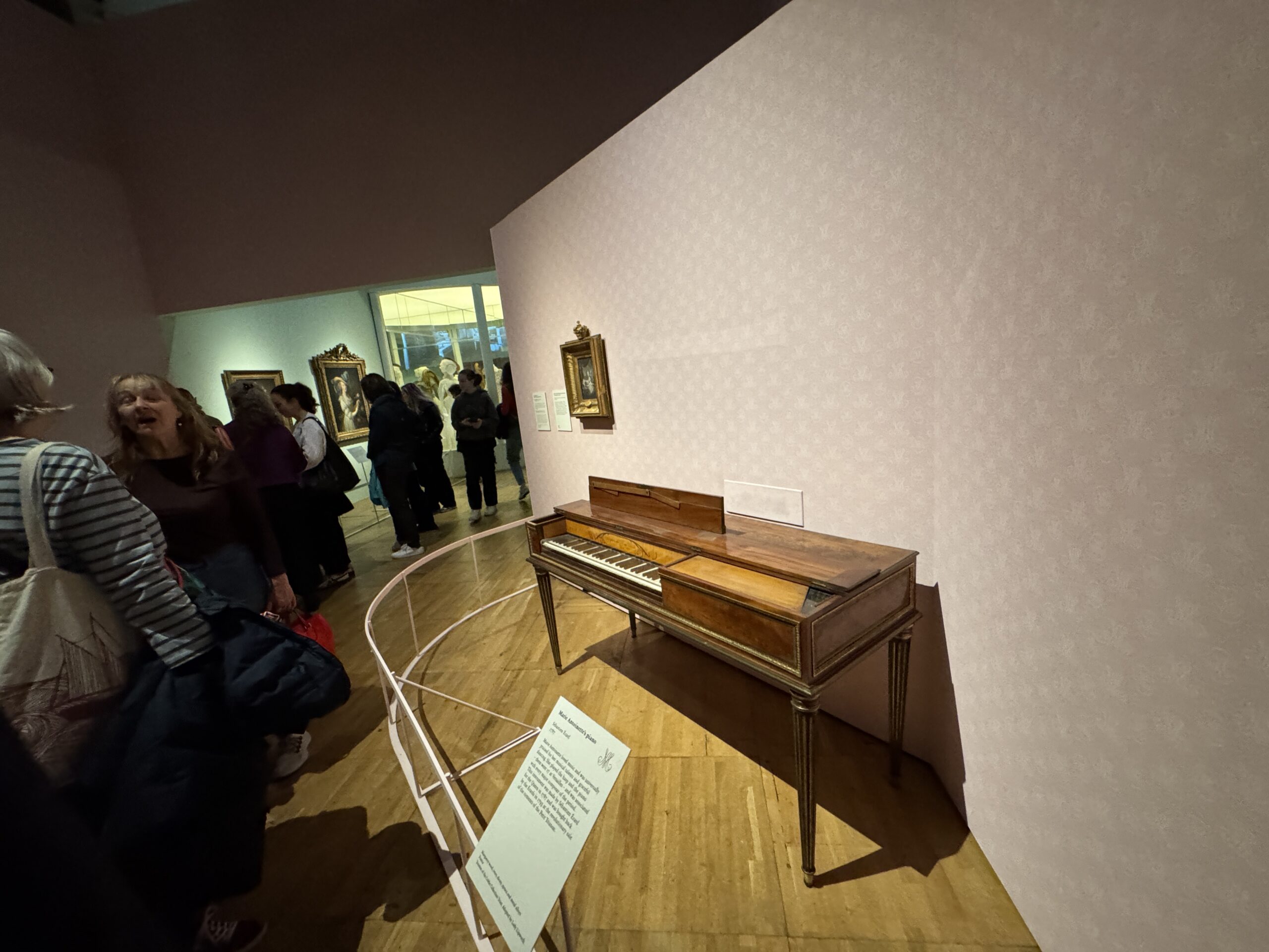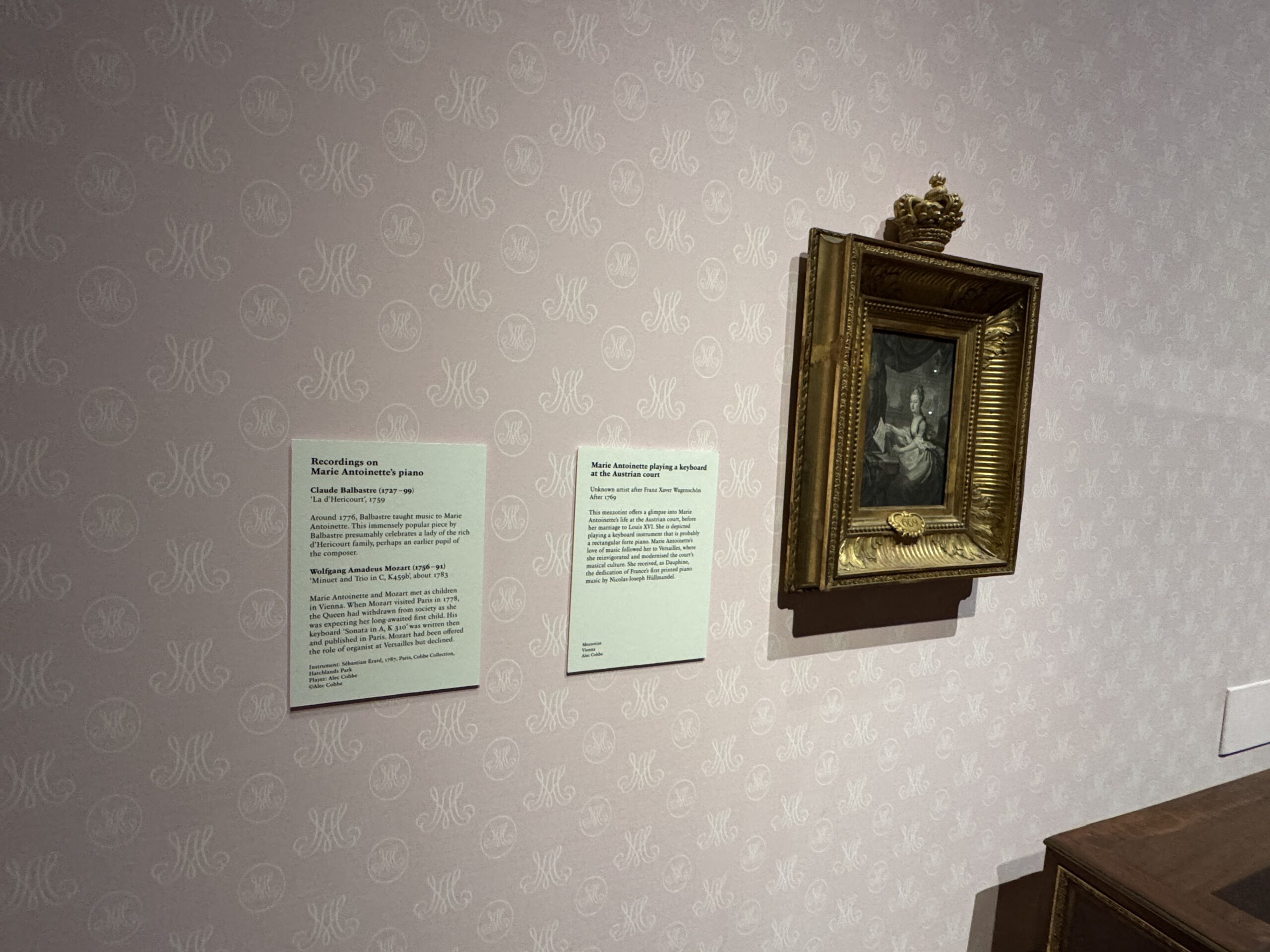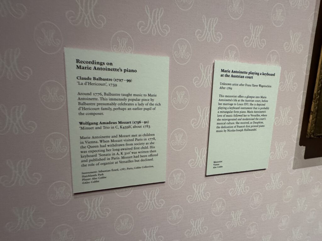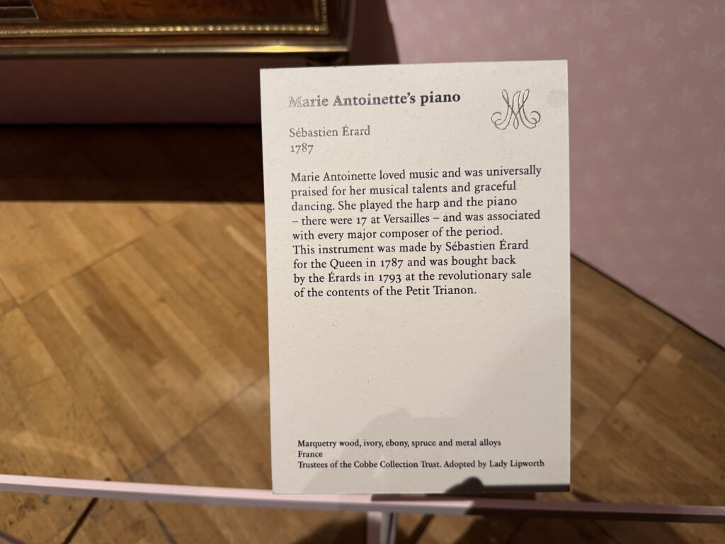 Мария-Антуанетта любила музыку и пользовалась всеобщим признанием за свой музыкальный талант и изящные танцы. Она играла на арфе и фортепиано (всего их было 17 в Версале) и была связана со всеми крупными композиторами того времени. Этот инструмент был изготовлен Себастьяном Эраром для королевы в 1787 году и выкуплен Эрарами в 1793 году на революционной распродаже содержимого Малого Трианона.