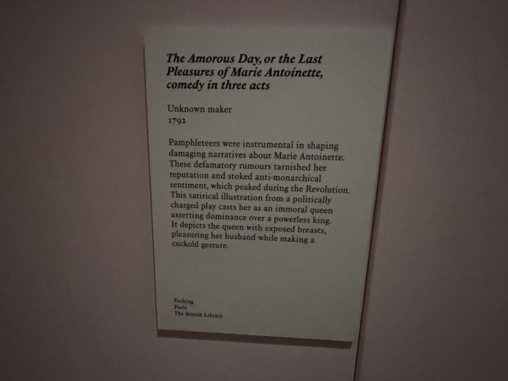 Рассказчики памфлетов сыграли решающую роль в формировании порочных представлений о Марии-Антуанетте. Эти клеветнические слухи запятнали её репутацию и разжегли антимонархические настроения, достигшие своего пика во время революции. Эта сатирическая иллюстрация из политически окрашенной пьесы изображает её как аморальную королеву, утверждающую своё господство над бессильным королём. На ней королева изображена с обнажённой грудью, доставляющая удовольствие своему мужу. Одновременно она делает жест «рожки», намекая на супружескую измену.