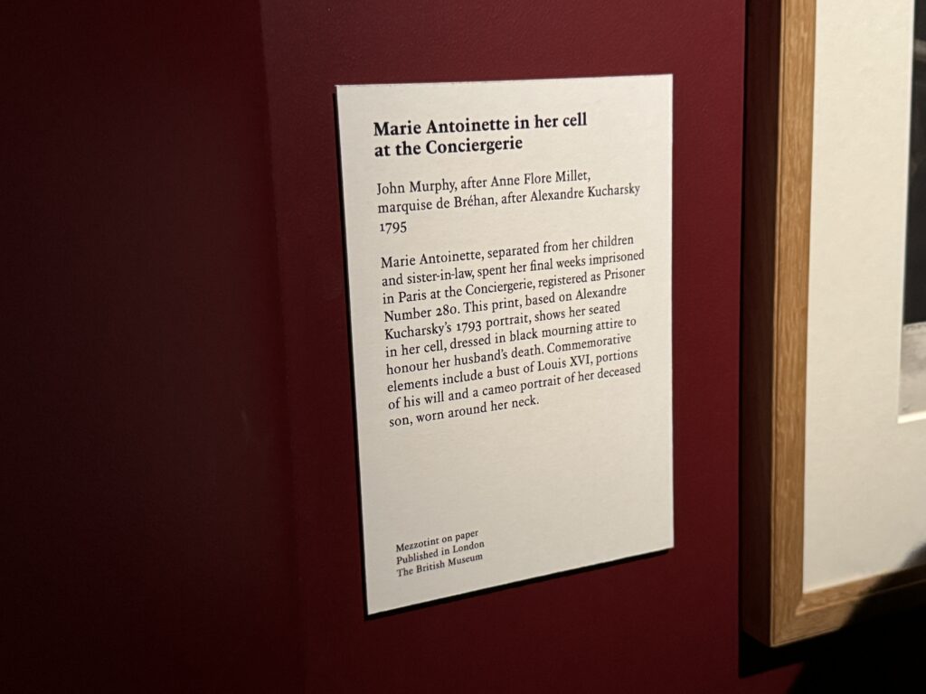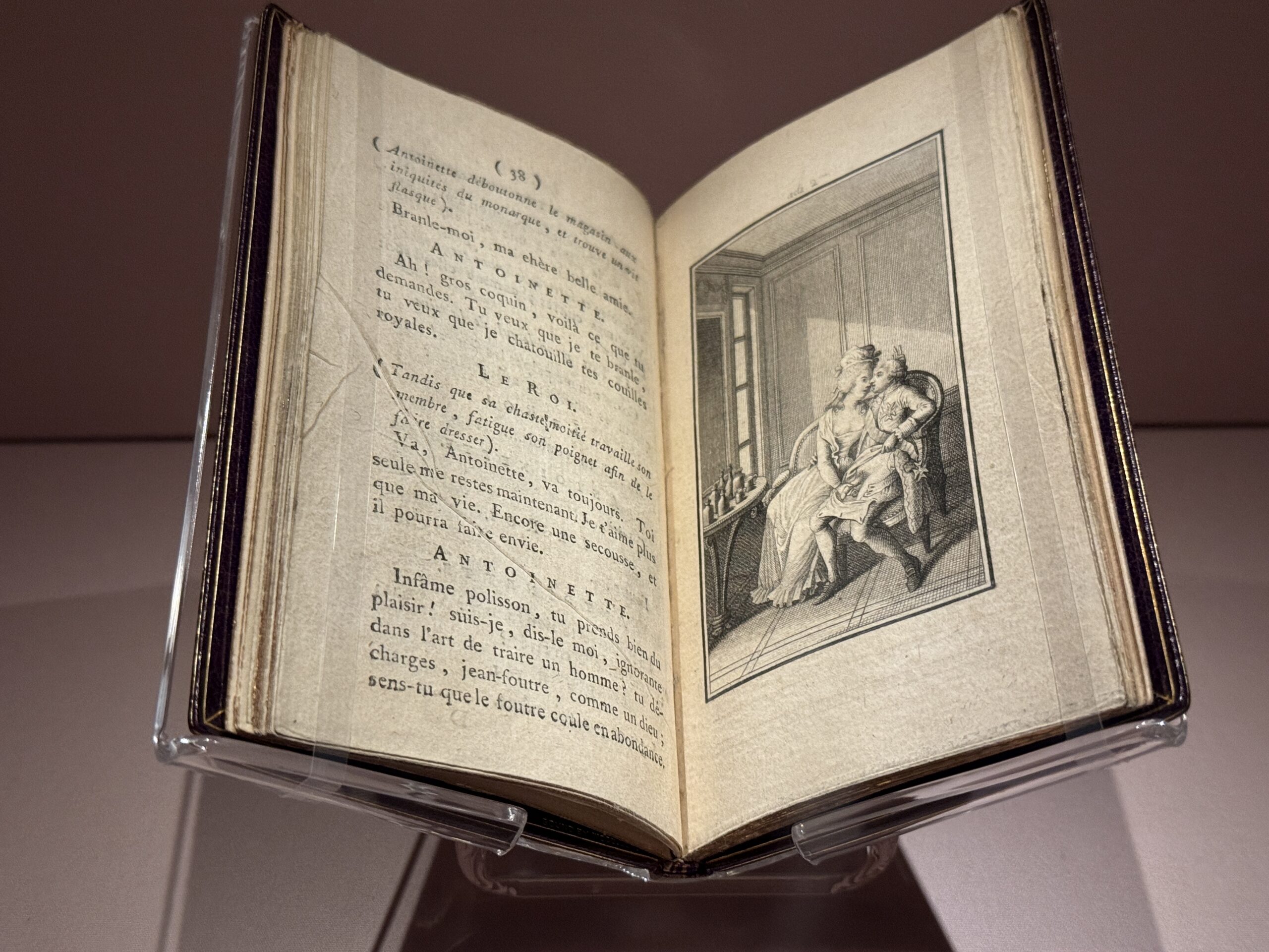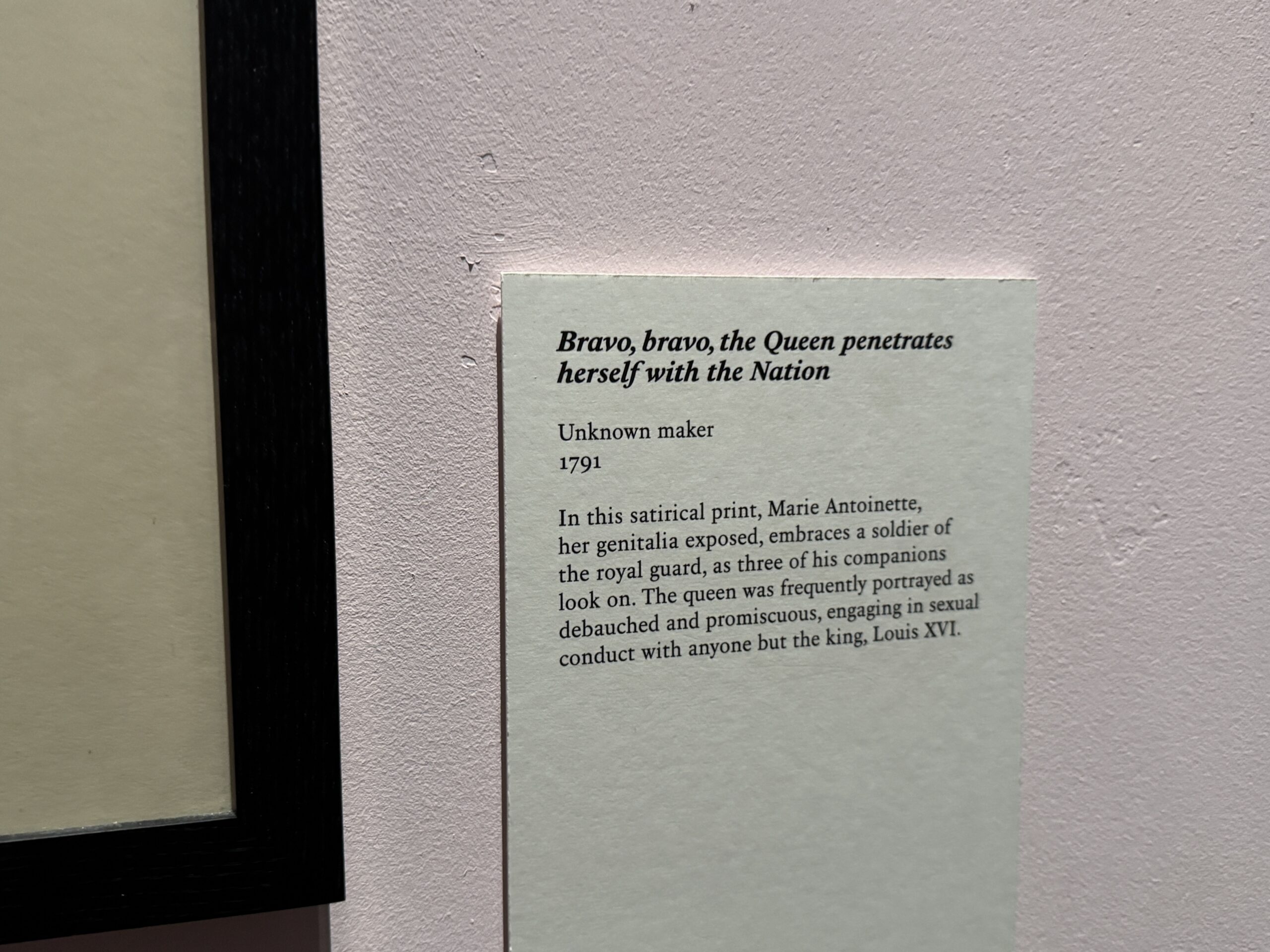 На этой сатирической гравюре Мария-Антуанетта, с обнаженными гениталиями, обнимает солдата королевской гвардии, в то время как трое его спутников наблюдают за происходящим. Королеву часто изображали распутной и неразборчивой в сексуальных отношениях, вступавшей в связь с кем угодно, кроме короля Людовика XVI.»
