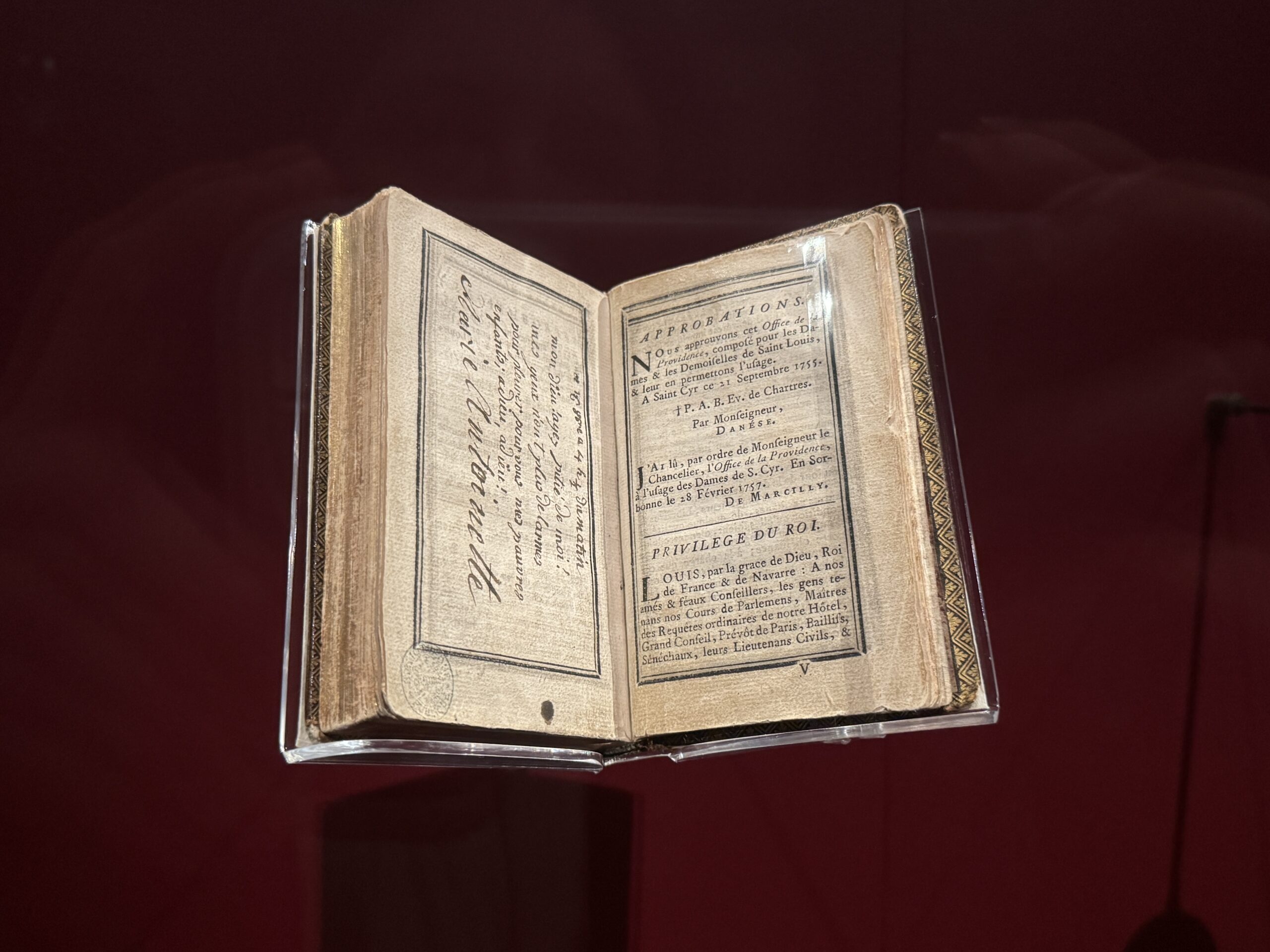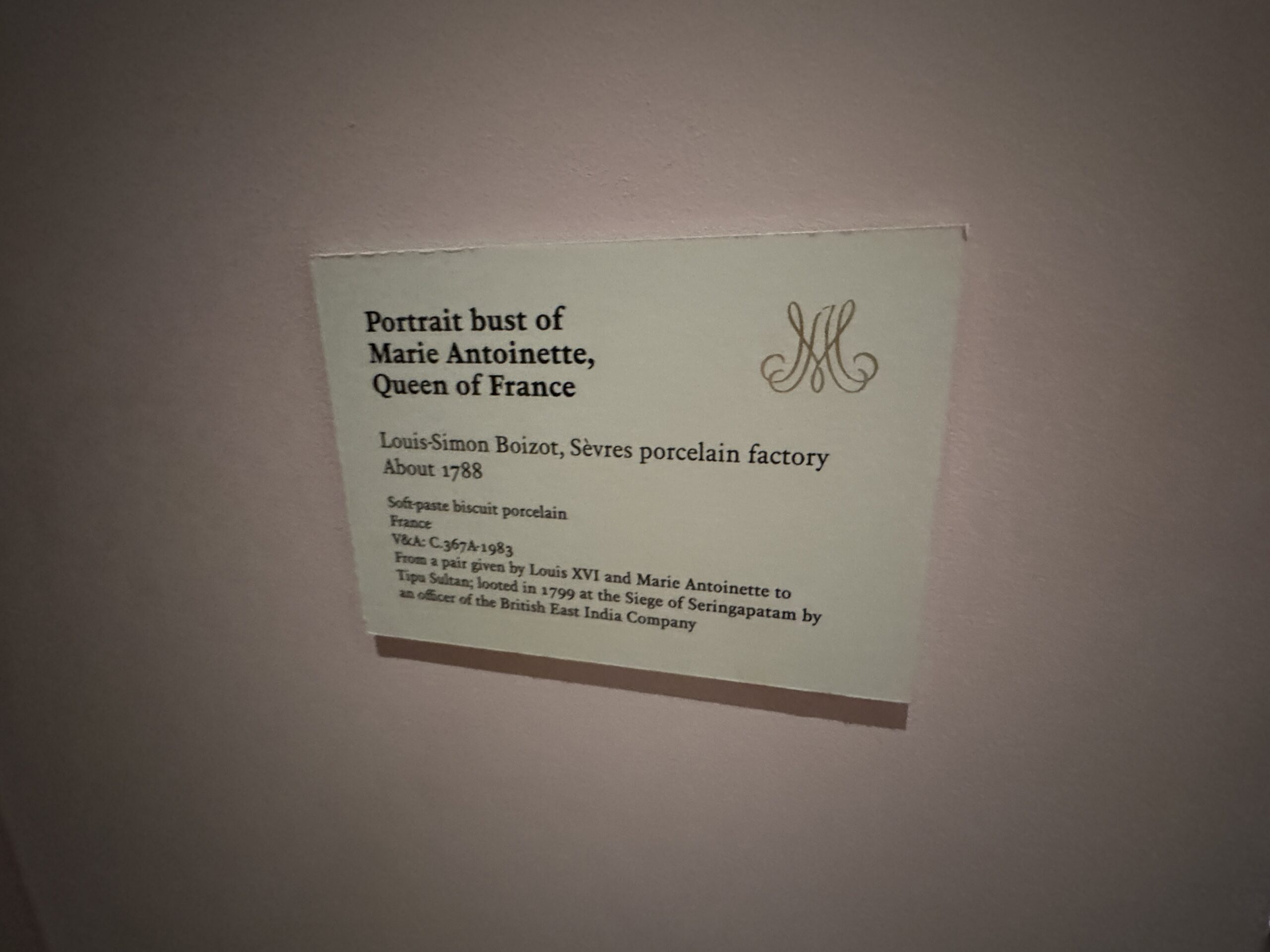 Подаренна Людовиком XVI и Марией-Антуанеттой Типу Султану; украдена в 1799 году во время осады Серингапатама офицером Британской Ост-Индской компании.»