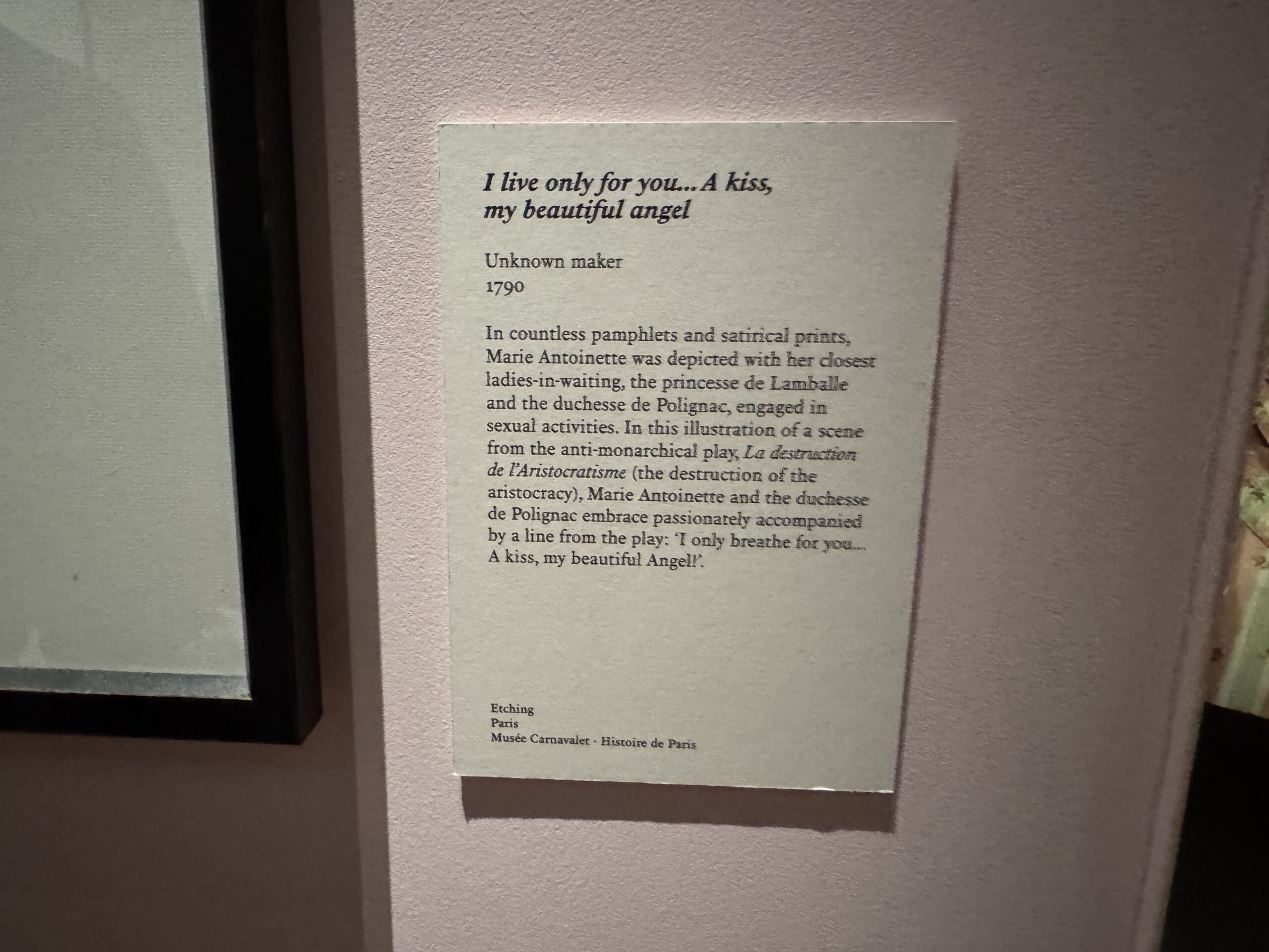 В бесчисленных брошюрах и сатирических гравюрах Мария-Антуанетта изображалась со своими ближайшими фрейлинами, принцессой де Ламбаль и герцогиней де Полиньяк, занимающимися сексуальными действиями. На этой иллюстрации сцены из антимонархической пьесы «Разрушение аристократии» Мария-Антуанетта и герцогиня де Полиньяк страстно обнимаются, и всё это сопровождается строкой из пьесы: «Я дышу только для тебя… Поцелуй, мой прекрасный ангел!».