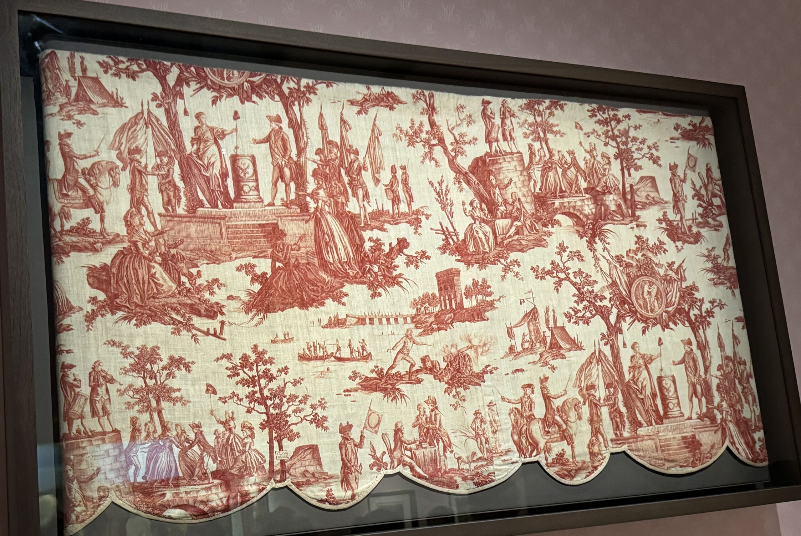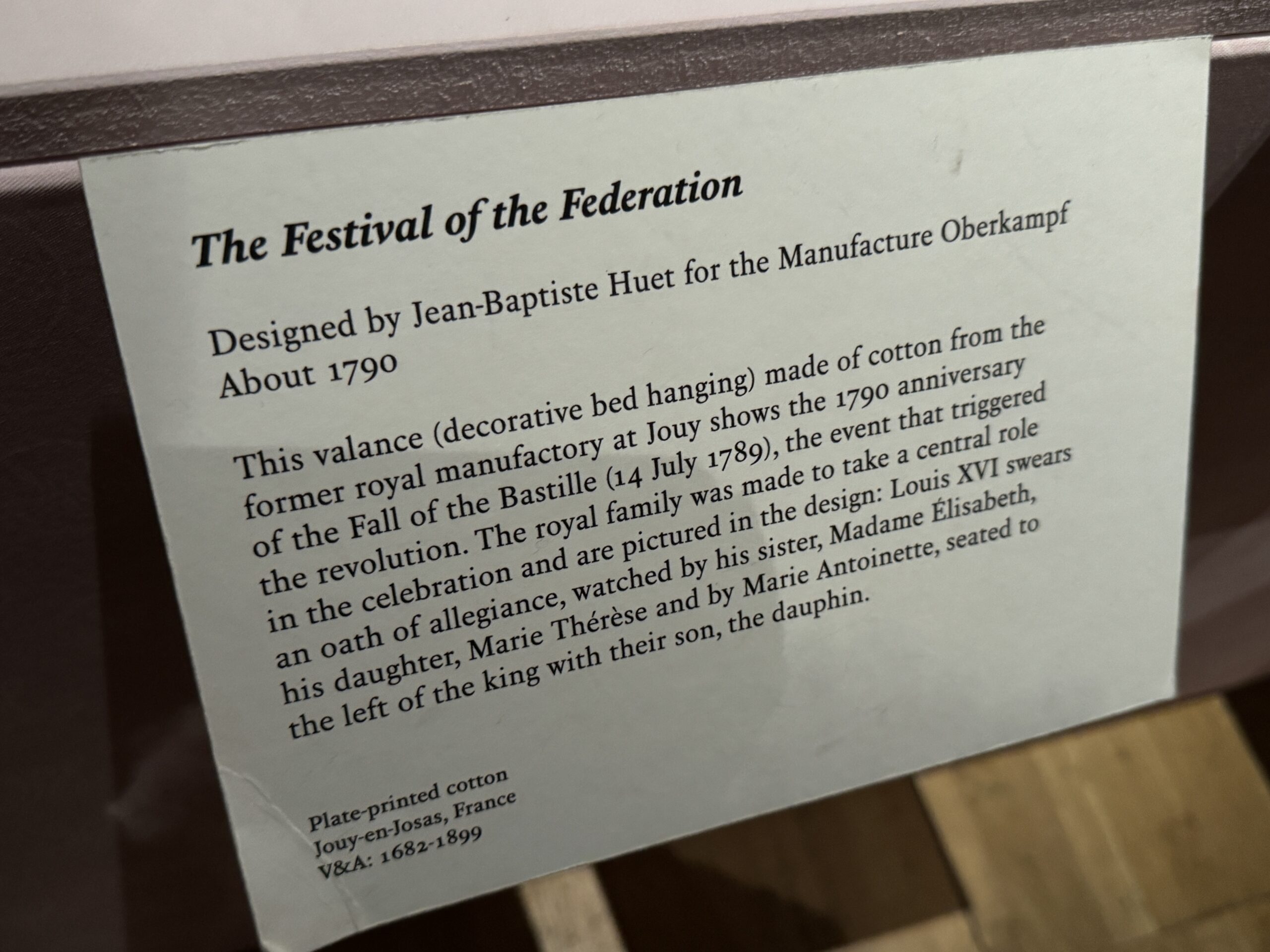 Эта декоративная занавеска для кровати, изготовленная из хлопка на бывшей королевской мануфактуре в Жуи, посвящена 1790-й годовщине падения Бастилии (14 июля 1789 года), события, положившего начало революции. Королевская семья играла центральную роль в торжествах и изображена на занавеске: Людовик XVI приносит присягу на верность в присутствии своей сестры, мадам Елизаветы, дочери, Марии Терезы, и Марии-Антуанетты, сидящей слева от короля со своим сыном, дофином.