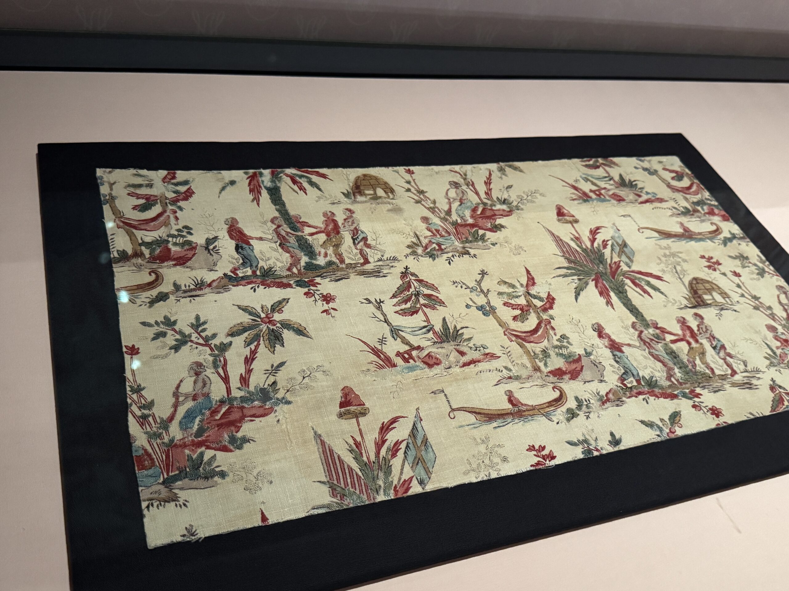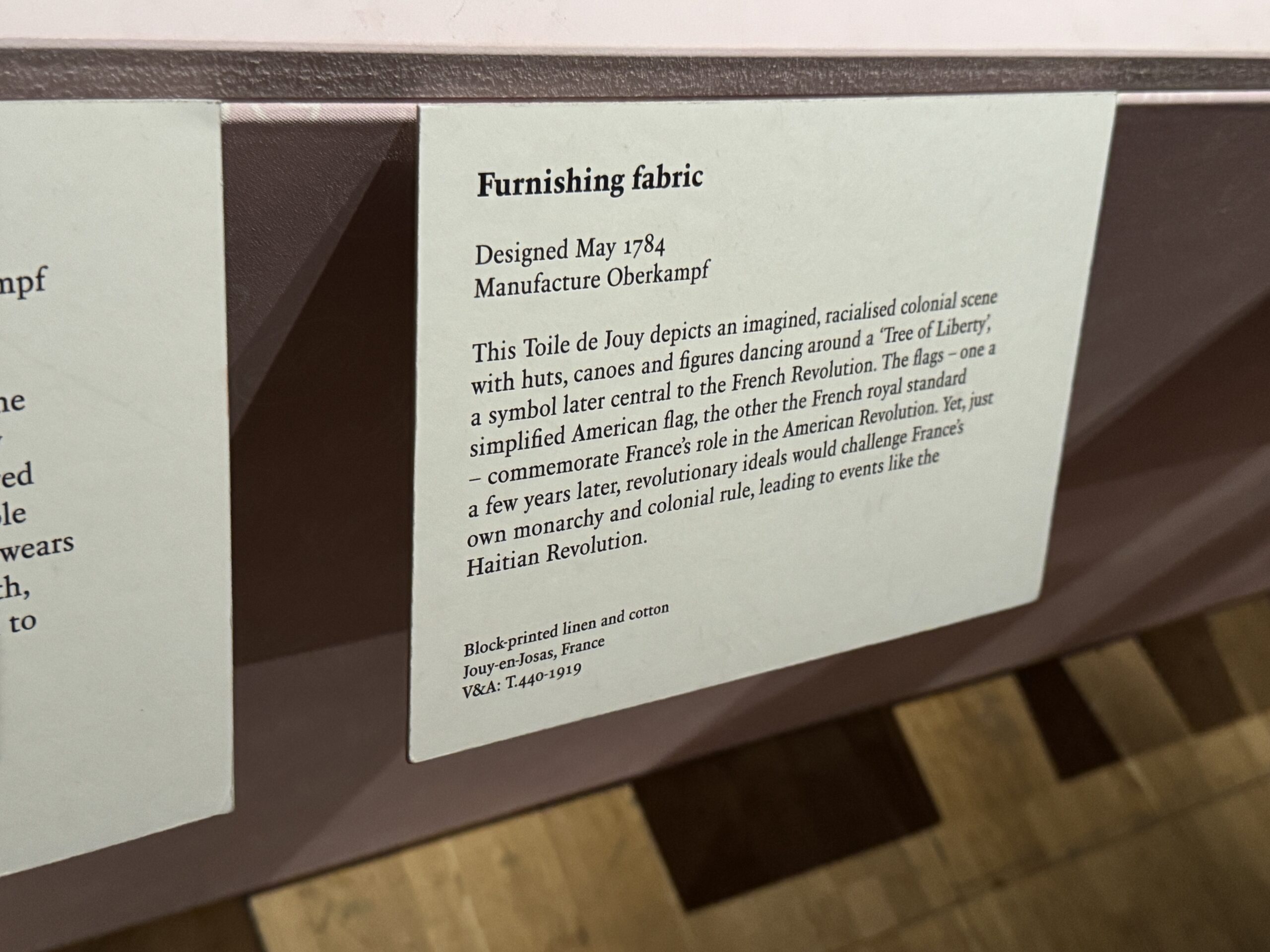 Глазурованный хлопок с блочным принтом, мануфактура Оберкампф, Франция, Музей Туаль де Жуи. Шелк и муслин с тамбурным узором, Франция Музей Виктории и Альберта.»