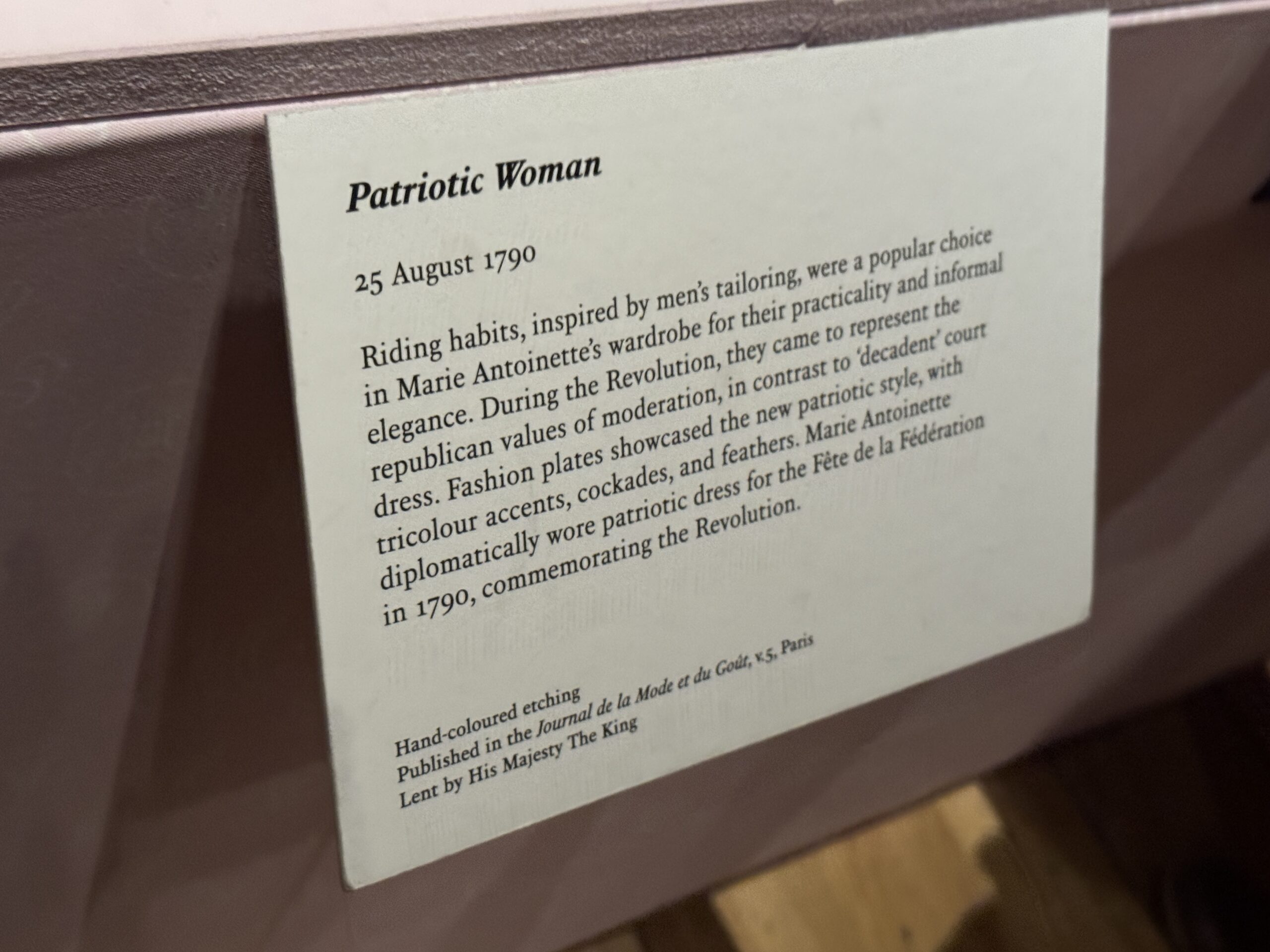 Костюмы для верховой езды, созданные по образцу мужских костюмов, были популярным выбором в гардеробе Марии-Антуанетты благодаря своей практичности и неформальной элегантности. Во время революции они стали символом республиканских ценностей умеренности, в отличие от «декадентской» придворной одежды. Модные иллюстрации демонстрировали новый патриотический стиль с триколорами, кокардами и перьями. Мария-Антуанетта дипломатично надела патриотический наряд на Праздник Федерации в 1790 году, посвященный революции.