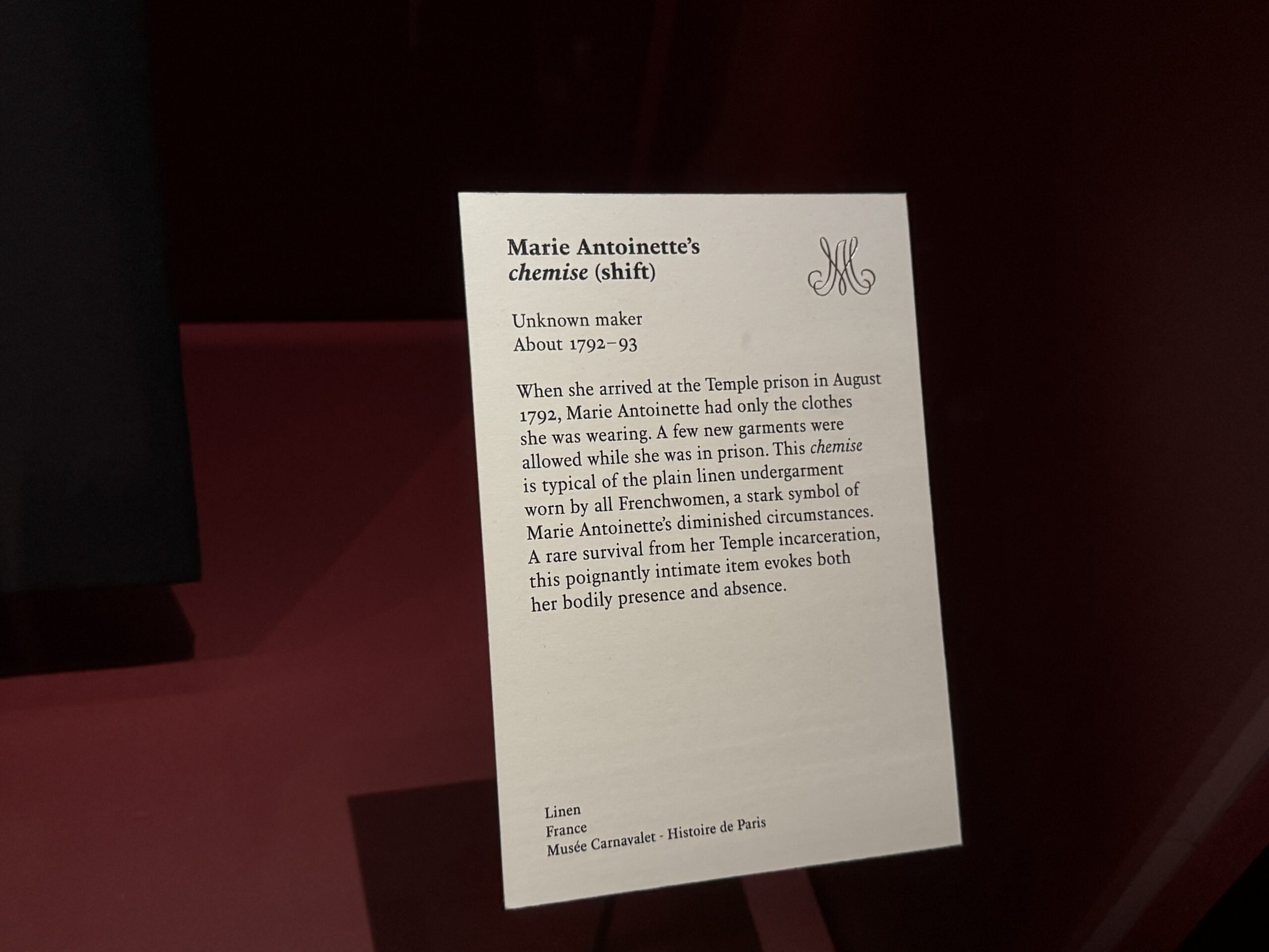 Это одно из двух сохранившихся платьев-рубашек из муслина времён Марии-Антуанетты, стиль, популяризации которого королева способствовала. В своих мемуарах мадам Кампан описывала королеву и её подруг летом 1778 года, одетых в «муслиновые платья с большими соломенными шляпами и муслиновыми вуалями — костюм, повсеместно принятый женщинами в то время». Королева также носила муслиновое платье, подаренное ей Типу Султаном в 1788 году.