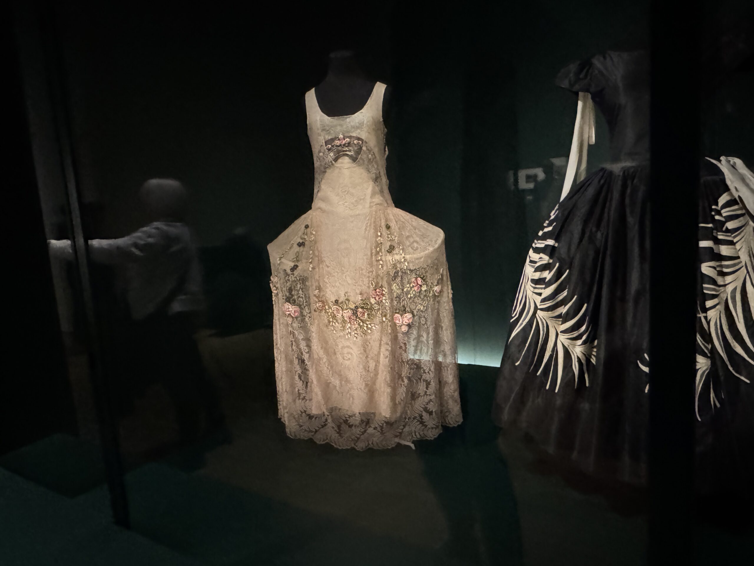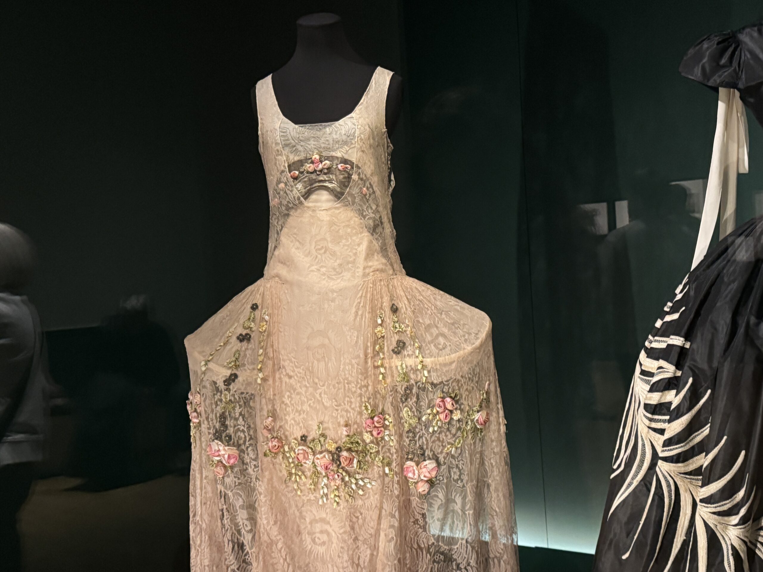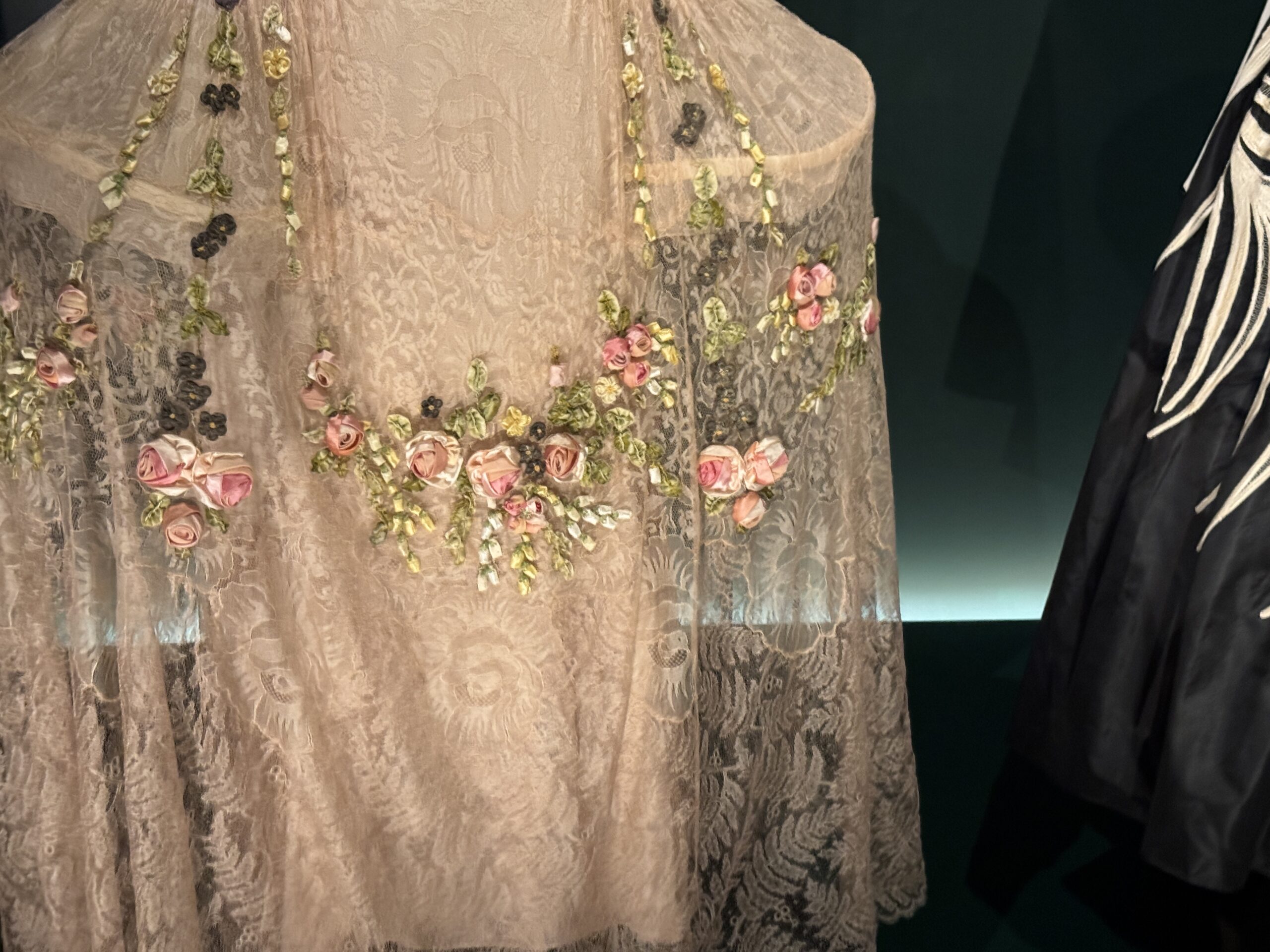 Кружево и шелковый шифон, аппликация из шелковых лент в виде цветов и листьев, панель из парчи и вышивка серебряным шнуром. Париж.
