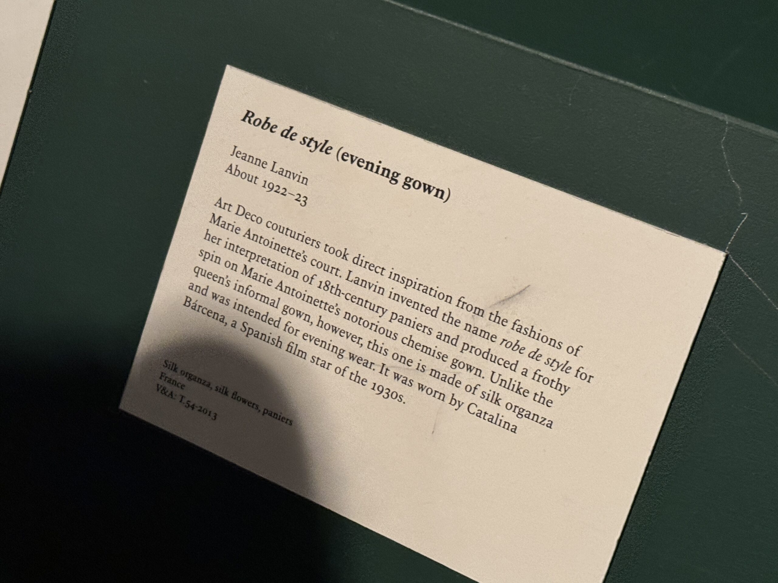 Модельеры в стиле ар-деко черпали вдохновение непосредственно из моды двора Марии-Антуанетты. Ланвен придумала название robe de style для своей интерпретации панье XVIII века и создала пышную версию знаменитого платья-рубашки Марии-Антуанетты. Однако, в отличие от неформального платья королевы, это платье сшито из шелковой органзы и предназначалось для вечерних выходов. Его носила Каталина Барсена, испанская кинозвезда 1930-х годов.