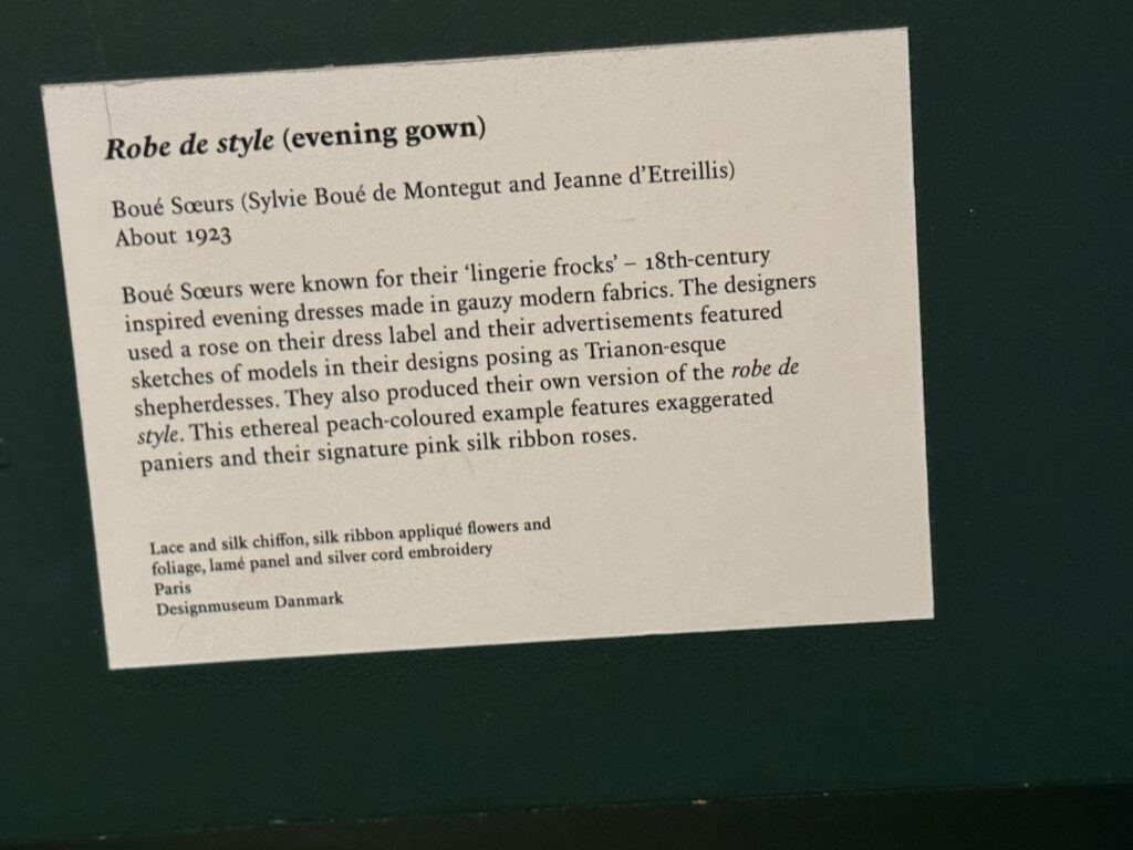 Компания Boué Sœurs была известна своими «платьями-нижним бельем» — вечерними платьями в стиле XVIII века, сшитыми из легких современных тканей. Дизайнеры использовали изображение розы на этикетке платья, а в их рекламе были представлены эскизы моделей в их нарядах, изображающих пастушок в стиле Трианона. Они также выпускали свою собственную версию платья в стиле robe de style. Этот воздушный персиковый образец отличается преувеличенно большими панье и фирменными розовыми шелковыми лентами с розами.