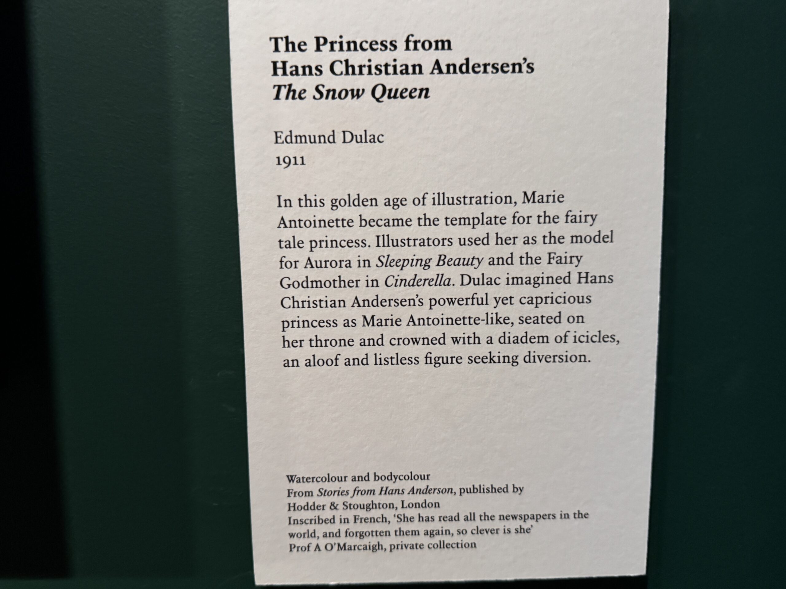 Акварель и гуашь. Из сборника «Рассказы Ганса Андерсена», издательство Hodder & Stoughton, Лондон. Надпись на французском языке: «Она прочитала все газеты мира и снова все забыла, такая она умная». Профессор А. О’Маркай, частная коллекция.»