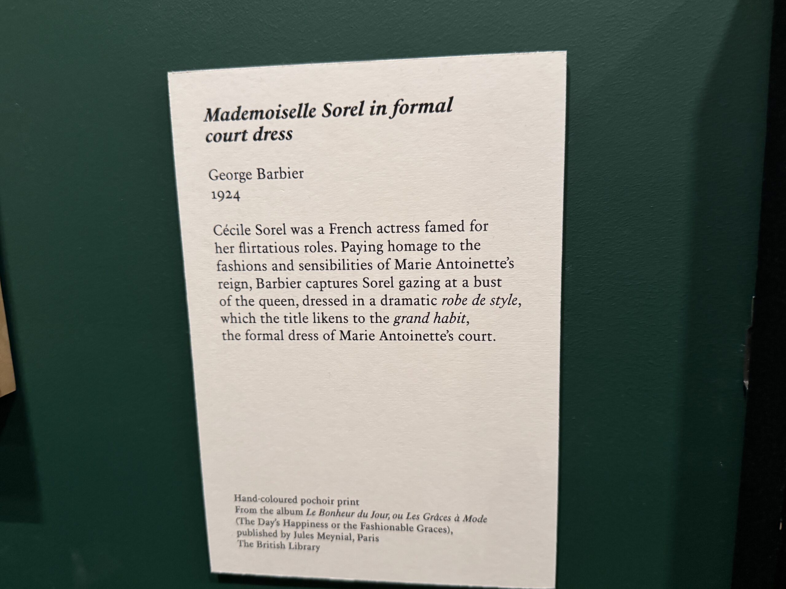 Сесиль Сорель была французской актрисой, прославившейся своими кокетливыми ролями. Отдавая дань моде и вкусам эпохи правления Марии-Антуанетты, Барбье изображает Сорель, смотрящую на бюст королевы, одетой в эффектное платье в стиле робе де стиль, которое в названии картины сравнивается с величественным одеянием, парадным нарядом двора Марии-Антуанетты.