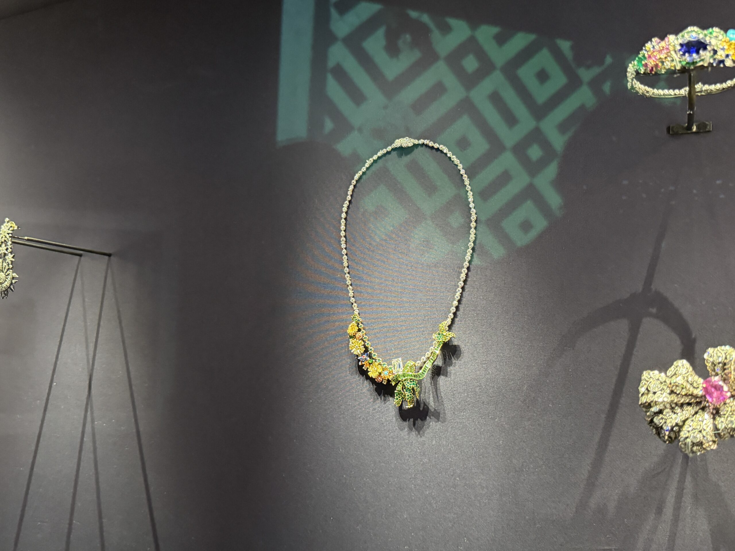 «Загородные удовольствия» Колье (Деревенское удовольствие) из коллекции Dior à Versailles, Côté Jardins, Виктория де Кастеллан для Кристиана Диор, 2017 18-каратное желтое, белое и розовое золото, бриллианты, цаворитовые гранаты, изумруды, желтые бриллианты, спессартитовые гранаты, бирюза и сапфиры. Париж. Ювелирные изделия Диор.