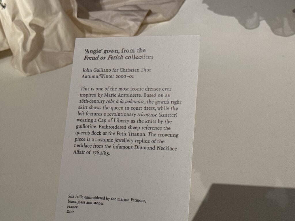 Это одно из самых культовых платьев, созданных по образу и подобию Марии-Антуанетты. Основанное на полонезе XVIII века, правое подол платья изображает королеву в придворном наряде, а левое – революционную трикотажщицу в шапке Свободы, вяжущую у гильотины. Вышитые овечки отсылают к стаду королевы в Малом Трианоне. Венцом платья является бижутерная копия ожерелья из печально известного дела о бриллиантовом ожерелье 1784/85 годов.