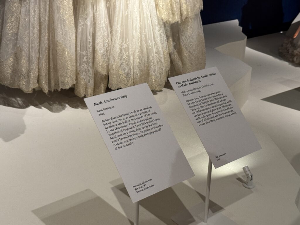 Для актрисы Эмилии Шюле, исполняющей роль Марии Антуанетты в сериале Banijay «Мария-Антуанетта» (2023-2025), кутюрное бюро Christian Dior создало два платья. Швеи и мастера Dior используют традиционные техники ручного шитья, которые были бы вполне уместны в мире королевы XVIII века. Это платье с изящными ярусами шелка, отделанными кружевом, можно увидеть в сцене, где Мария-Антуанетта посещает вечеринку.