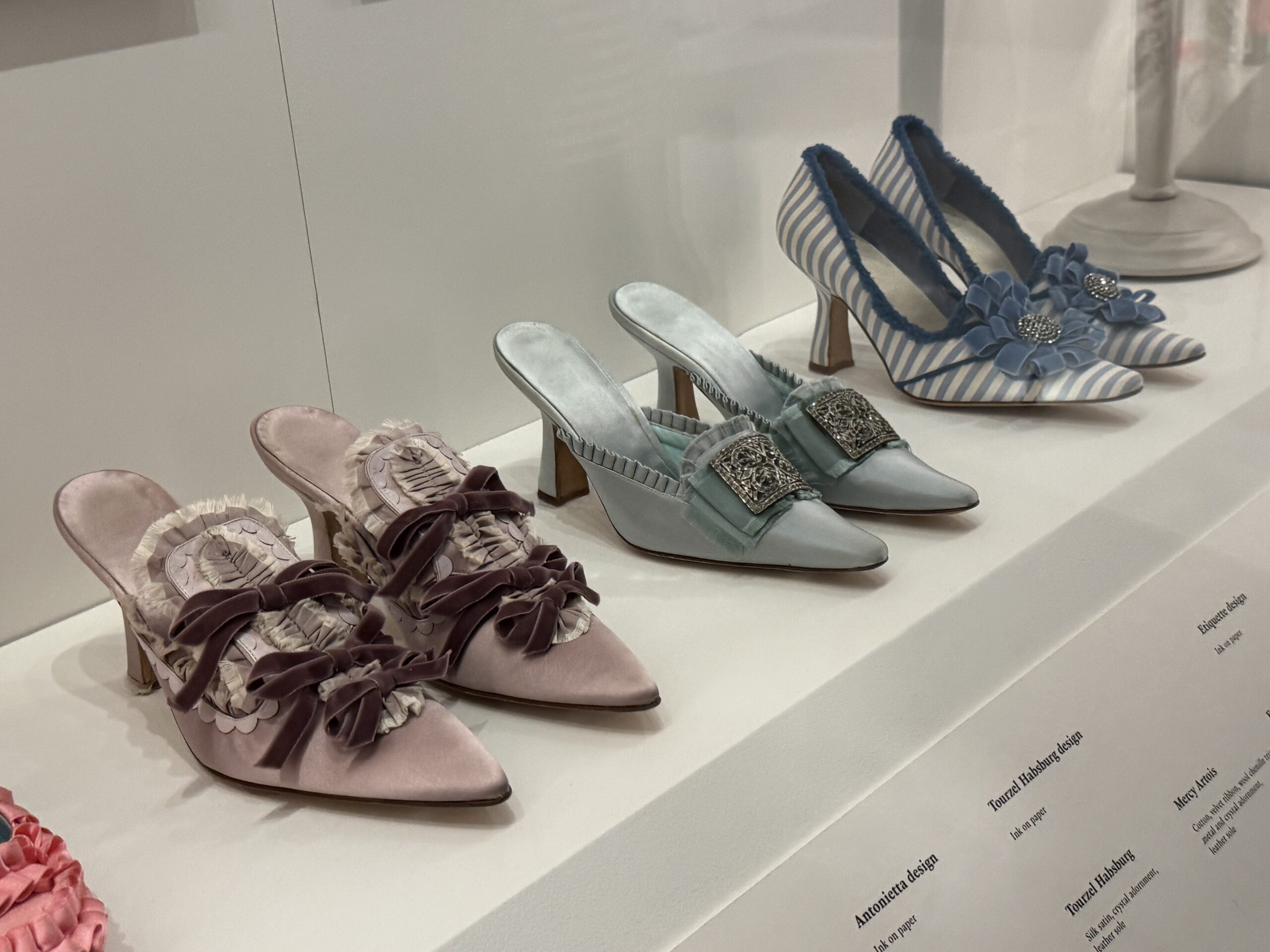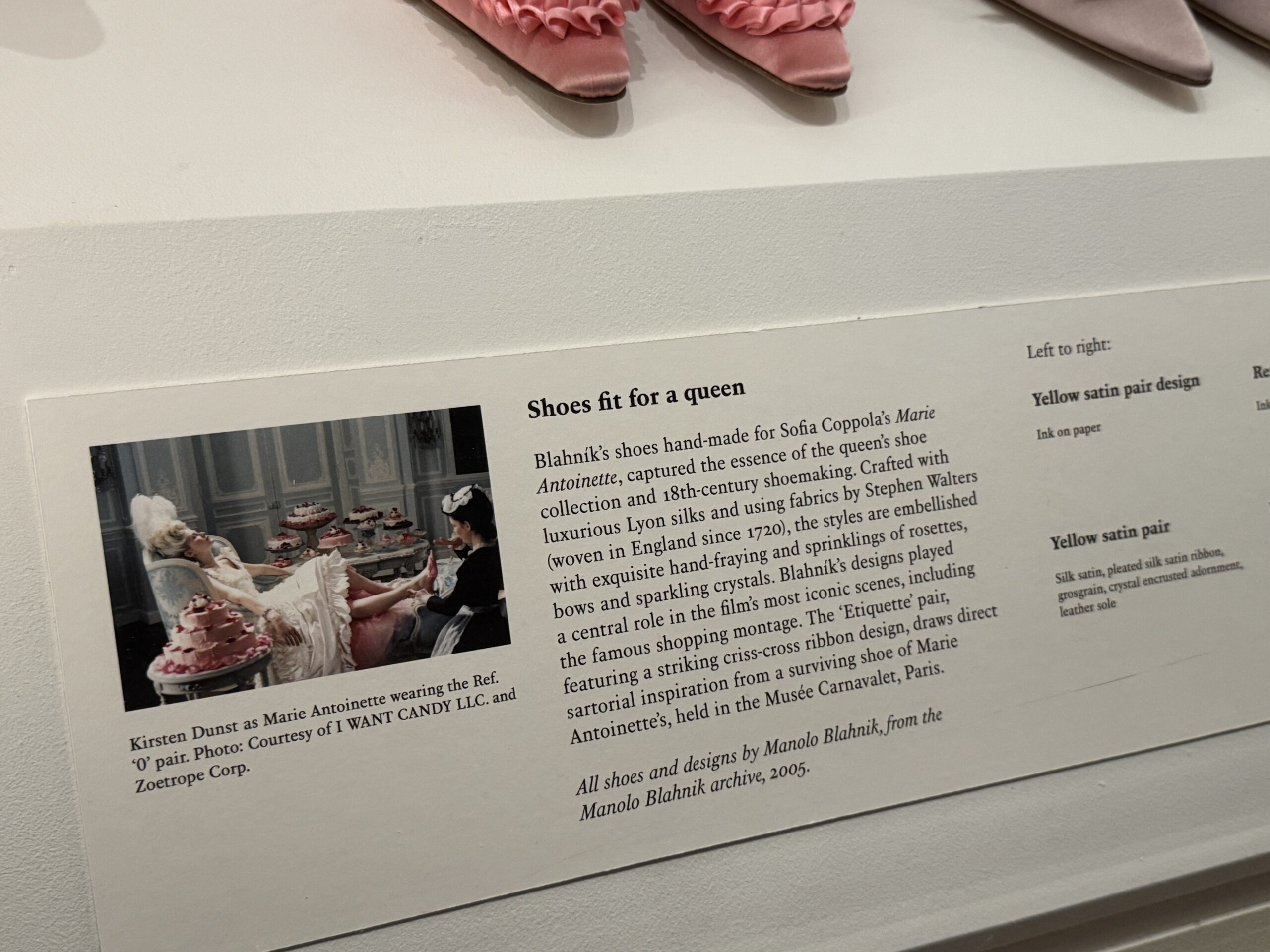 «Туфли, достойные королевы. Кирстен Данст в образе Марии-Антуанетты. Туфли Бланик, созданные вручную для фильма Софии Копполы «Мария-Антуанетта», воплотили в себе суть коллекции обуви королевы и традиции обувного дела XVIII века. Изготовленные из роскошного лионского шелка и тканей Стивена Уолтерса (тканых в Англии с 1720 года), эти модели украшены изысканной ручной бахромой и вкраплениями розеток, бантов и сверкающих кристаллов. Дизайн Бланика сыграл центральную роль в самых знаковых сценах фильма, включая знаменитый эпизод с покупками. Пара туфель «Этикет», отличающаяся эффектным узором из перекрещивающихся лент, напрямую вдохновлена сохранившейся туфлей Марии-Антуанетты, хранящейся в музее Карнавале в Париже.
