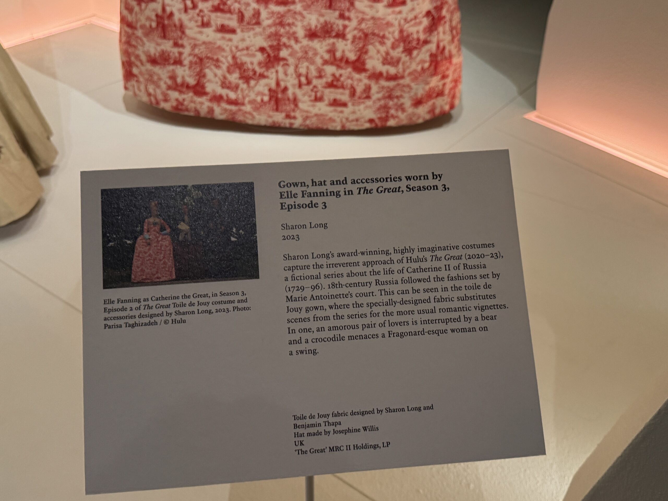 Отмеченные наградами, невероятно оригинальные костюмы Шэрон Лонг отражают дерзкий подход сериала Hulu «Великая» (2020-2023), вымышленного сериала о жизни Екатерины II (1729-1796). Россия XVIII века следовала моде, установленной двором Марии Антуанетты. Это видно в платье из ткани «туаль де Жуи», где специально разработанная ткань заменяет сцены из сериала более привычными романтическими эпизодами. В одном из них влюбленную пару прерывает медведь, а крокодил угрожает женщине в стиле Фрагонара на качелях.»