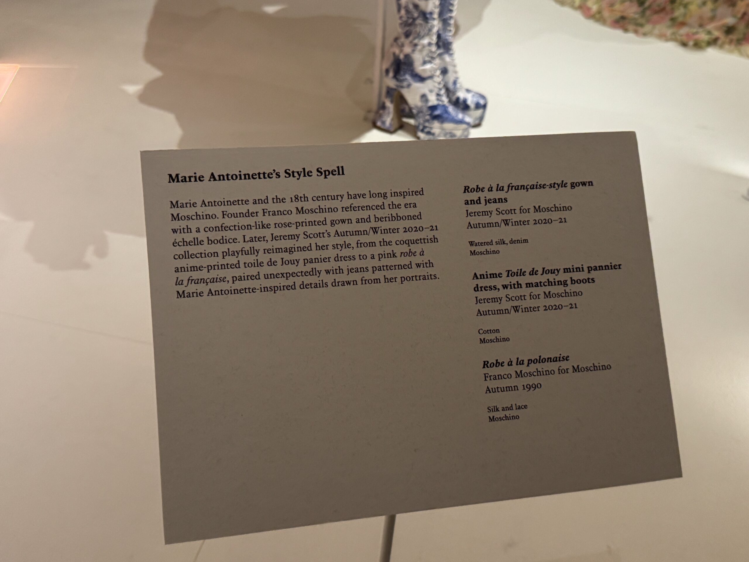 Мария-Антуанетта и XVIII век давно вдохновляют Moschino. Основатель бренда Франко Москино обратился к этой эпохе, создав платье, напоминающее кондитерское изделие, с принтом в виде роз и расшитым лентами лифом-эшелем. Позже, в осенне-зимней коллекции 2020-21 года Джереми Скотт игриво переосмыслил ее стиль: от кокетливого платья-панье из ткани туаль де Жуи с принтом в стиле аниме до розового платья в стиле robe à la française, неожиданно сочетающегося с джинсами, украшенными деталями, вдохновленными Марией-Антуанеттой и взятыми из ее портретов.